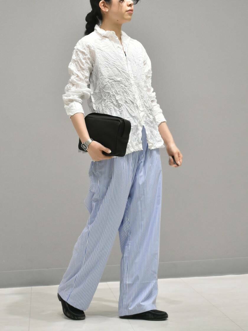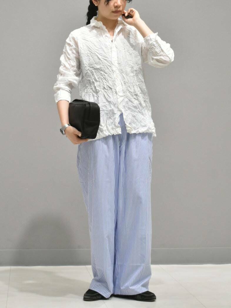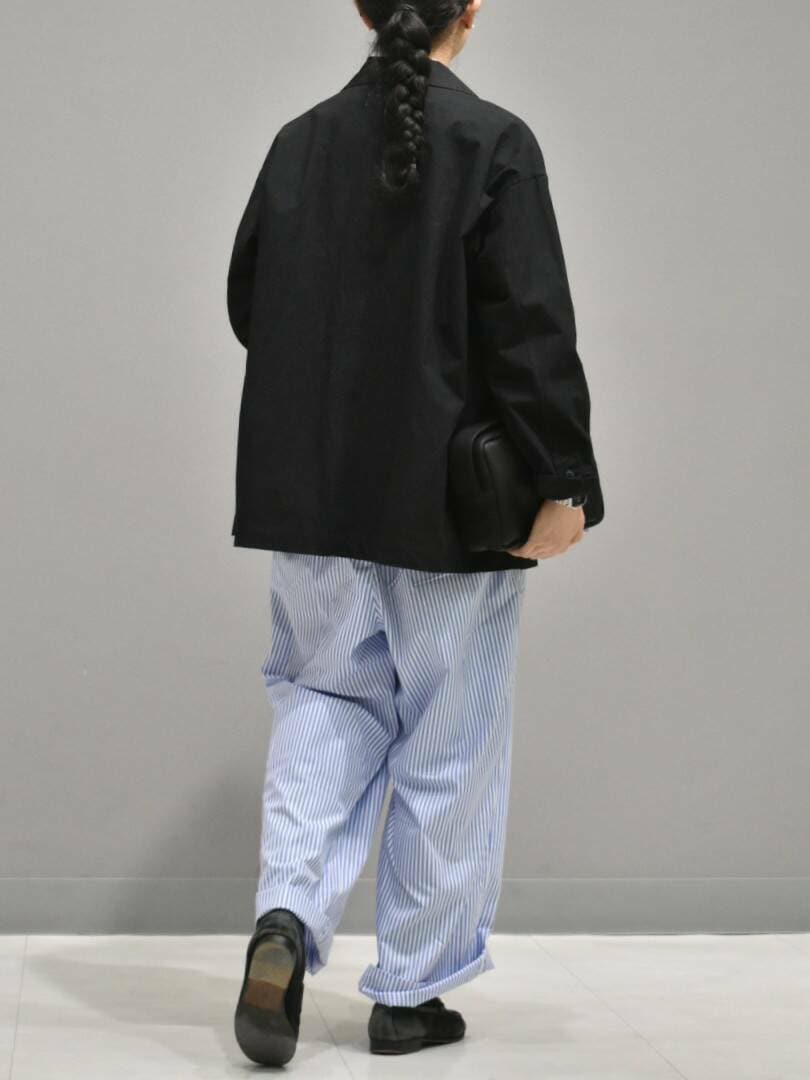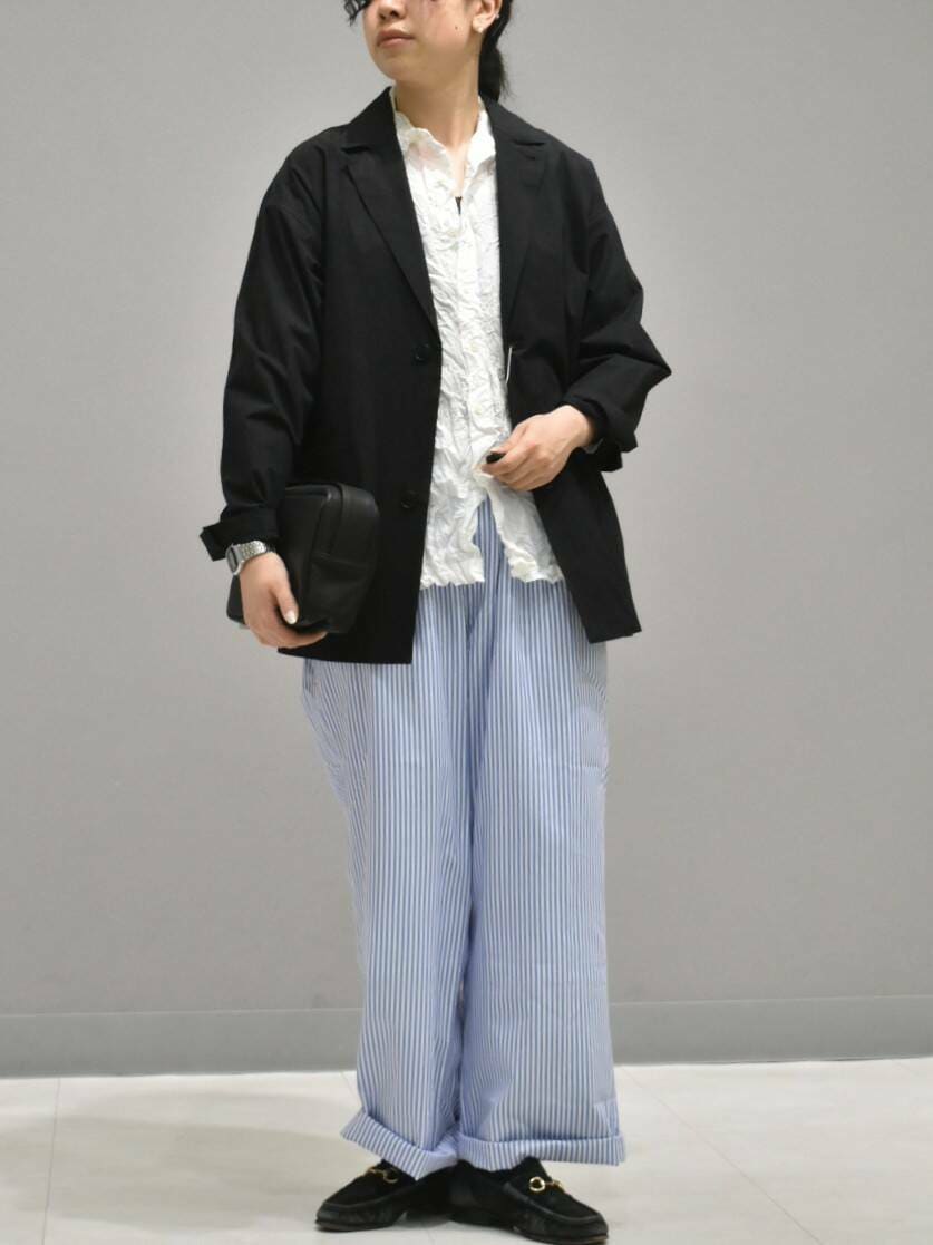 ストライプが印象的なパンツは、コットンポプリン素材で軽くてほんのりと光沢がある上質な雰囲気。