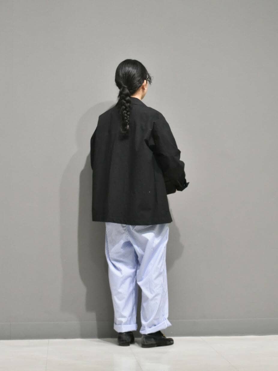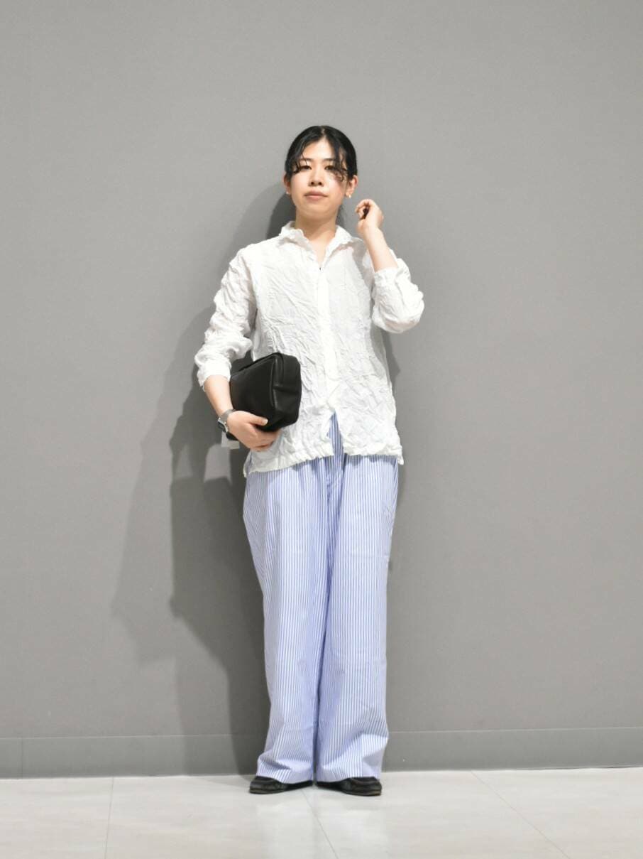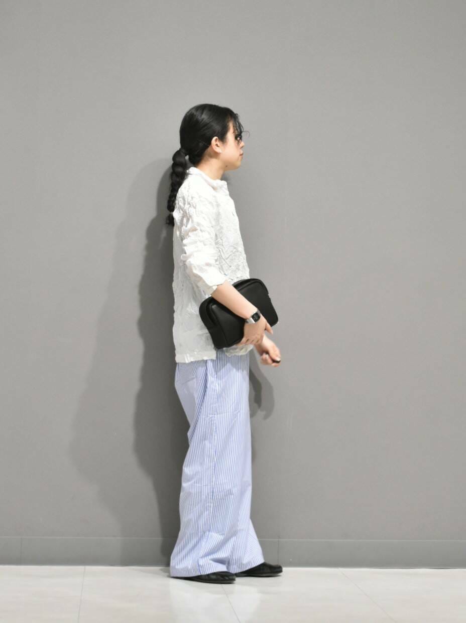 ストライプが印象的なパンツは、コットンポプリン素材で軽くてほんのりと光沢がある上質な雰囲気。