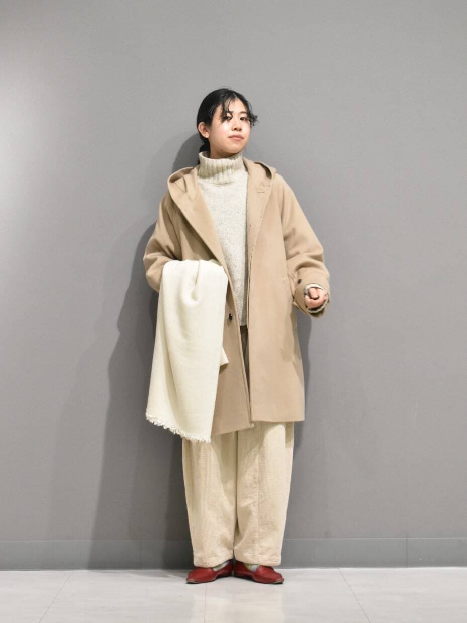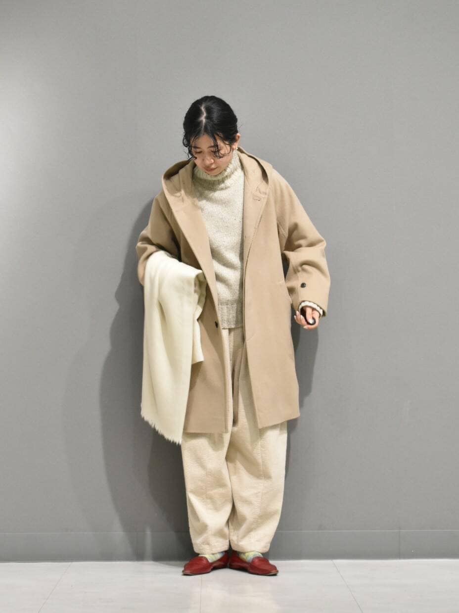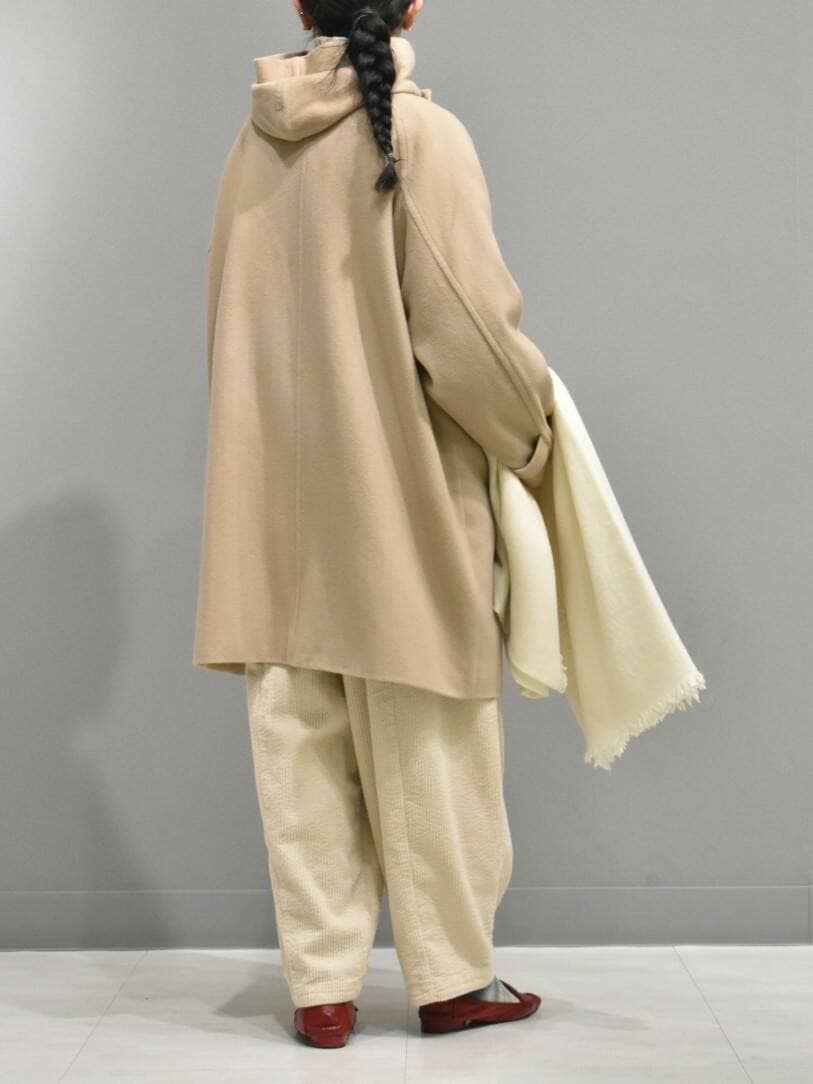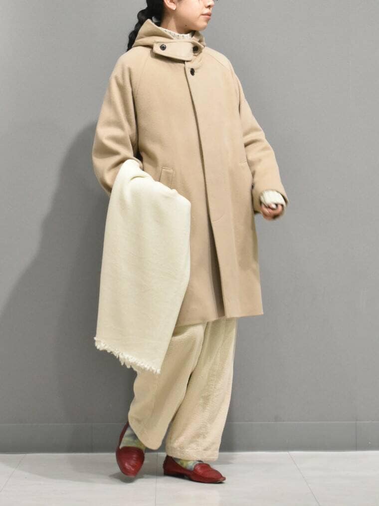 色味が目を引くフードコートから、ナチュラルなワントーンのスタイリングを組んでみました。