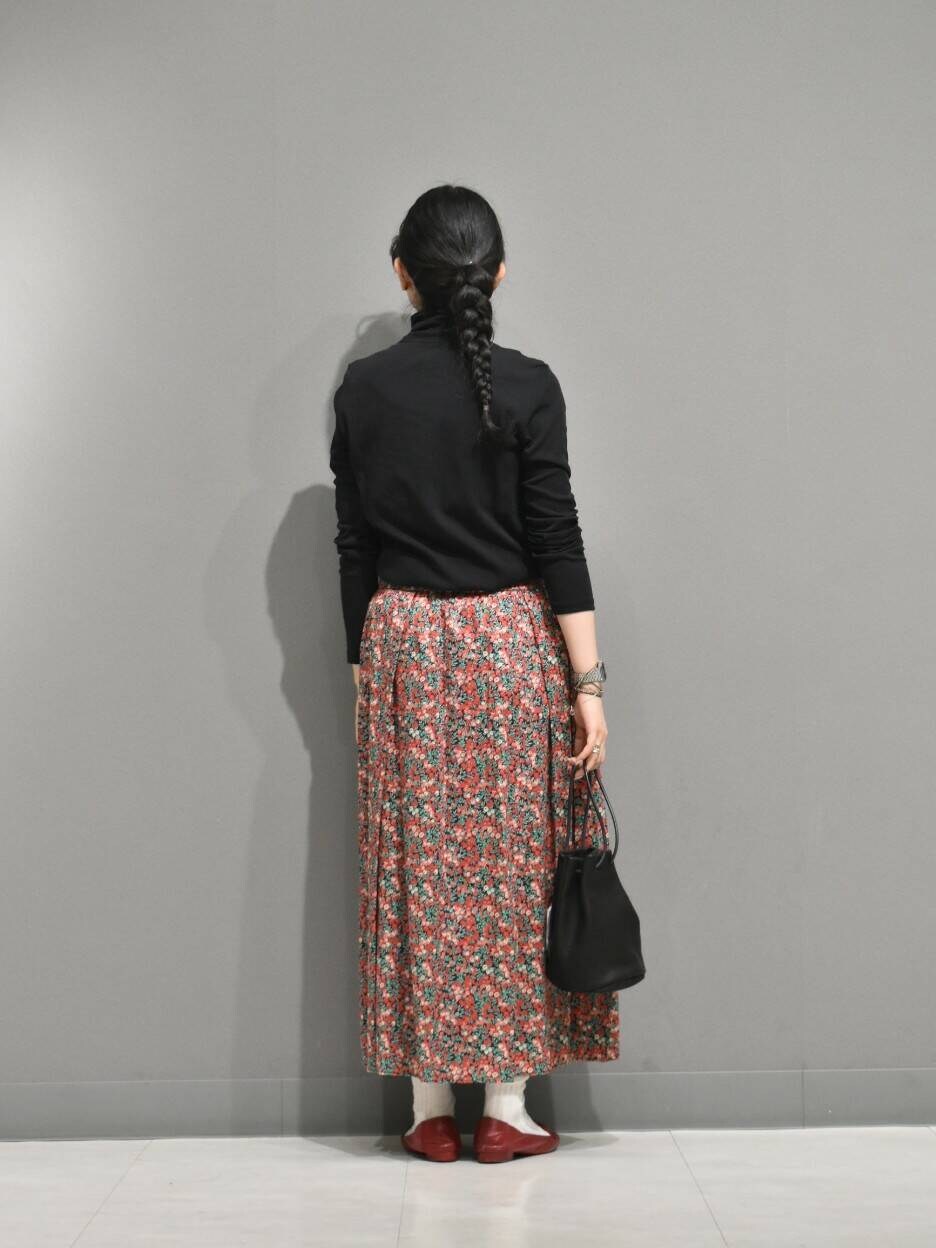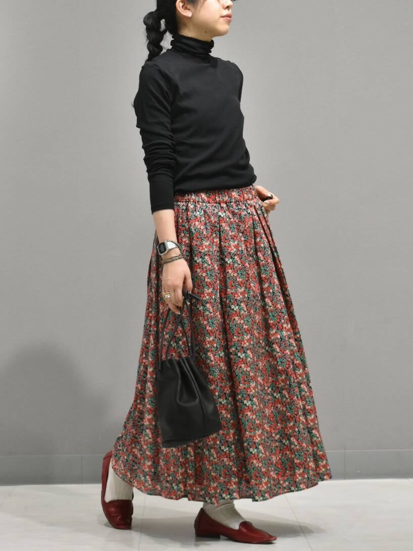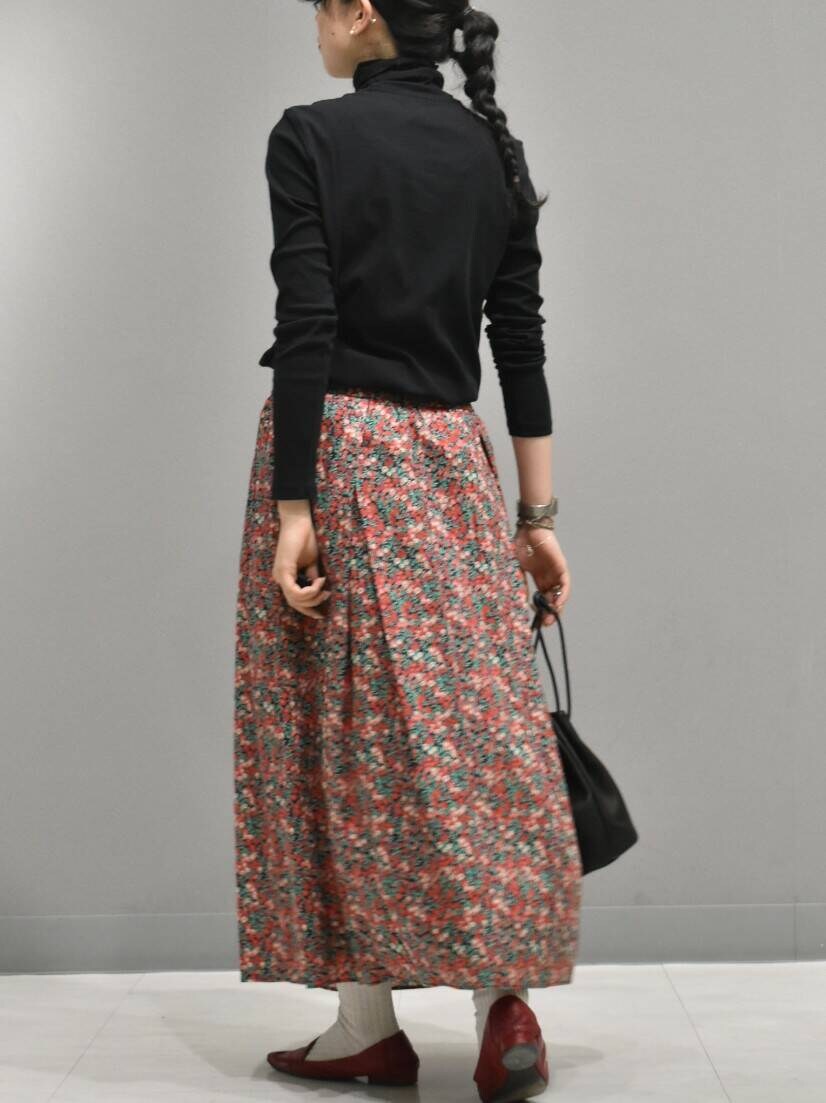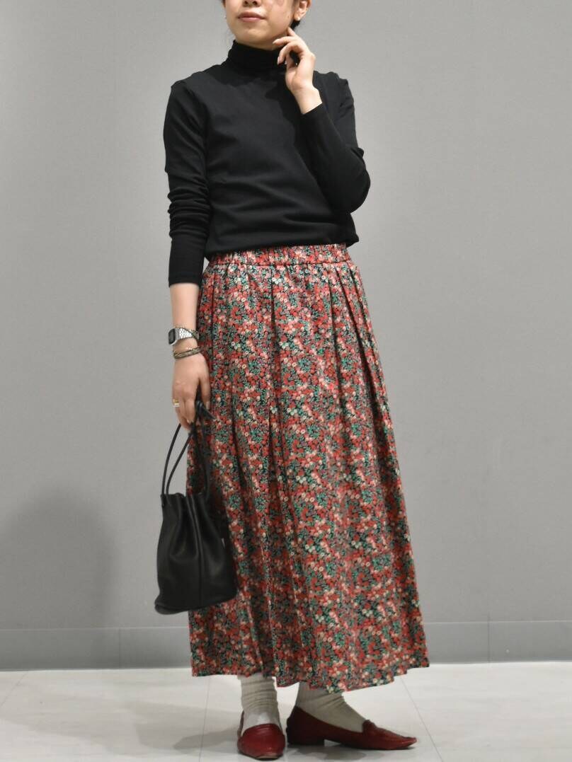 リバティプリントスカートのカラーをアクセントに大人のスカートスタイリングを組んでみました。