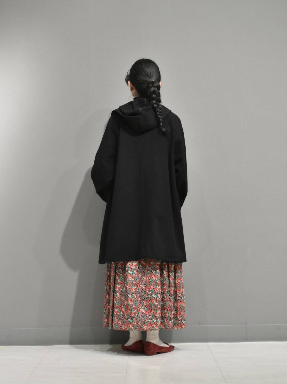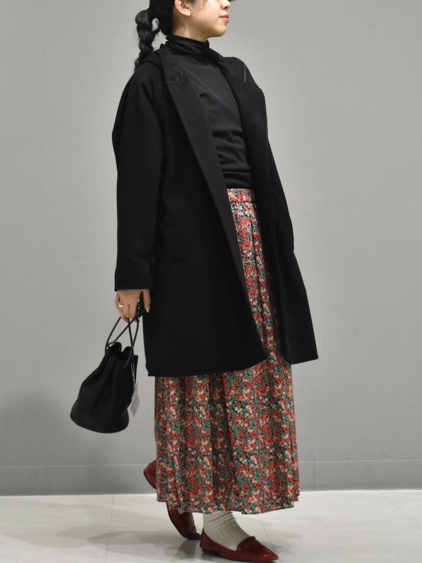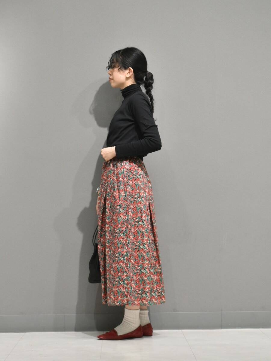 リバティプリントスカートのカラーをアクセントに大人のスカートスタイリングを組んでみました。