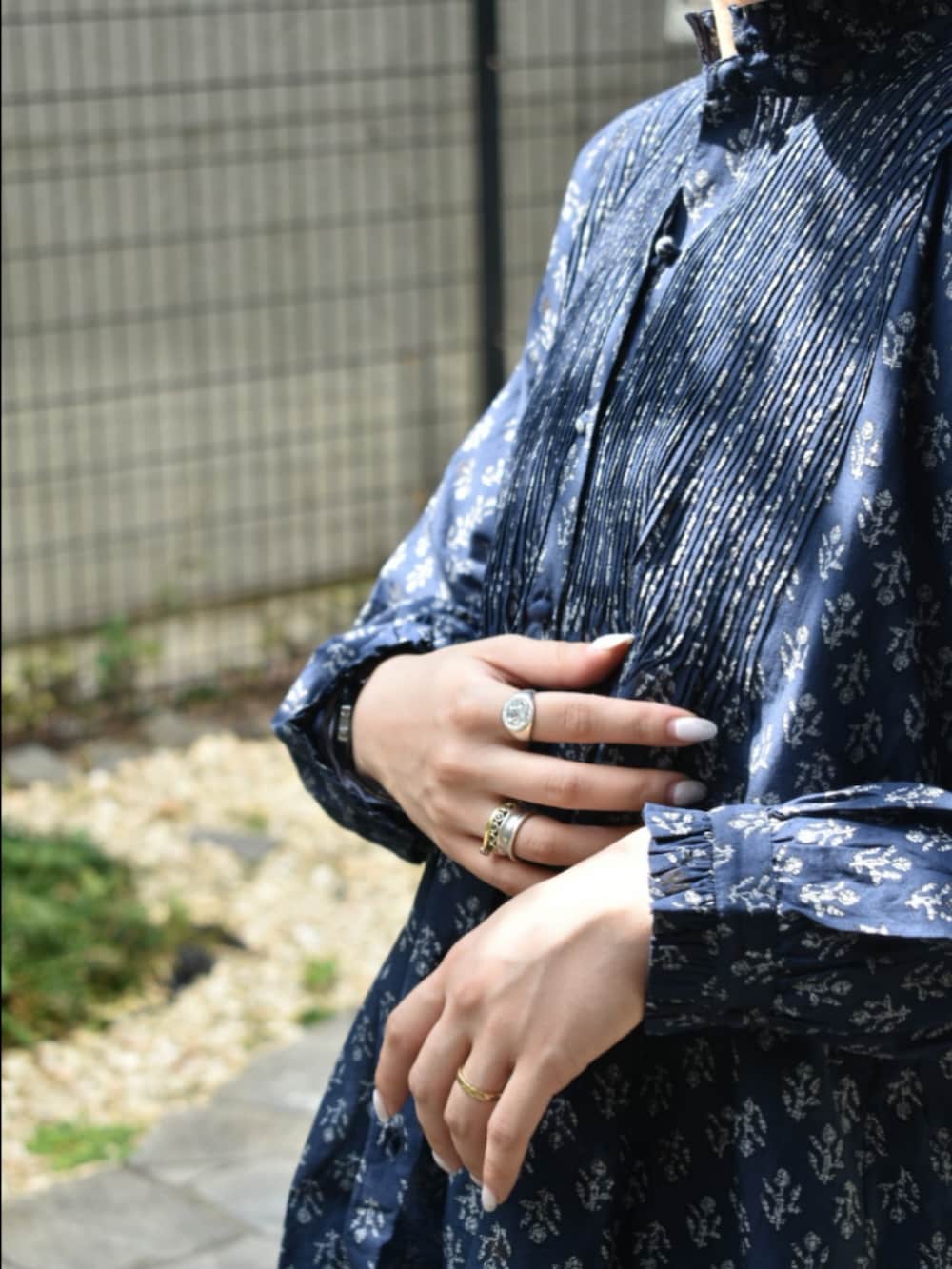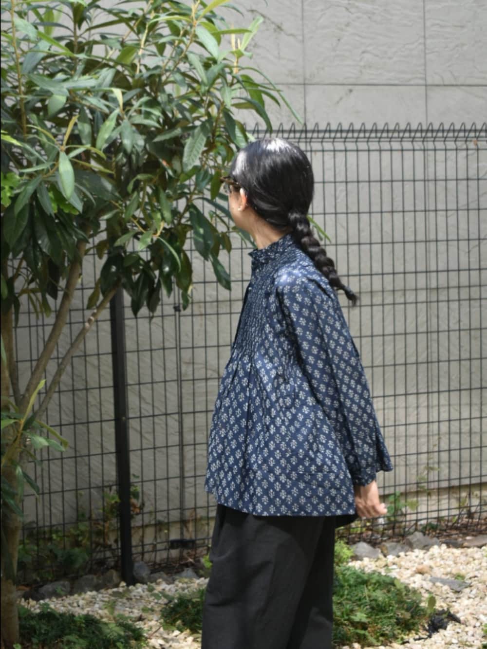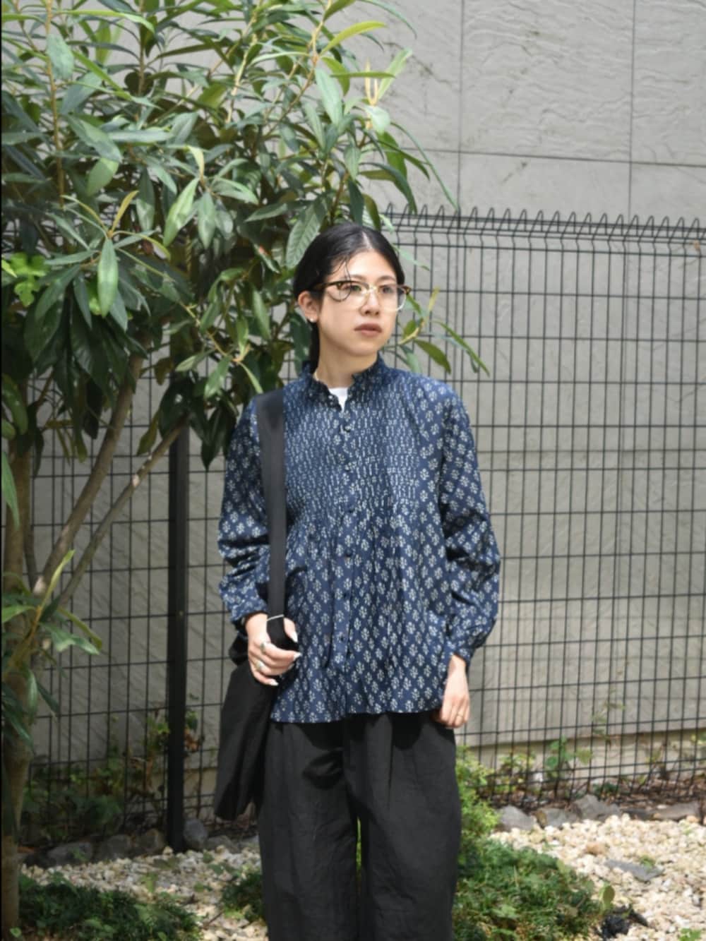 手仕事ピンタックがなんとも素敵なmaison de soilのフレアブラウス。ブロックプリントも素敵でアクセントのブラウンカラーがなんとも可愛いです。。シンプルにパンツ合わせで様になります。
