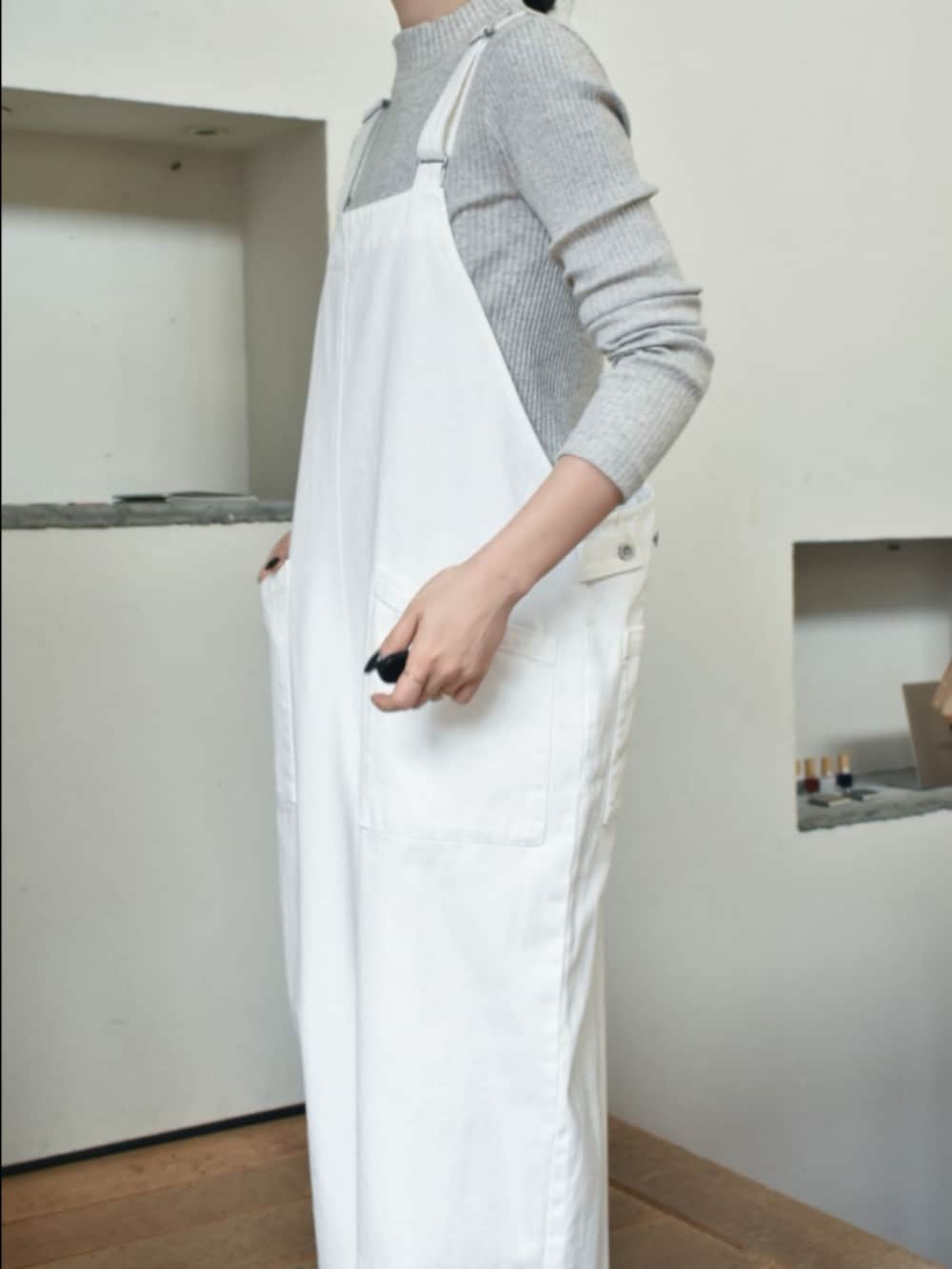 カジュアルになりすぎない、大人な雰囲気のかぐれのサロペット。