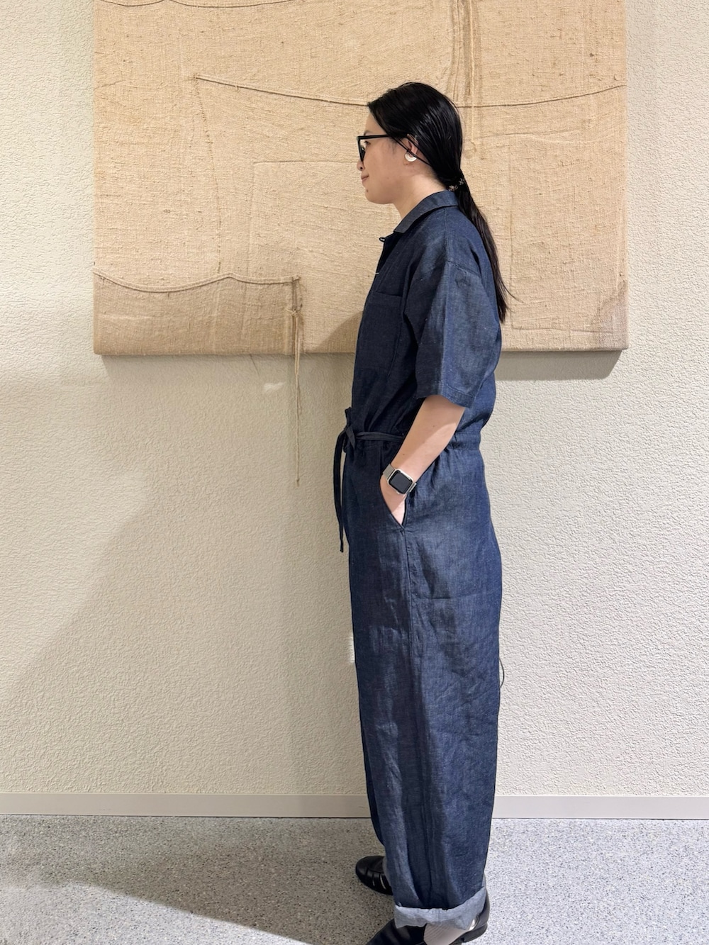 綿麻デニムハーフスリーブオールインワン