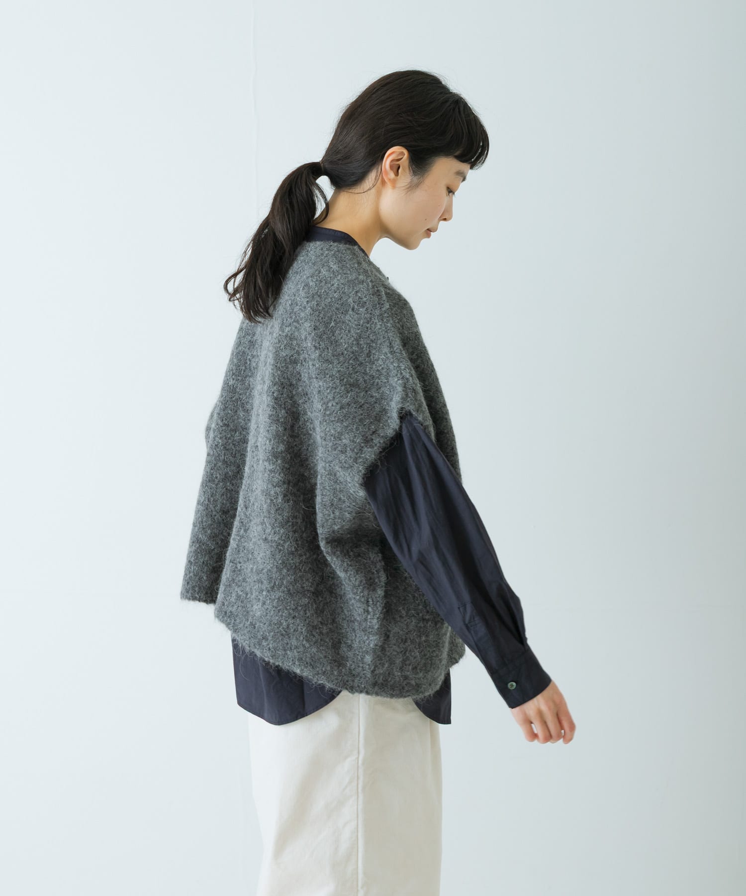 後ろ下がりのシルエットなので、