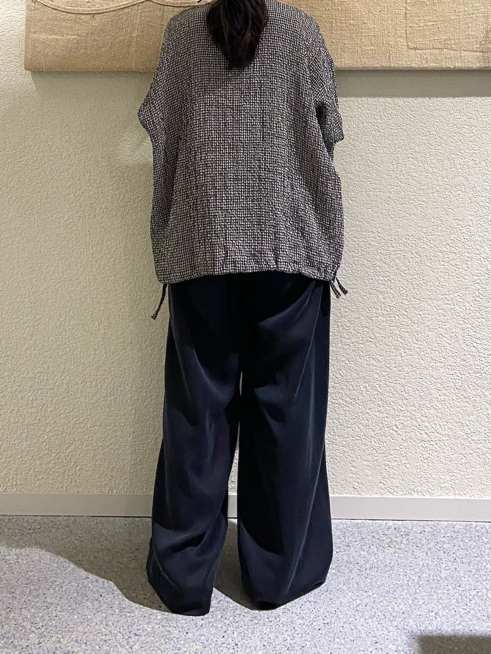 ゆったりサイズですが、裾を絞って調整ができるので