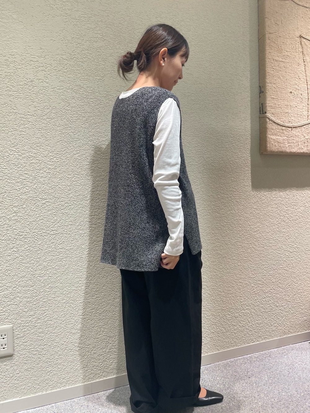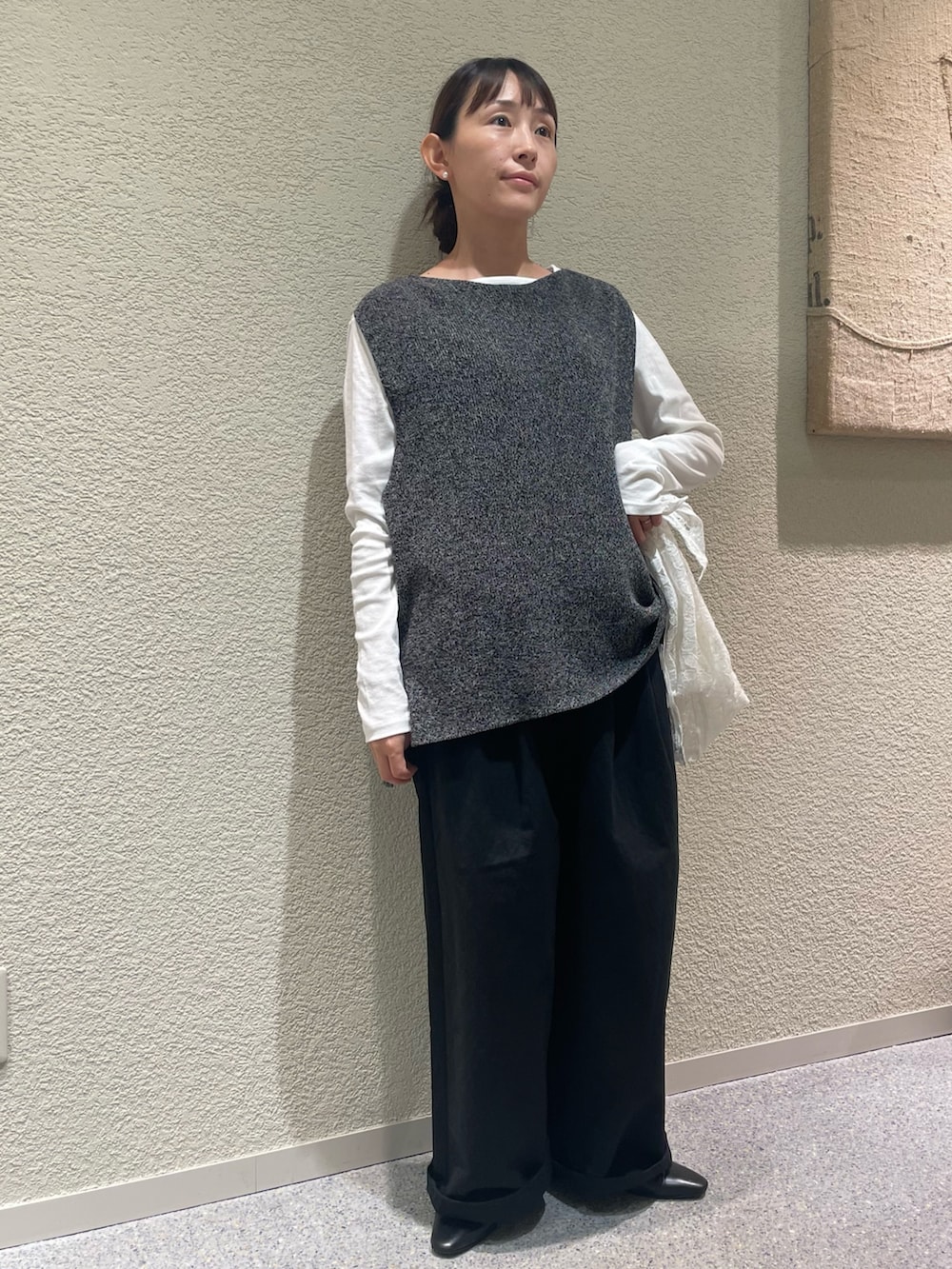 すとーんと落ちる長めの丈感がお尻周りをスッポリとカバーしつつ、スリットが効いています。ボートネックの様な首元も同じくボートネックのカッソーで合わせても綺麗ですし、ブラウスやシャツを重ねても🙆♀️
