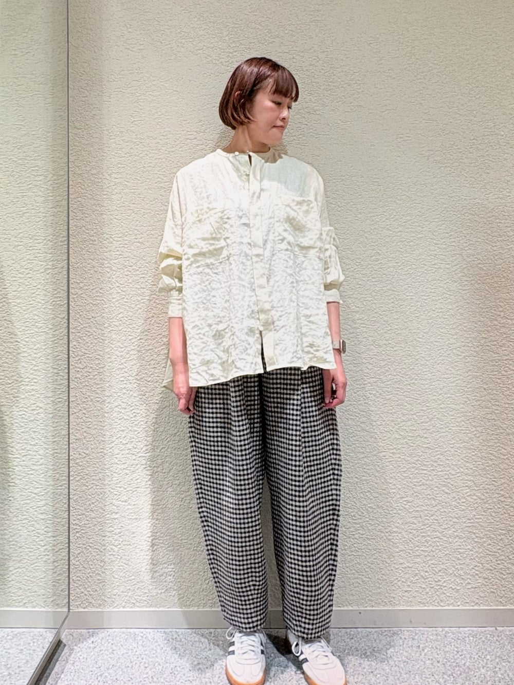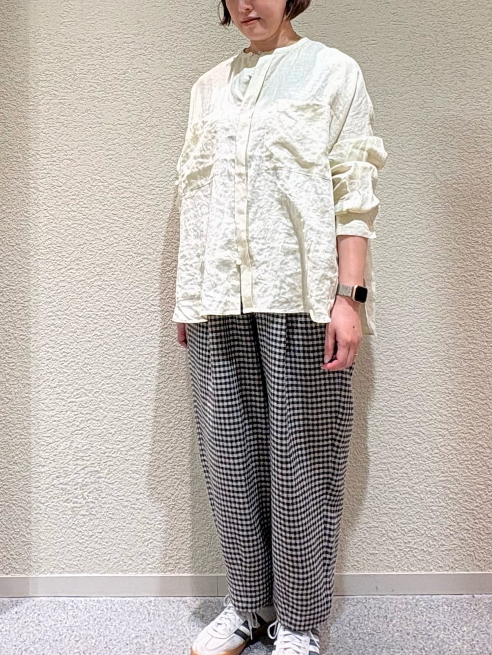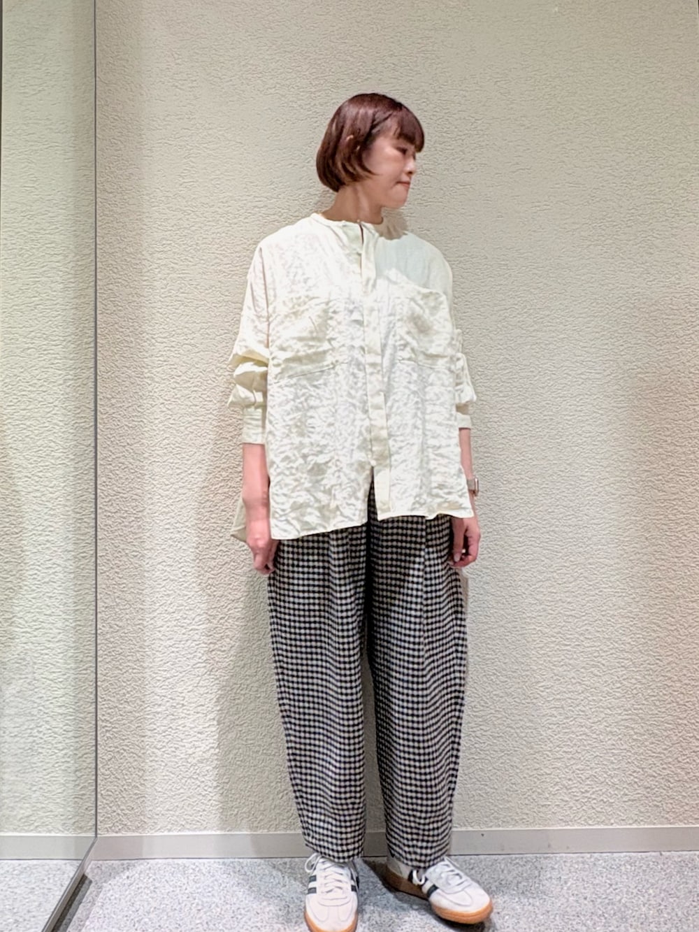 主張しすぎないチェックがポイントになり、シンプルなトップスと合わせて着て頂くと可愛いです。