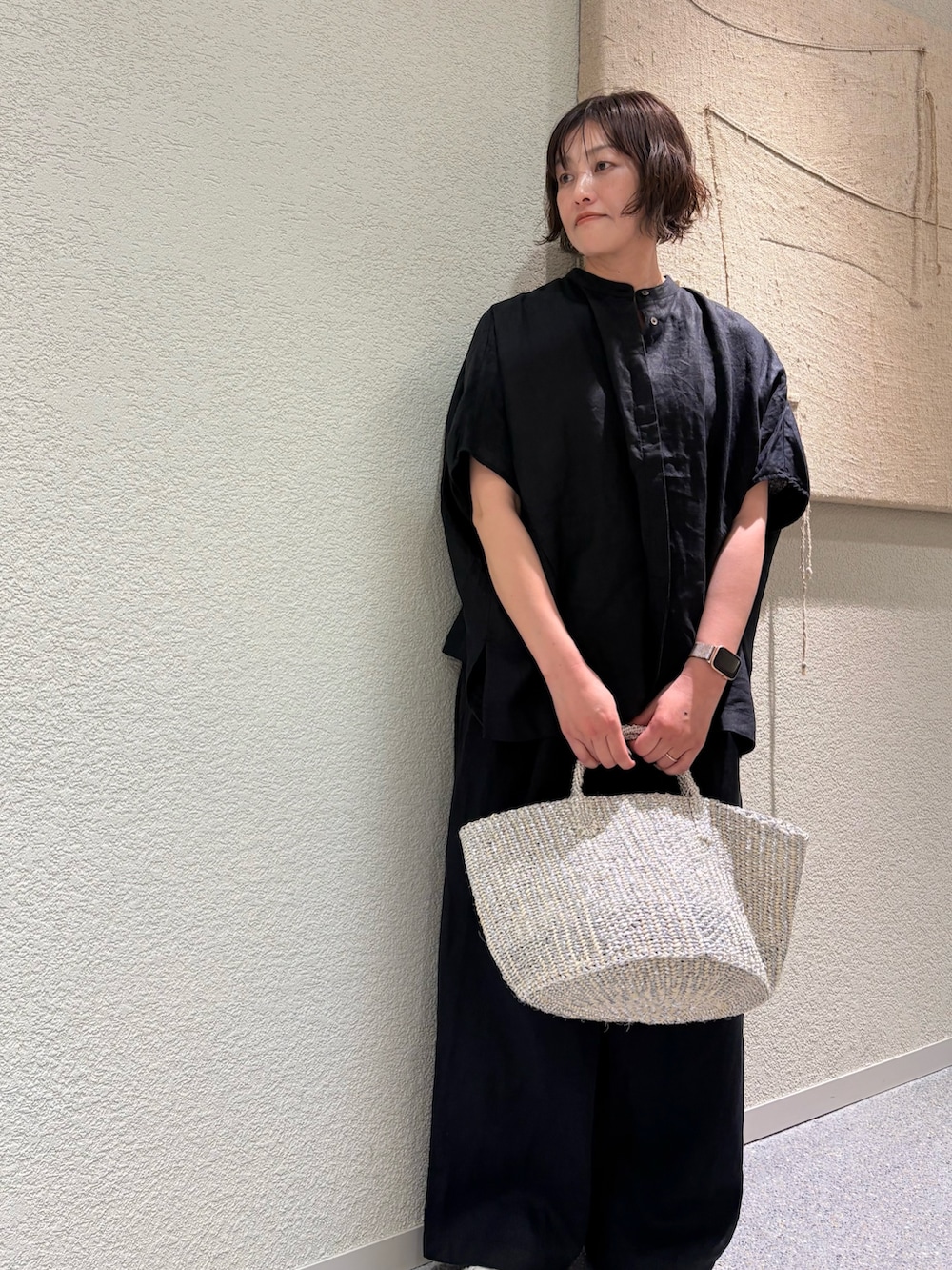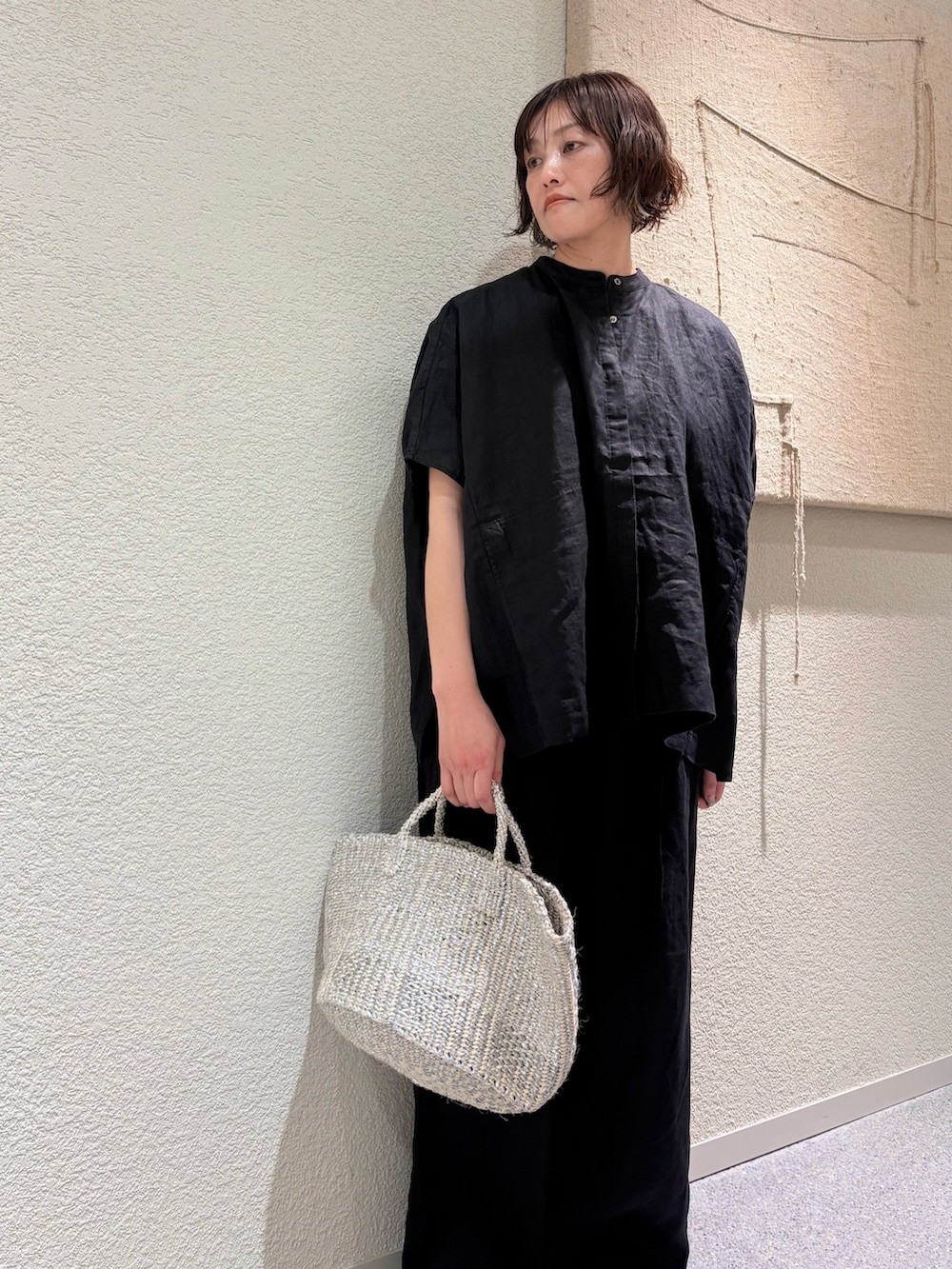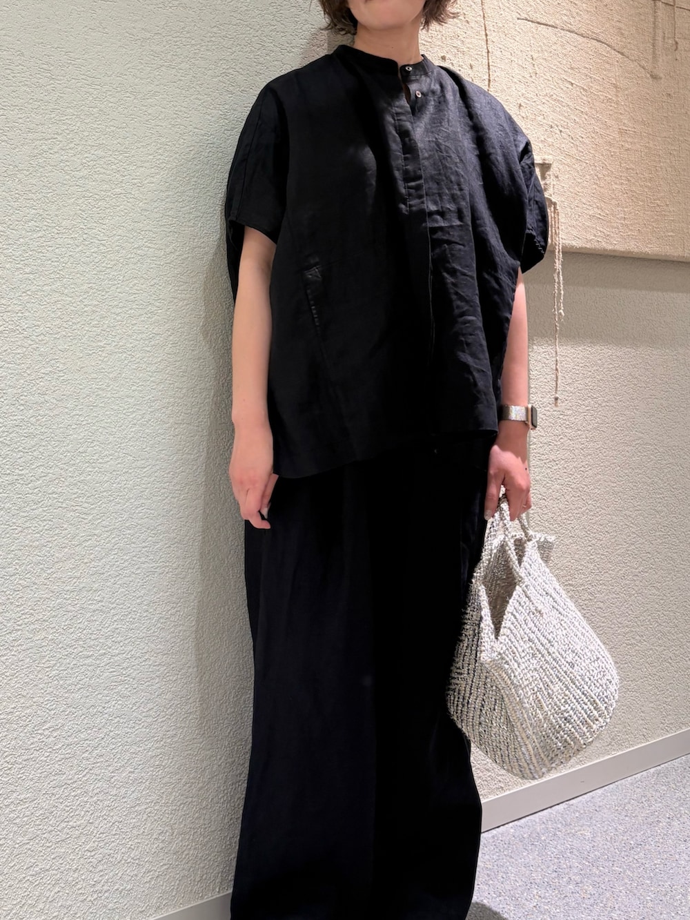新入荷したリネンスクエアケープシャツは身幅を広く取ったワイドシルエットが風通しの良い着心地です。上半身のラインを拾いにくいのも嬉しいポイント。これからの季節にピッタリです。
