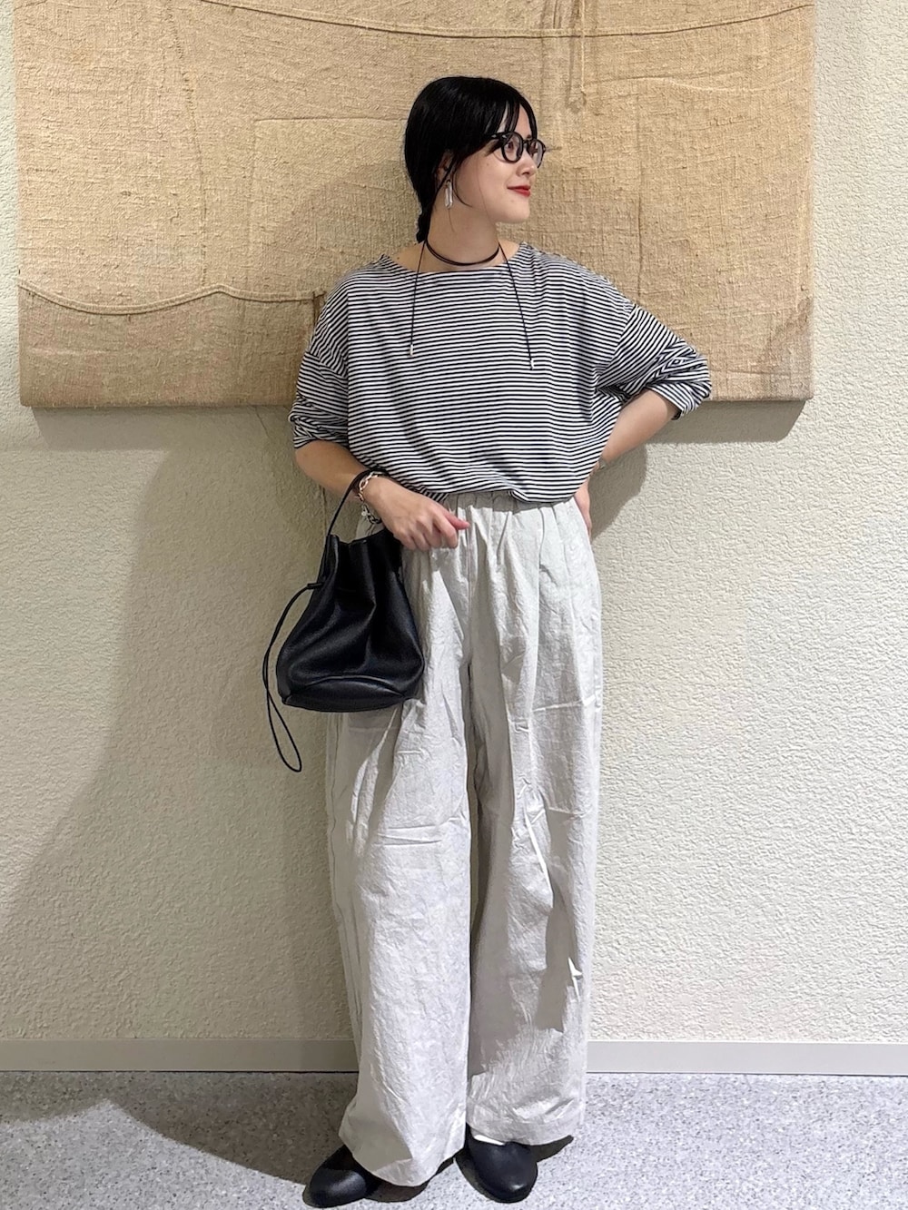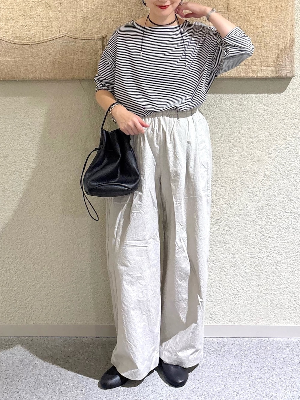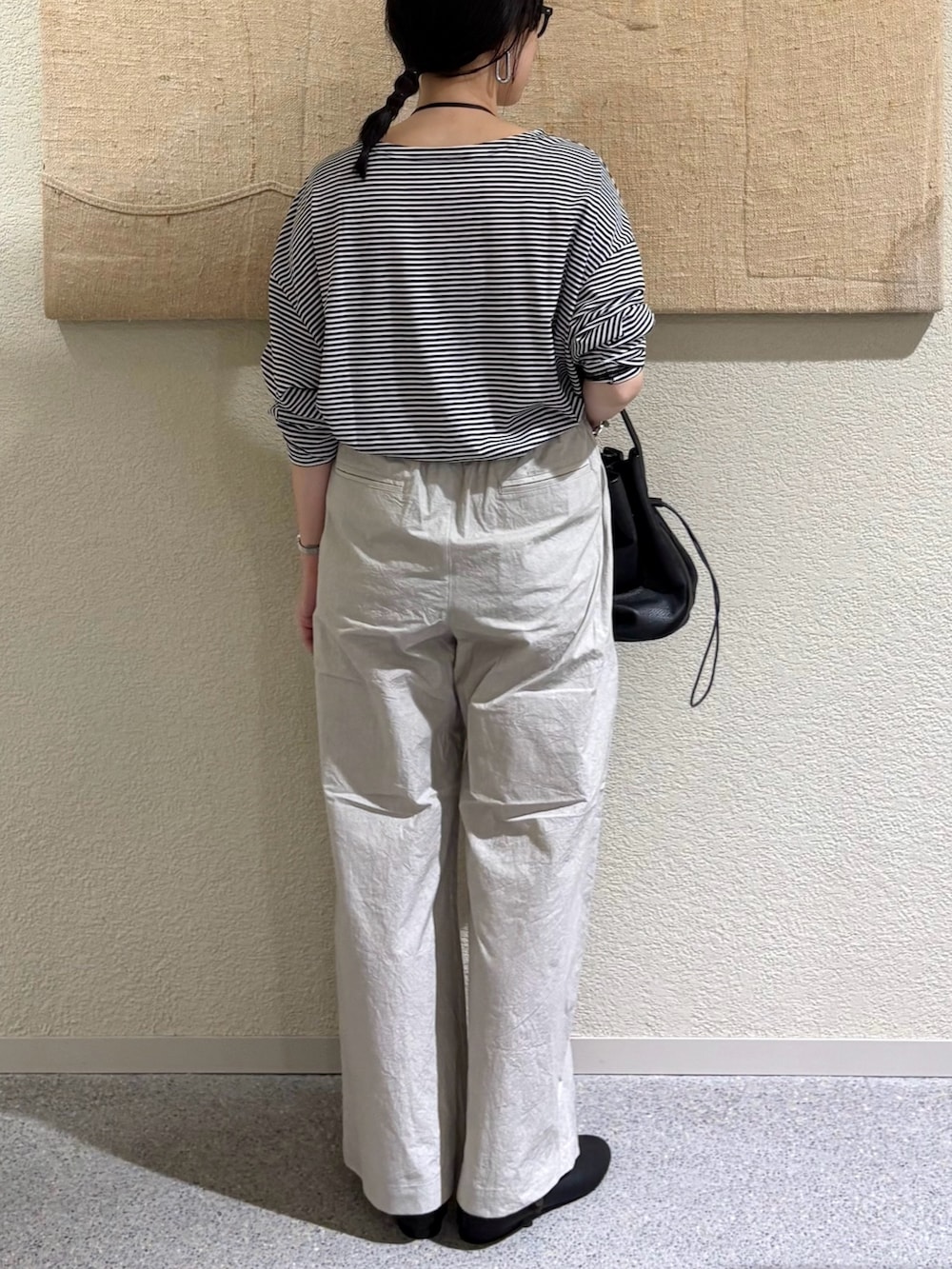 程よいボリューム感とタックデザインが特徴のイージーパンツ。軽やかなライトグレーが、トップスのモノトーンを引き立てます。