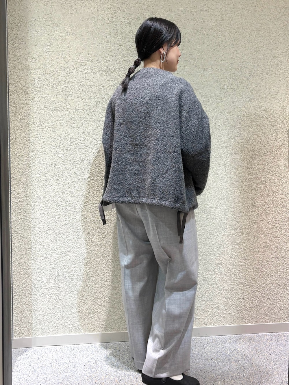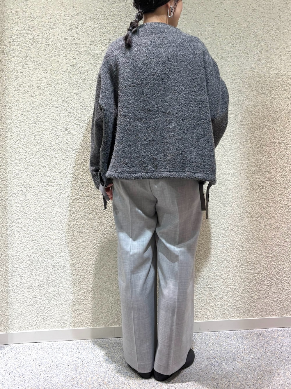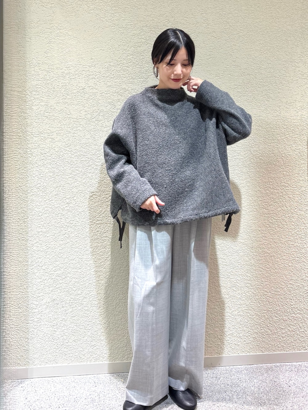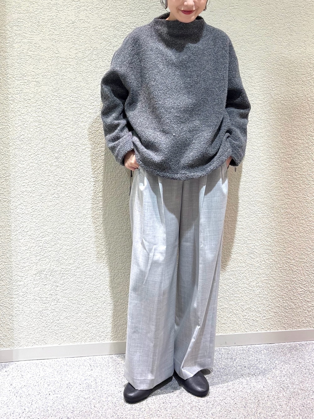 ・ボア素材のプルオーバーとウールパンツの異素材ミックスで、温かみと上品さを兼ね備えたスタイルに