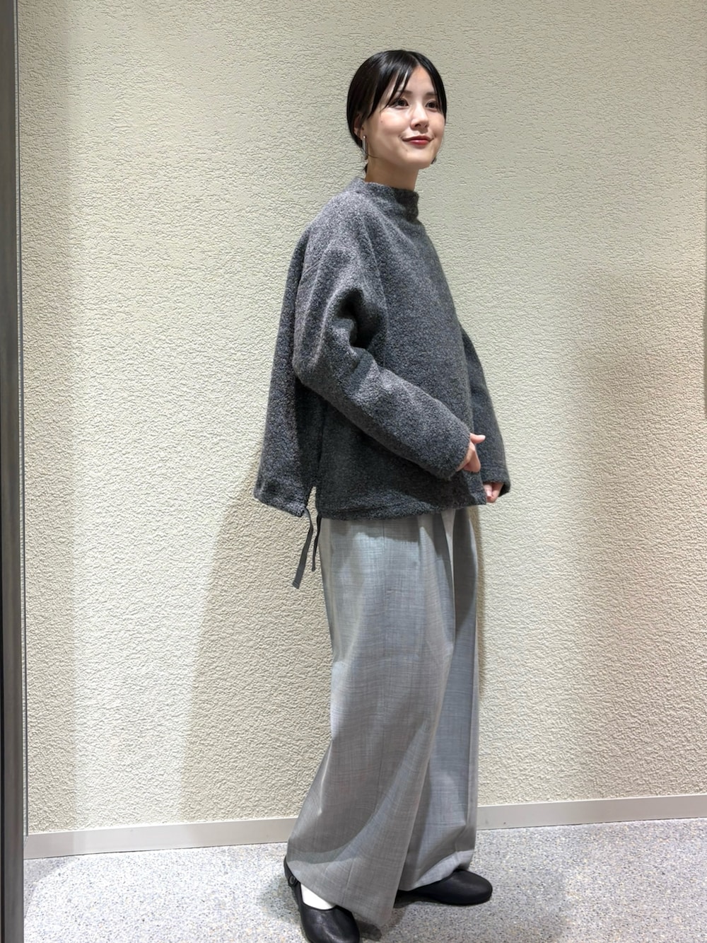 ・チャコール×グレーのワントーン配色で、大人の落ち着きを感じさせるニュアンスある着こなしに