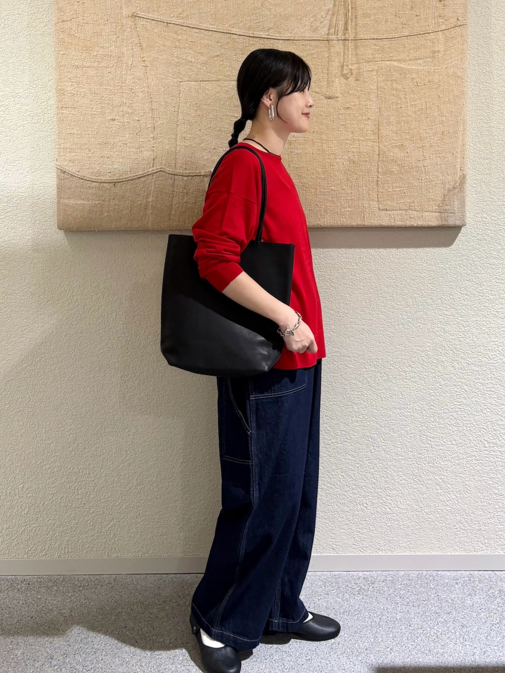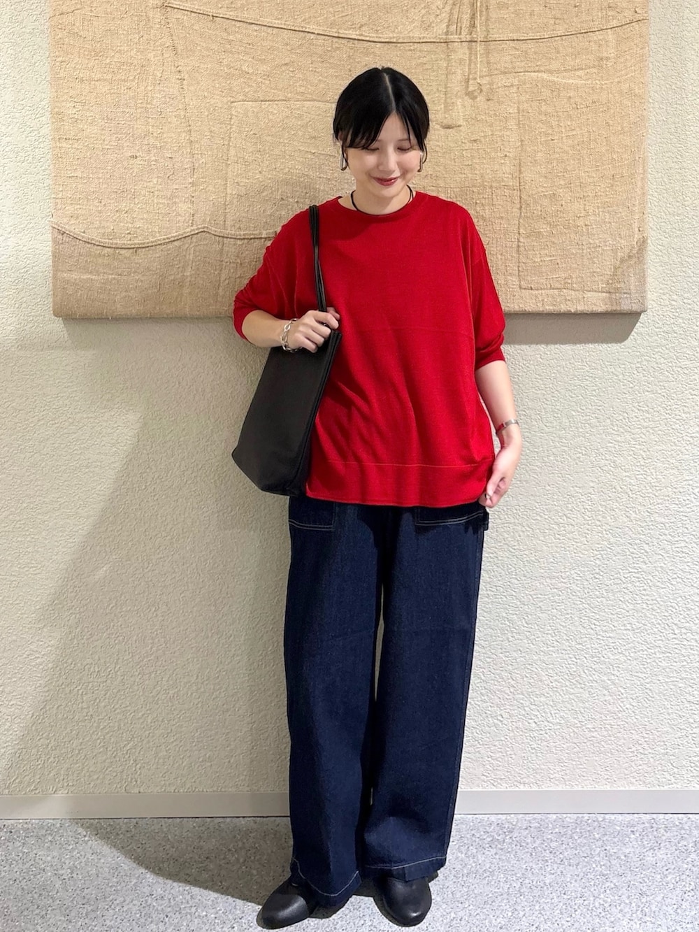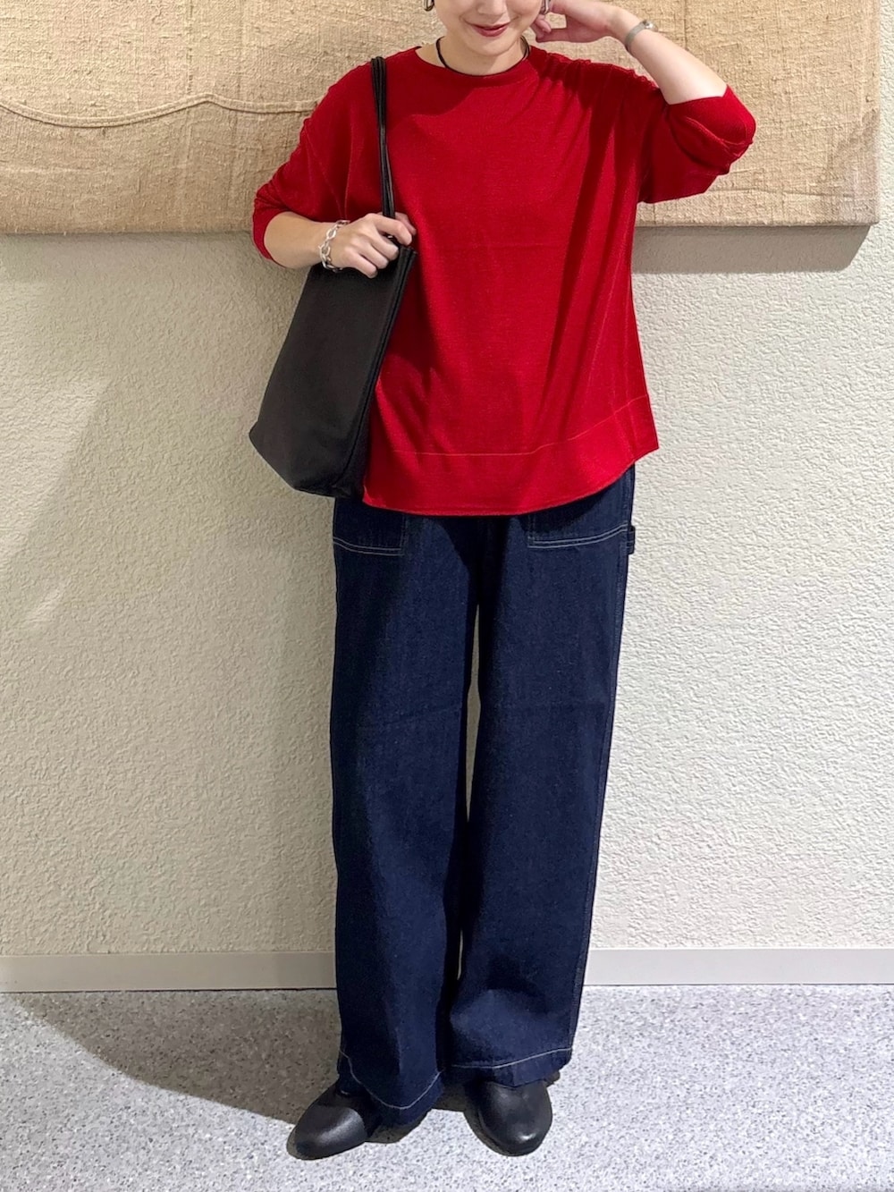 ・鮮やかなREDニットを主役に、顔まわりをパッと明るく