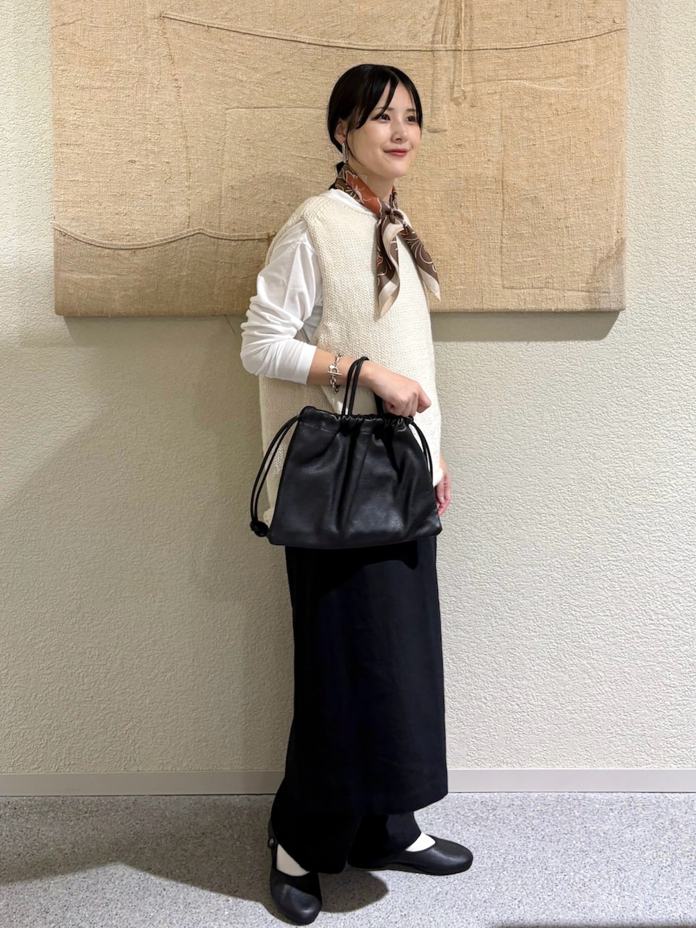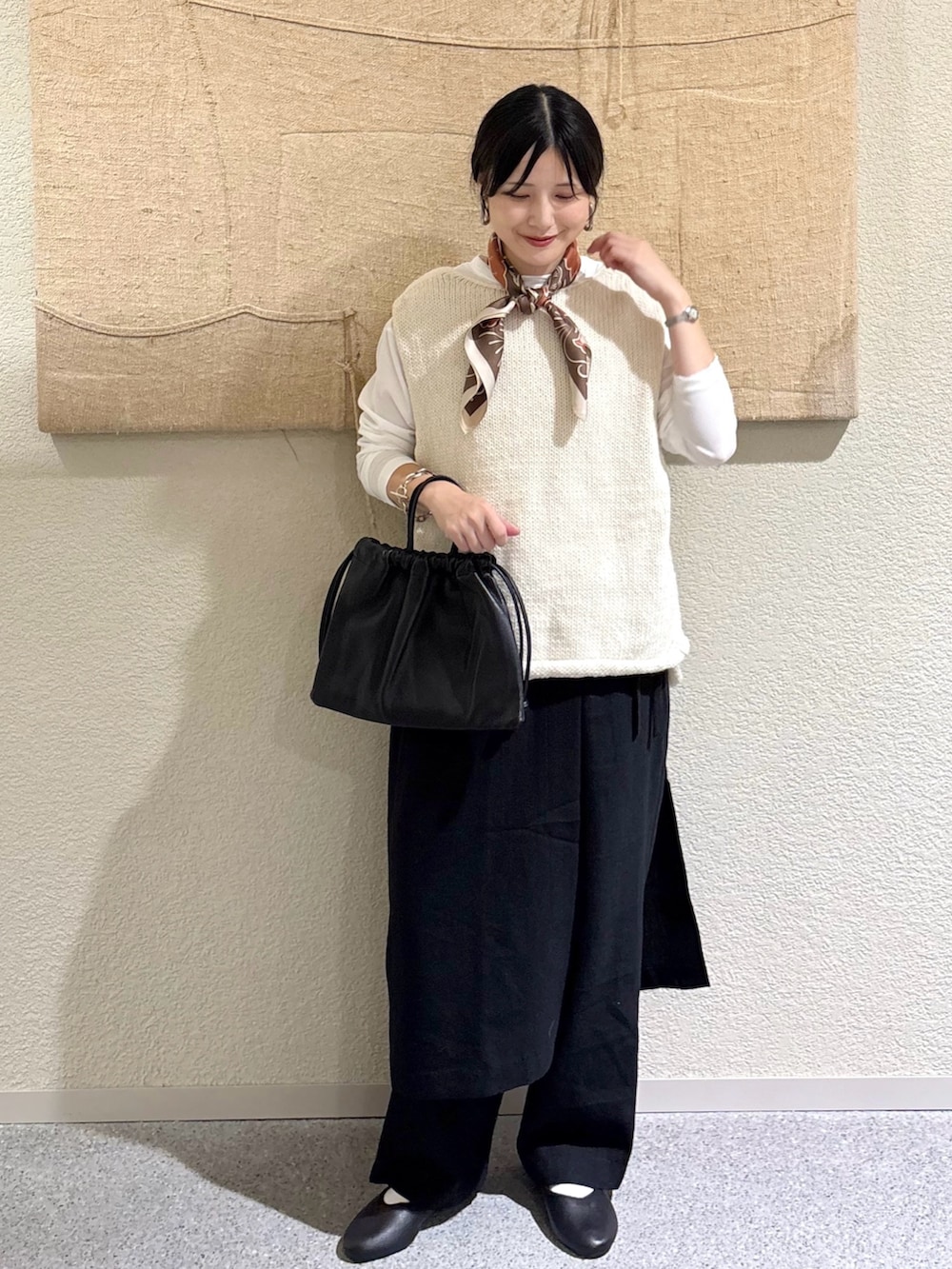 ・ブラウンのスカーフを首に巻いて、落ち着いたトーンに秋らしいアクセントをプラス