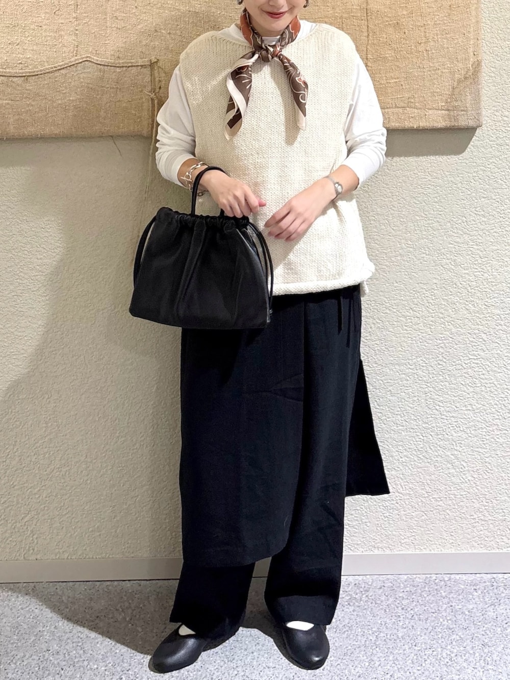 スカートのように見えるラップデザインが特徴のイージーパンツ。スカート部分は取り外しも可能。動きやすさと上品さを兼ね備えたシルエットで、BLACKの深みある色味が全体を引き締めます。カジュアルにもきれいめにも対応できる万能アイテム。