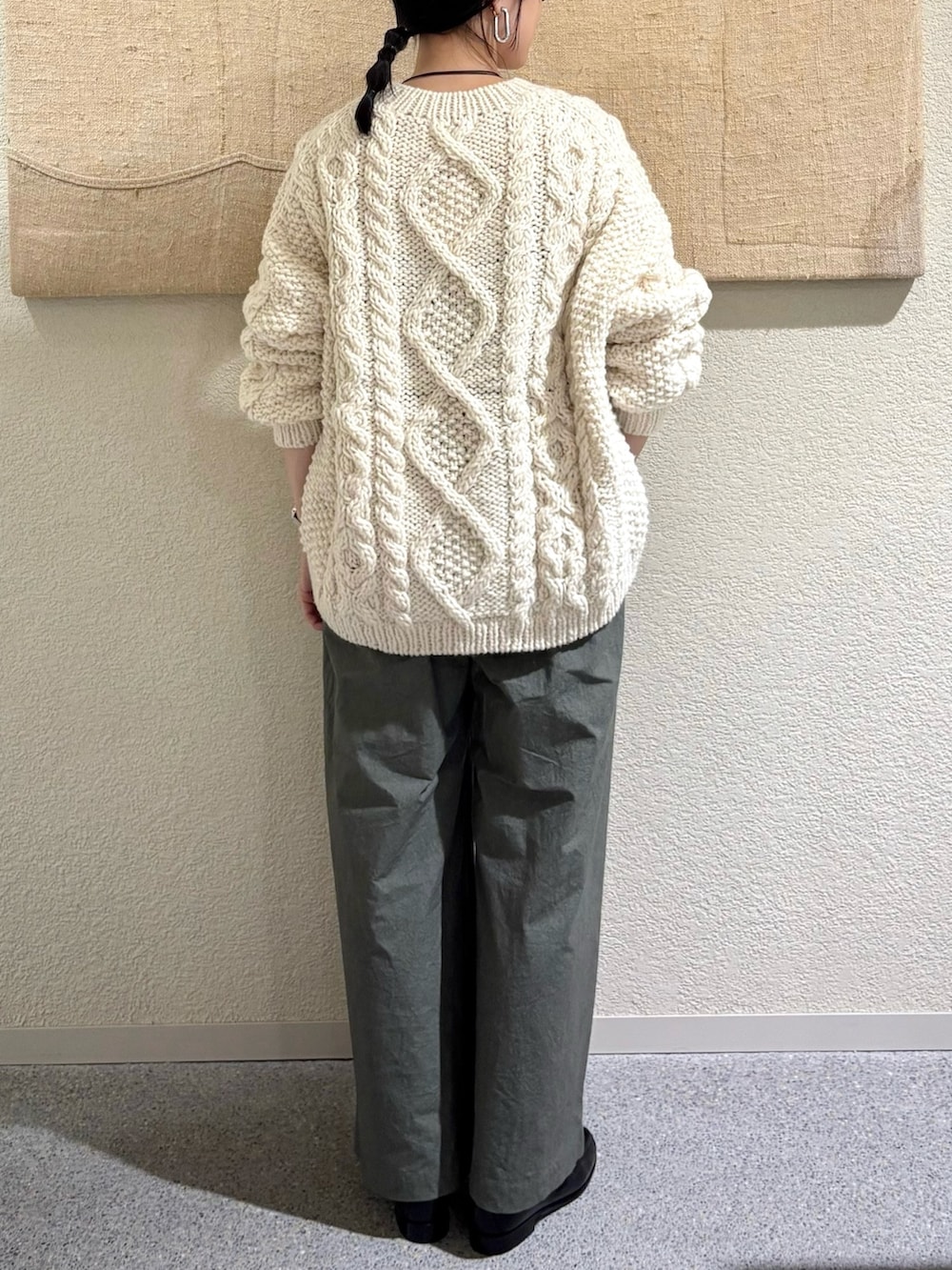 手編みのような温かみを感じるペルーアランニット。ざっくりとした編み模様が印象的で、程よくゆとりのあるシルエットがリラックス感を演出します。やわらかなIVORYカラーが顔まわりを明るく見せ、秋冬のスタイリングにやさしい抜け感をプラス。