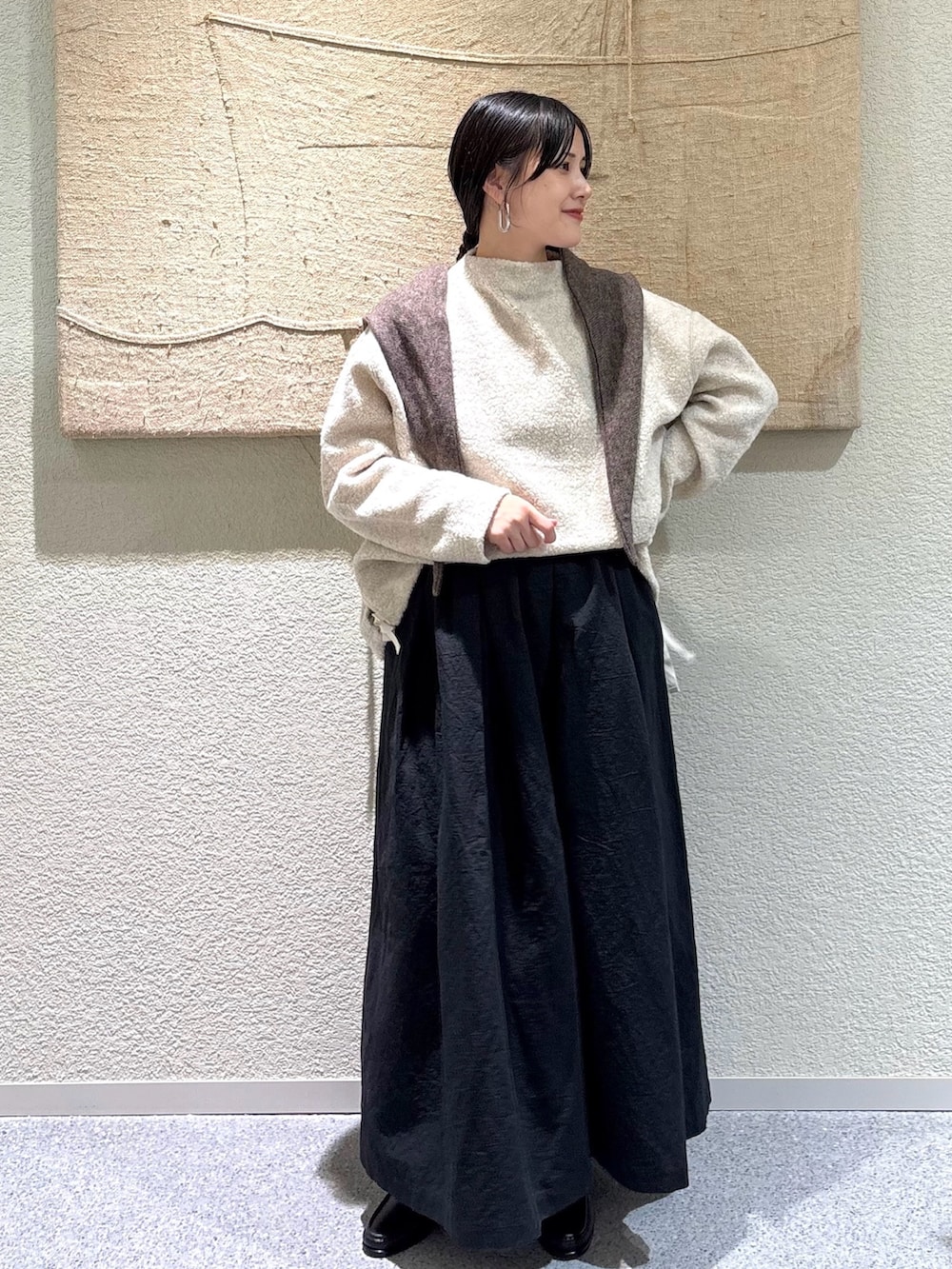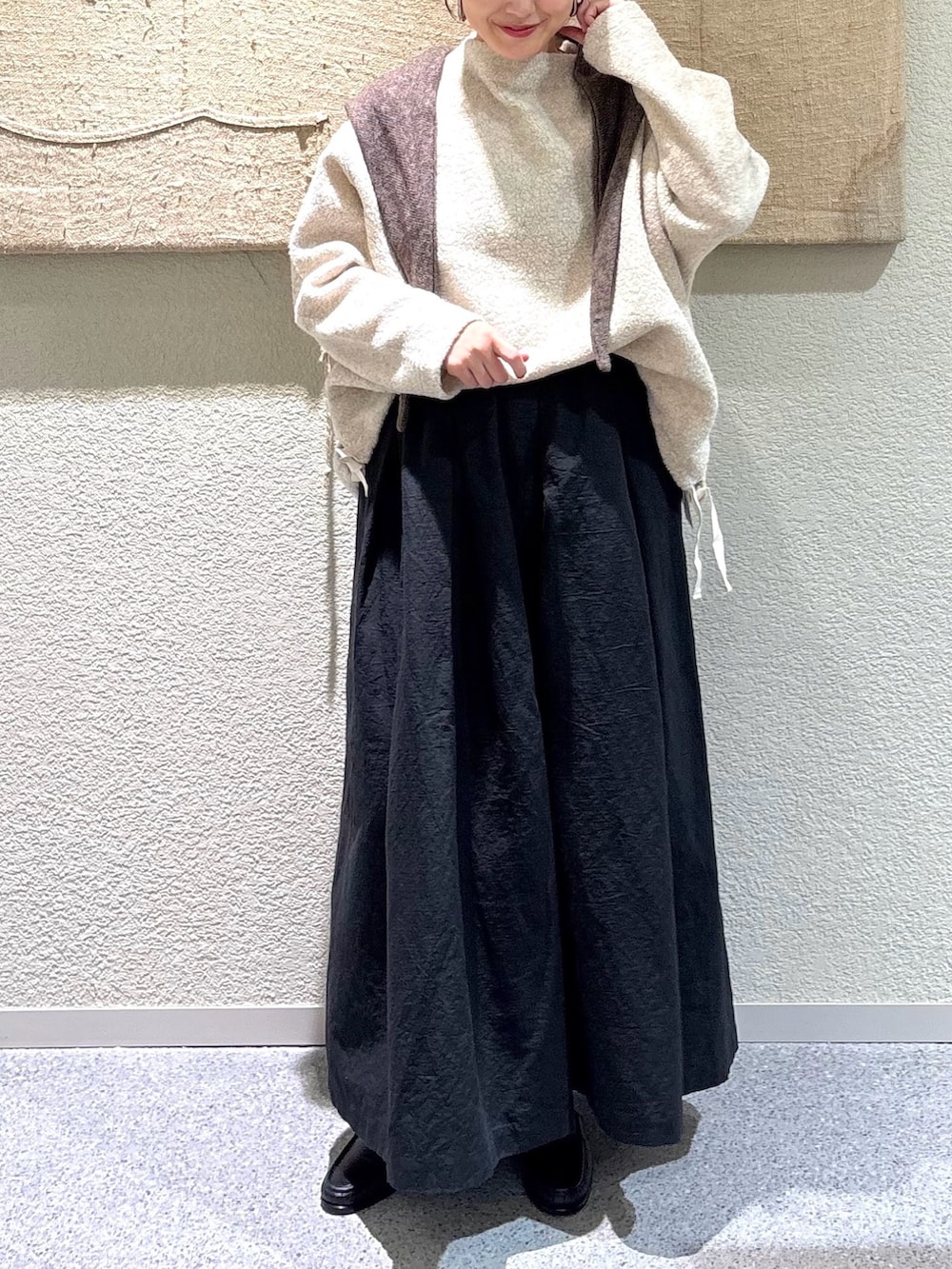 フロントにタックを施した上品なロングスカート。広がりすぎないシルエットで、すっきりとした印象に。ブラックの落ち着いたトーンが全体を引き締め、シックな大人の雰囲気を演出します。