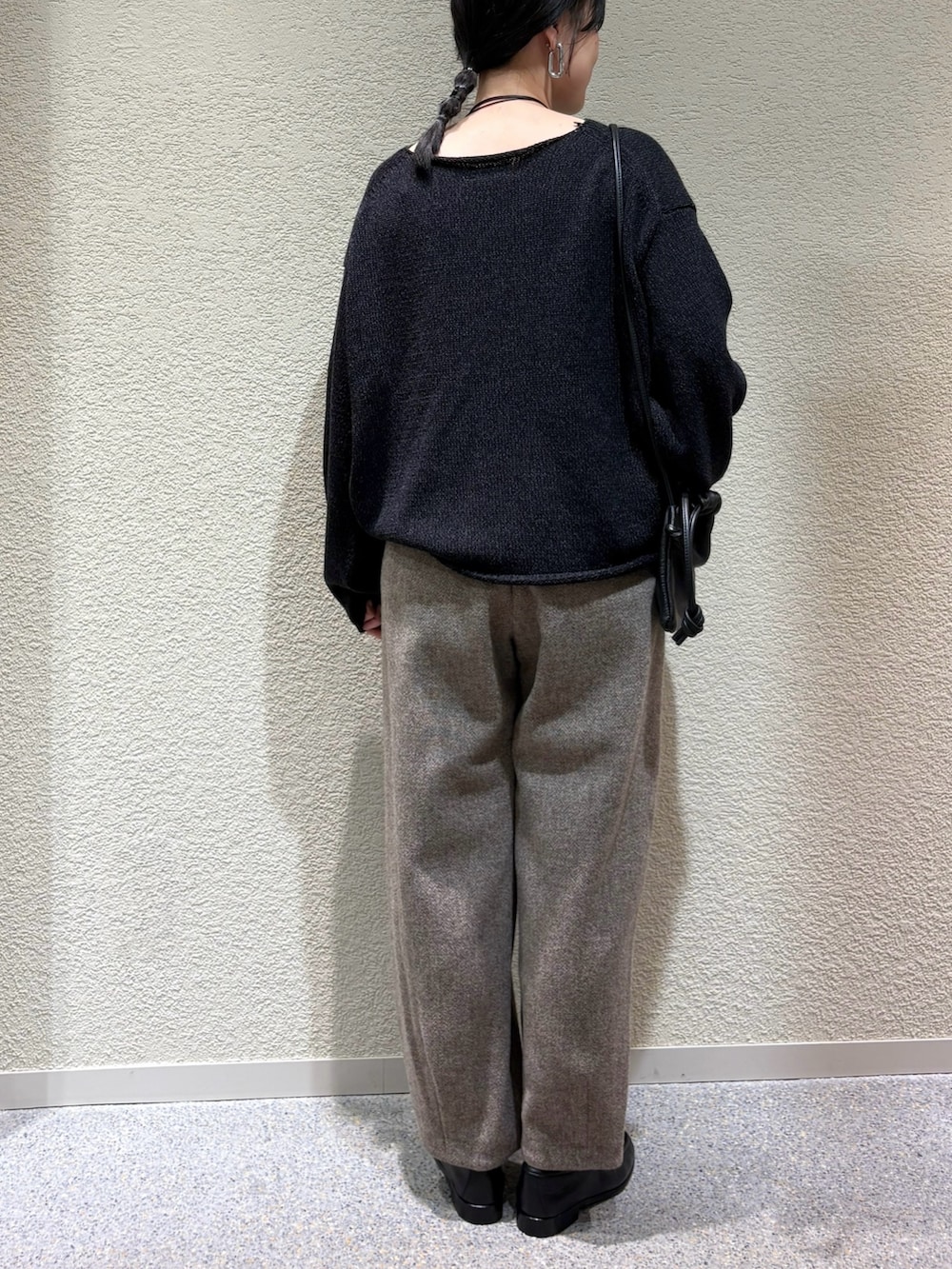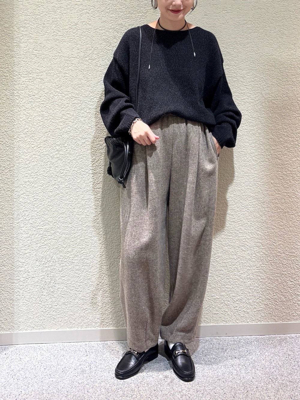 上質なウール素材を使用したテーパードパンツ。すっきりとしたシルエットながら、ウエストゴム仕様でリラックス感のある履き心地です。ベージュの柔らかな色合いが、ニットのブラックを引き立てつつ女性らしさをプラス。