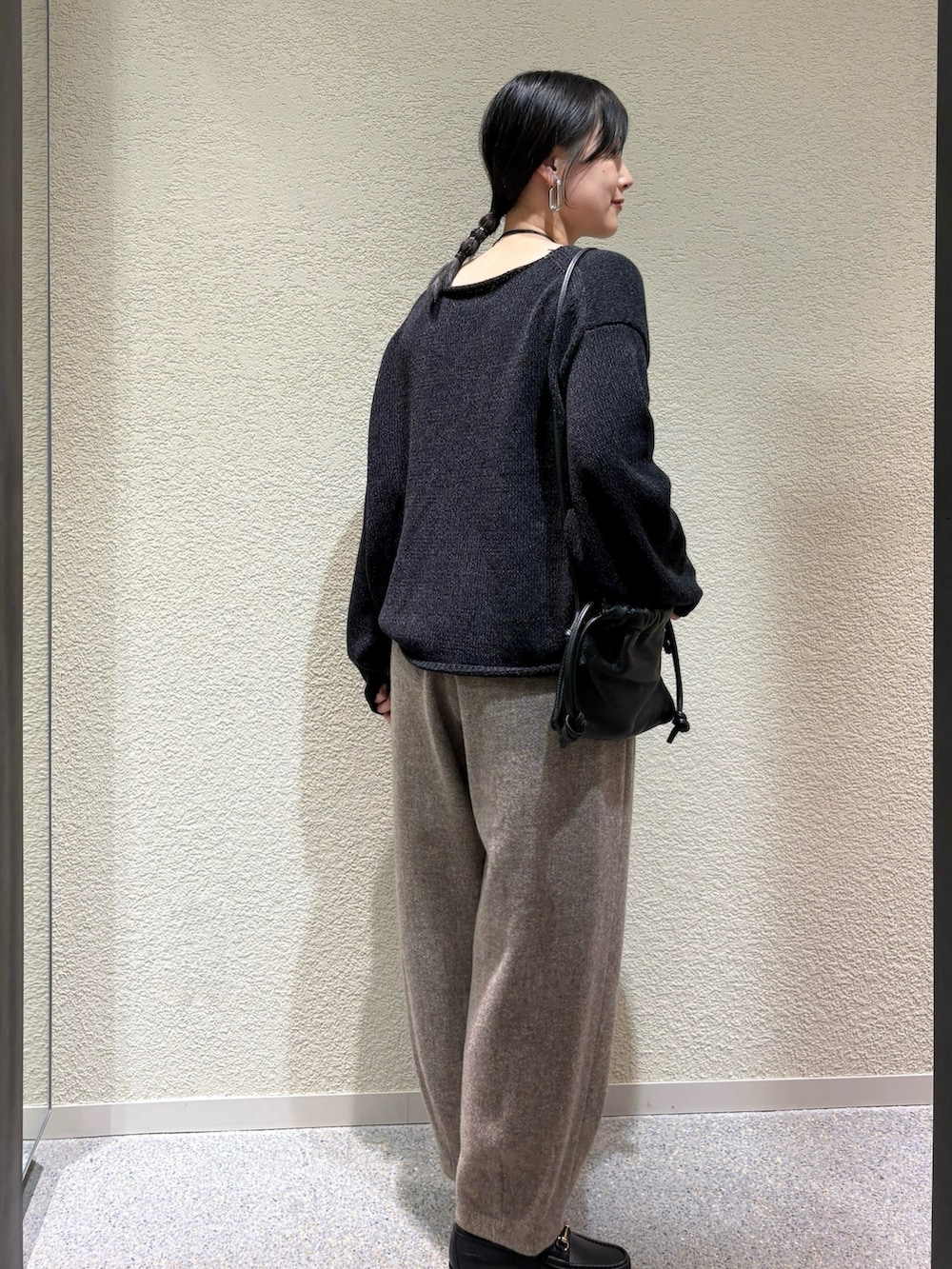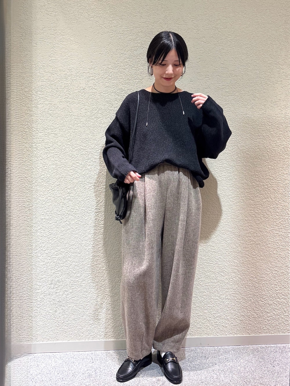 立体感のある編み地が特徴のテープヤーンニット。さらりとしたドライな肌触りで、季節の変わり目にも快適に着られます。ボートネックの抜け感が首元をすっきり見せ、ブラックのシックなトーンがスタイルを引き締めます。前だけインすることで、こなれた印象に。