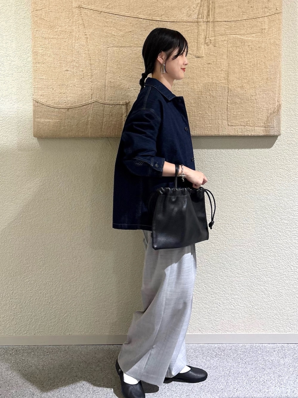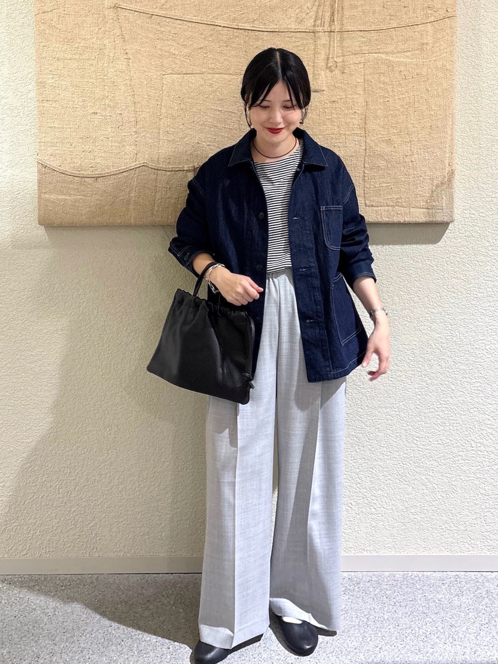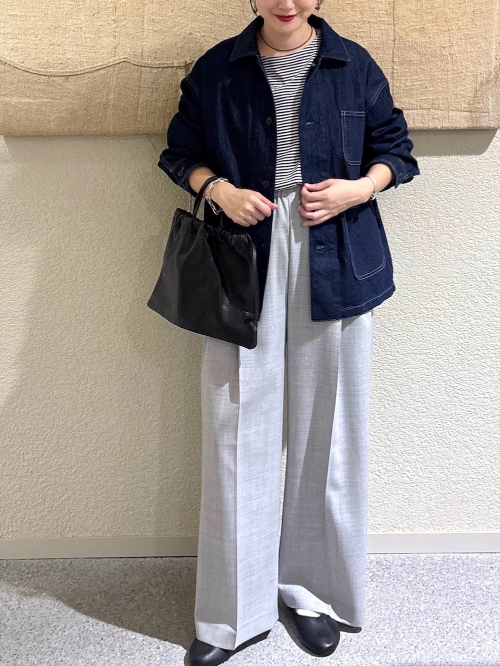 ・デニム×ボーダーの定番組み合わせをウールパンツで上品にアレンジ。
