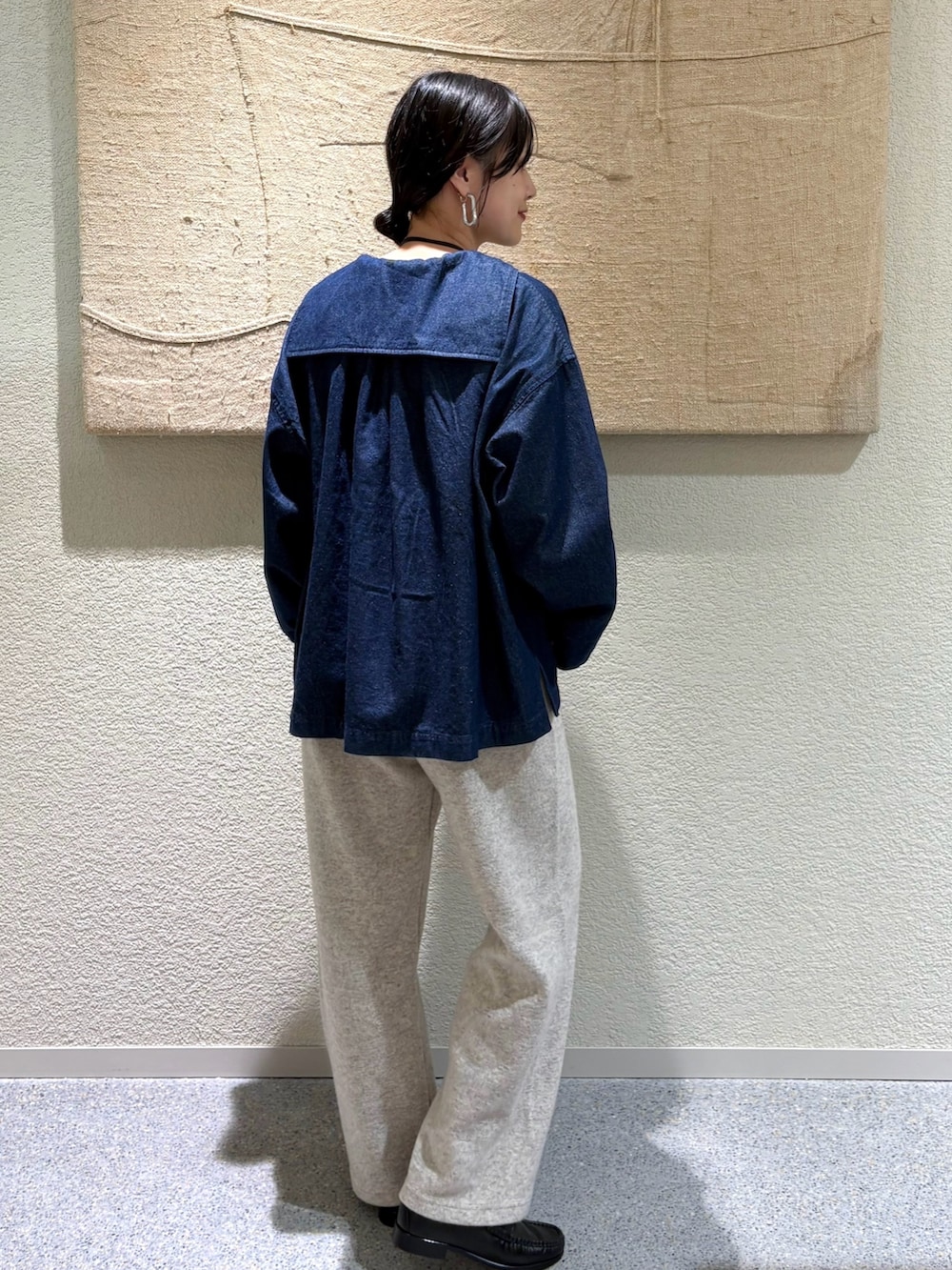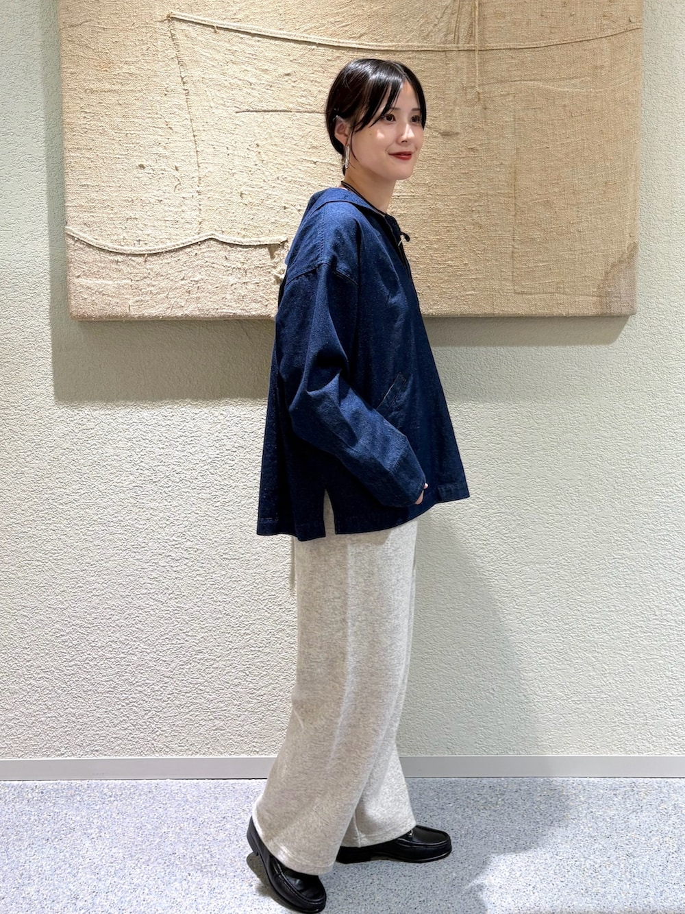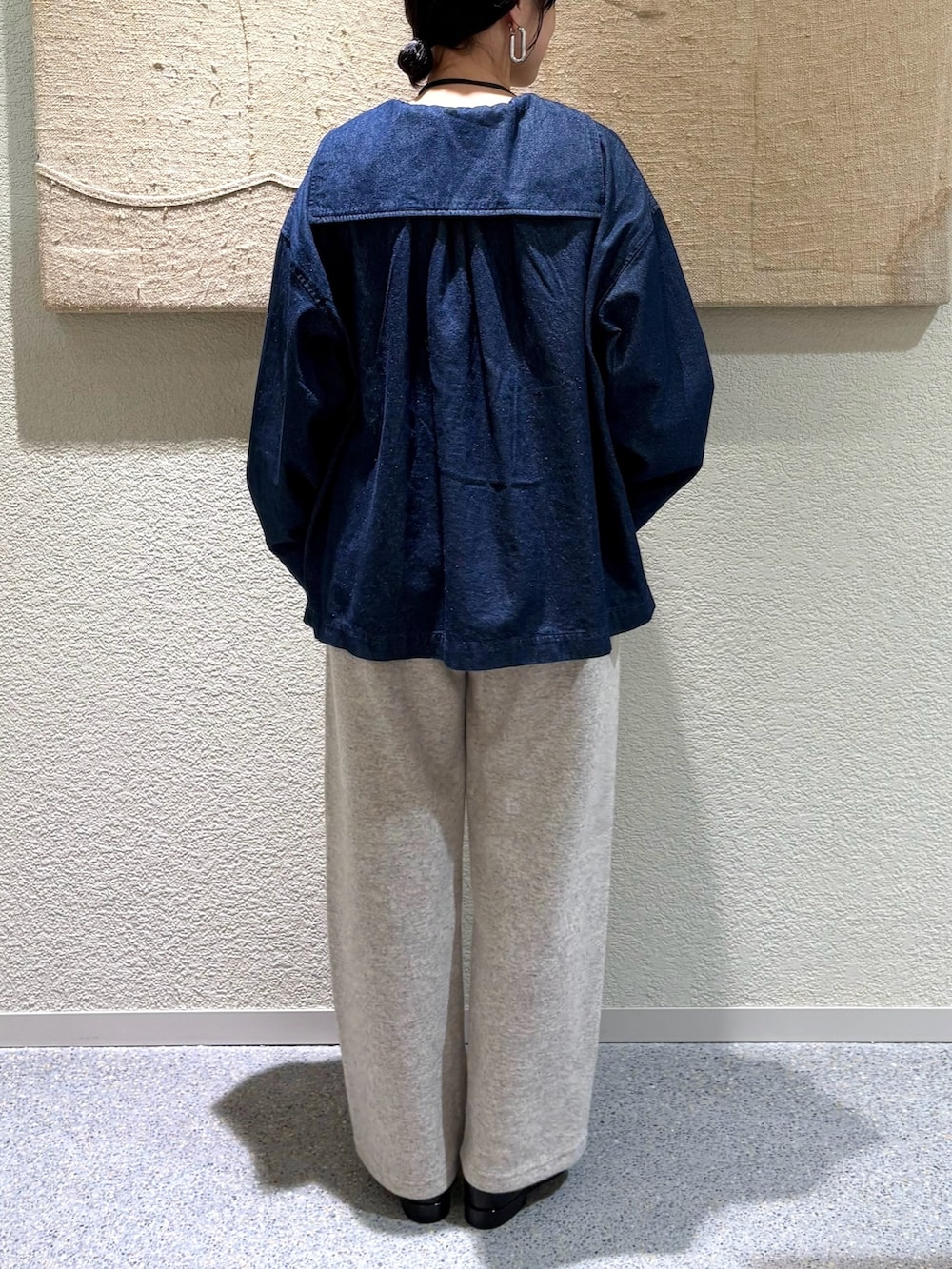 ふんわりとした生地感が心地よいダブルフェイス素材のイージーパンツ。上品なオートミールカラーが、デニムのインディゴと好バランスにまとまり、柔らかくナチュラルな雰囲気を演出します。
