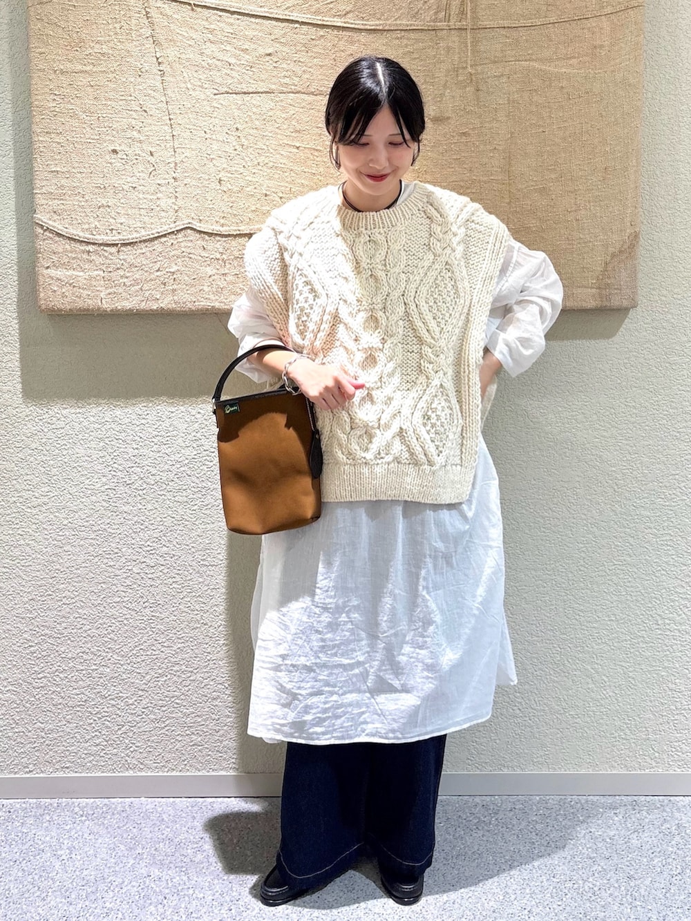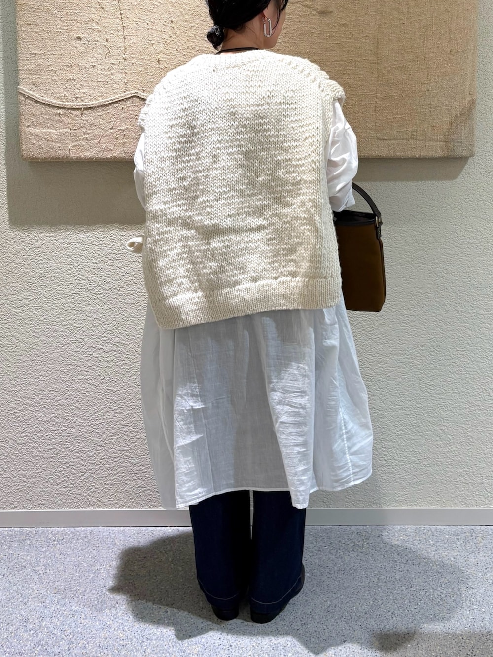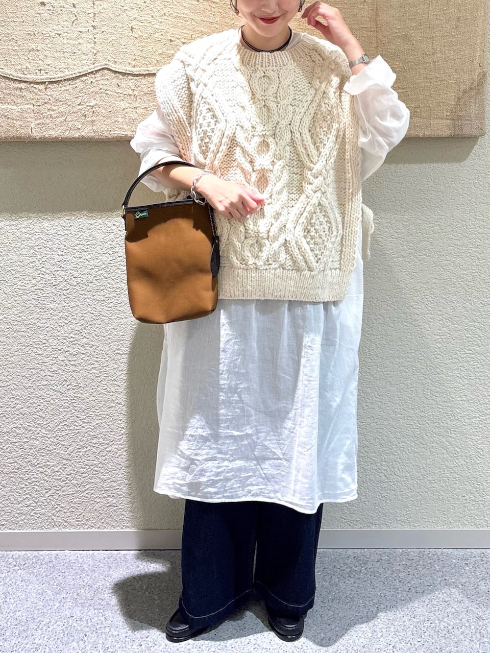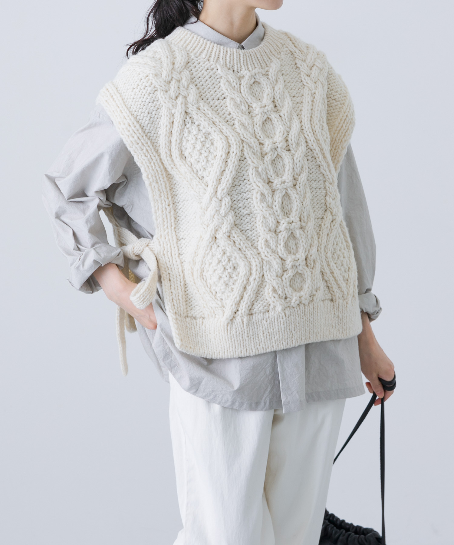 ペルー産の上質な糸で編み立てたアランニットベスト。立体的な編み模様が存在感を放ち、コーディネートに温かみを添えます。チュニックシャツに重ねることで、柔らかいオフホワイトのトーンが引き立ち、奥行きのあるレイヤードスタイルに。