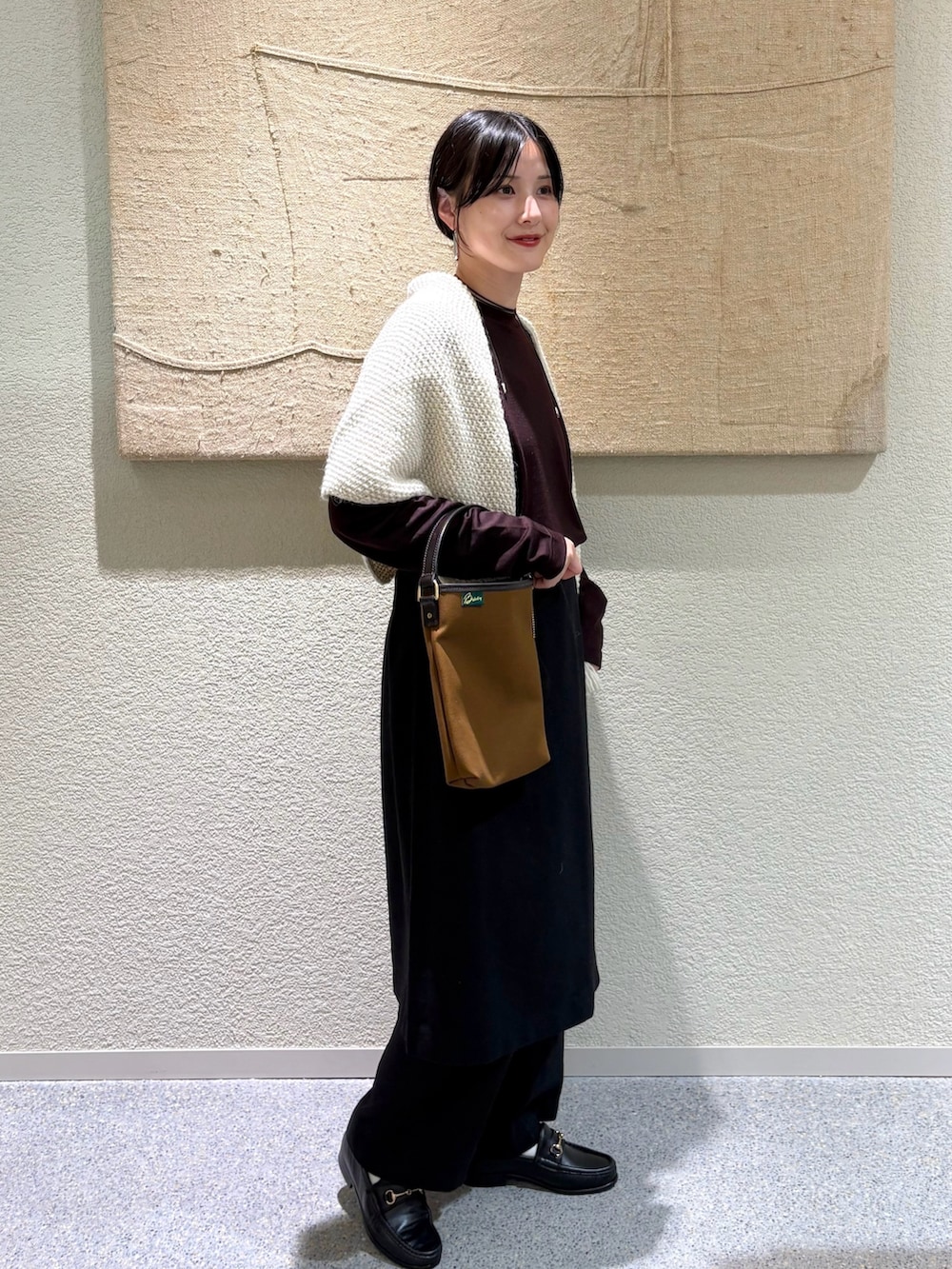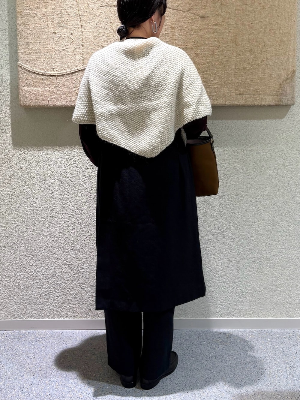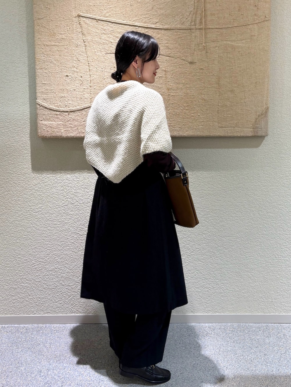 ・アイボリーのストールで柔らかさをプラスし、全体のバランスを整える