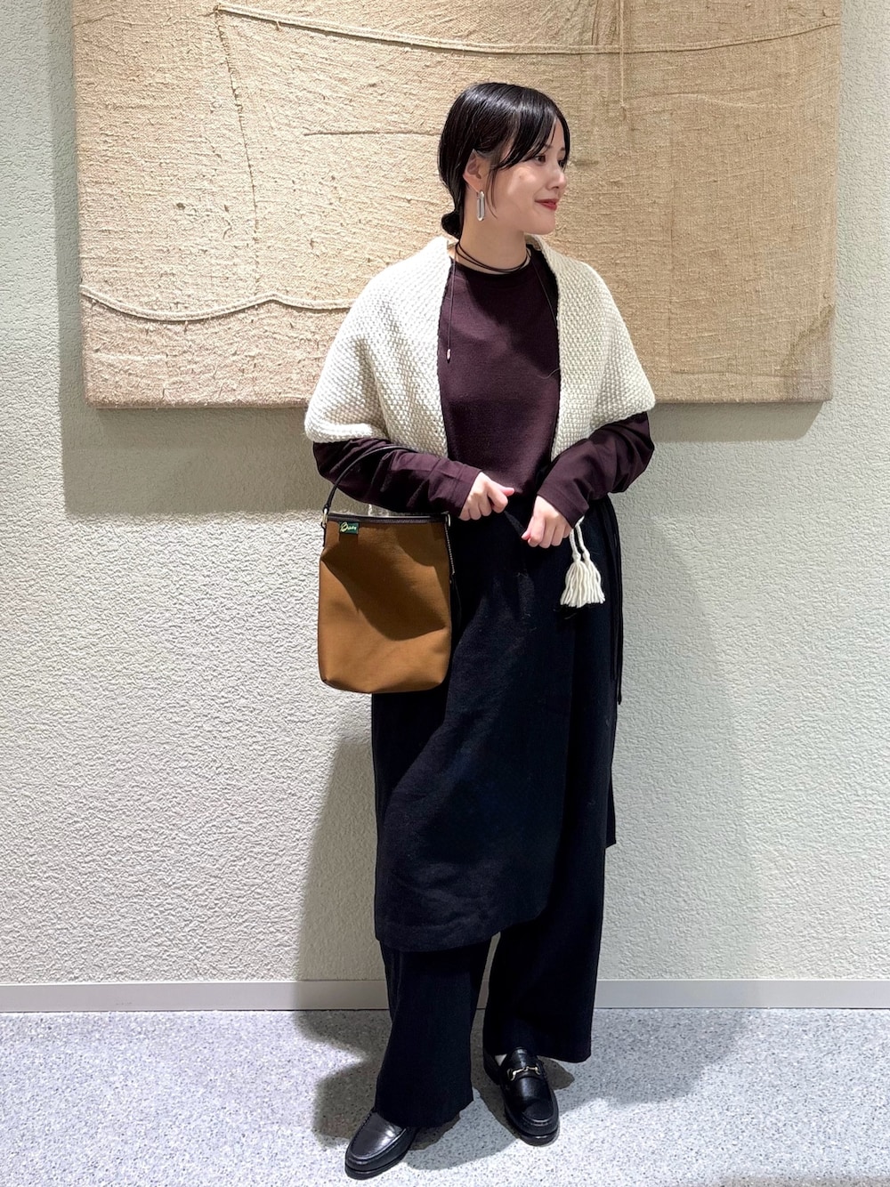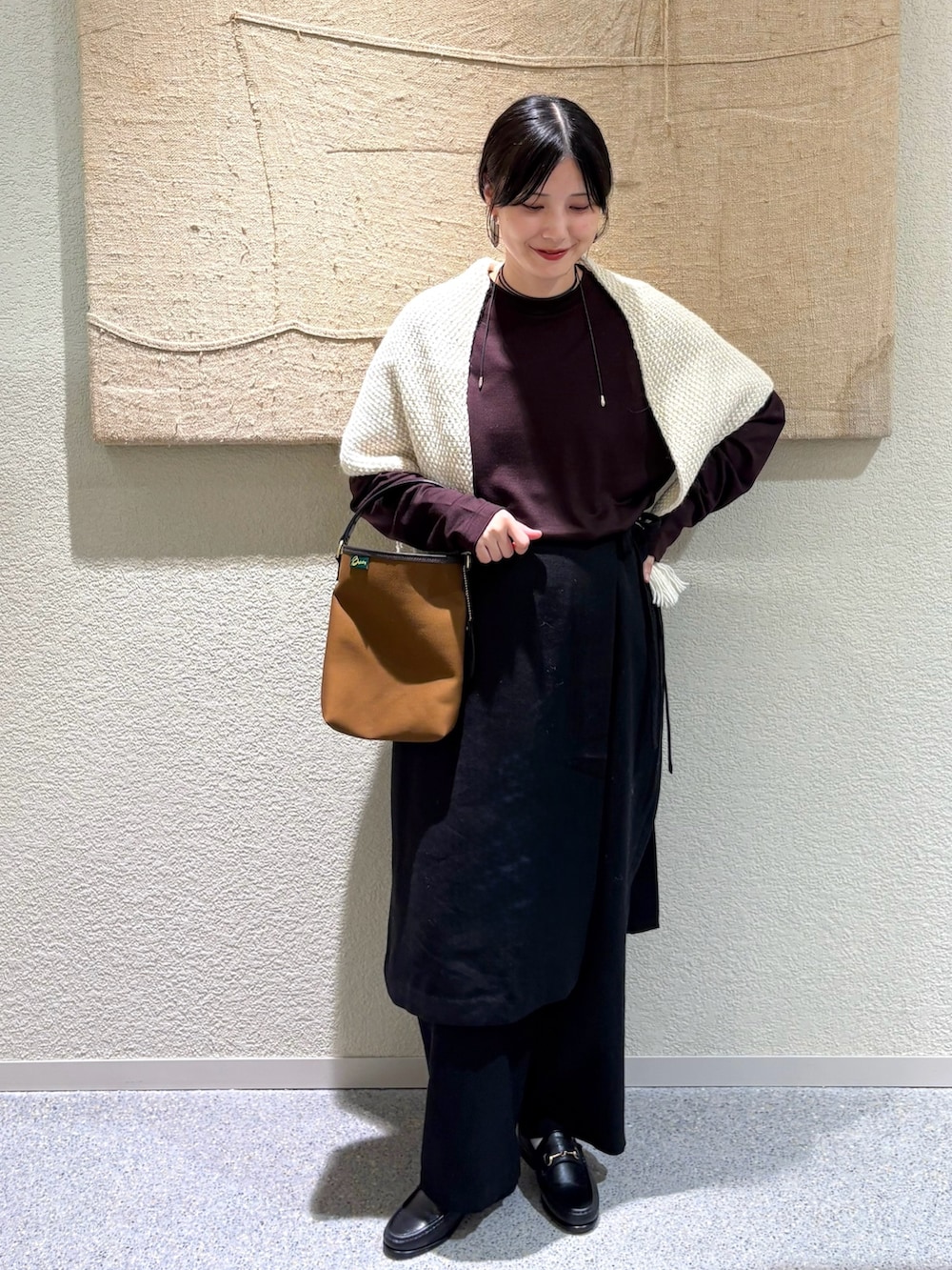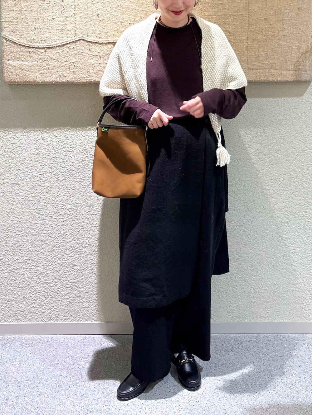 ・アイボリーのストールで柔らかさをプラスし、全体のバランスを整える