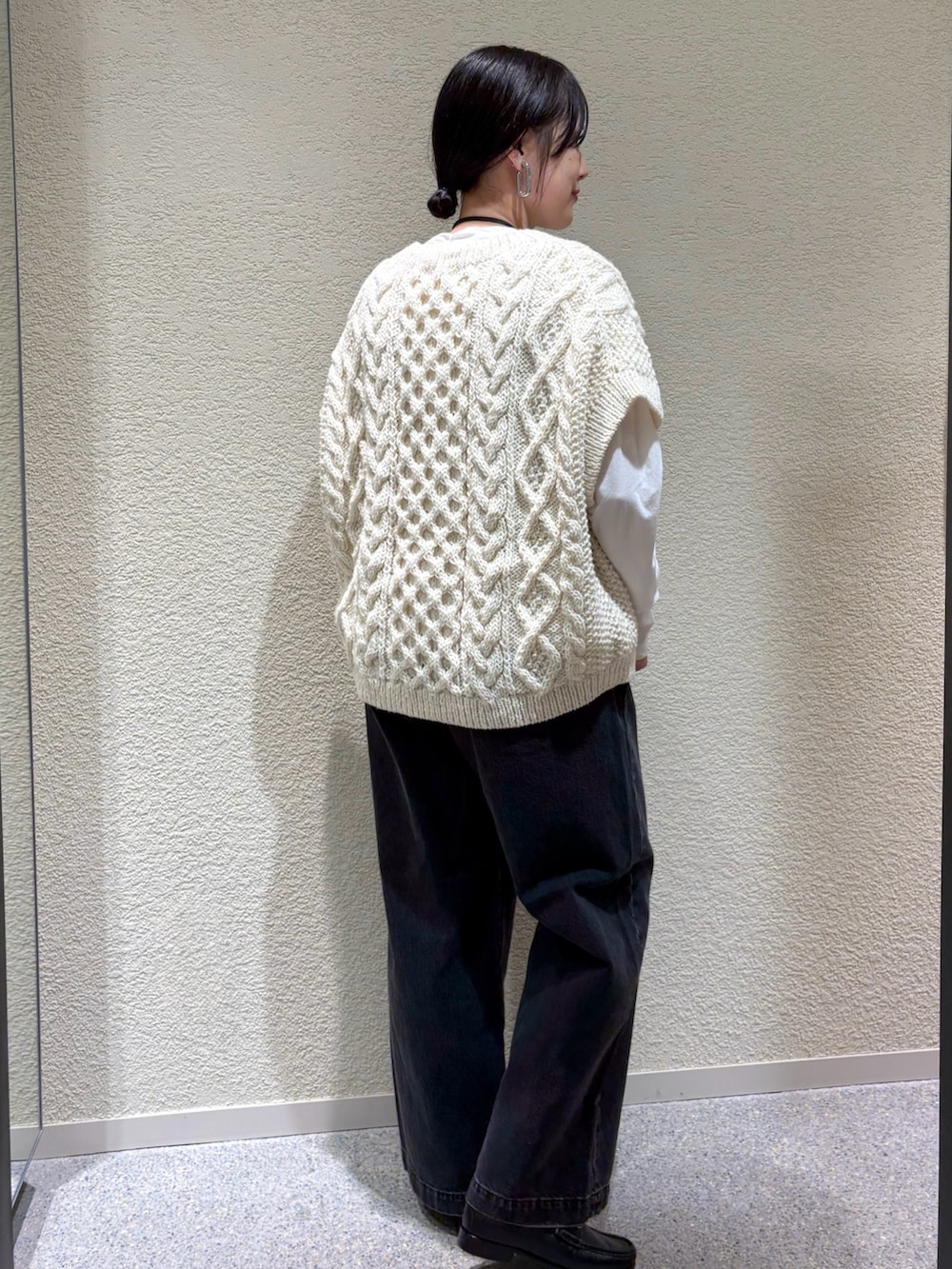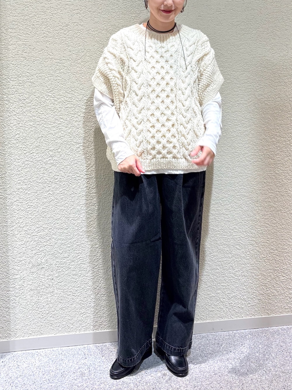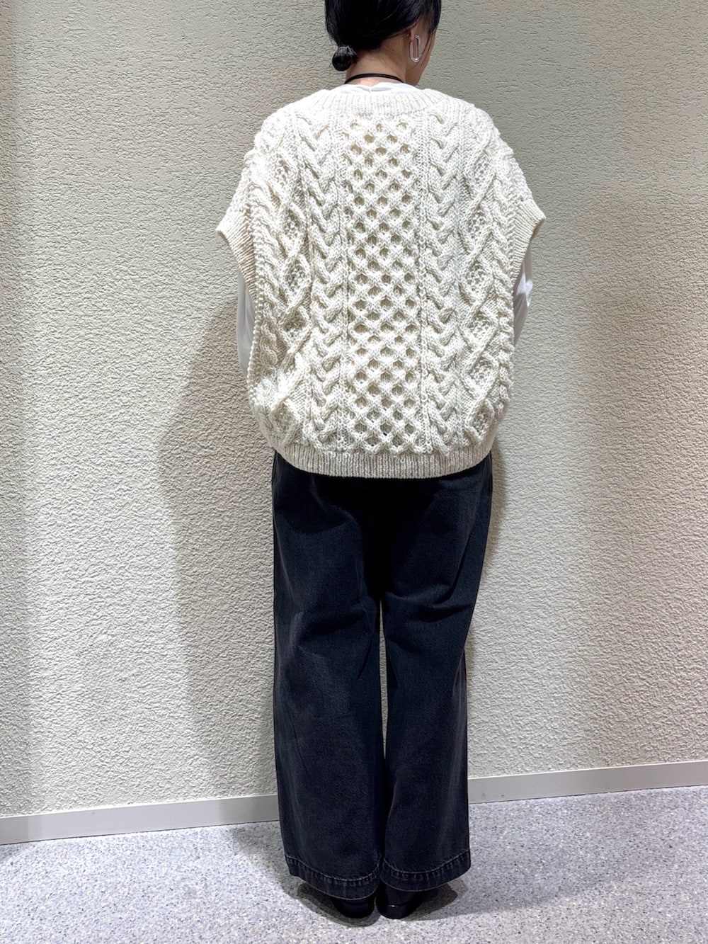 ペルー製の温かみあるウール糸で編まれたアランニットベスト。ワイドなシルエットとざっくりとした編み地が特徴で、レイヤードするだけで季節感のあるスタイルに。アイボリーの優しい色合いが、全体に柔らかい印象を与えます。