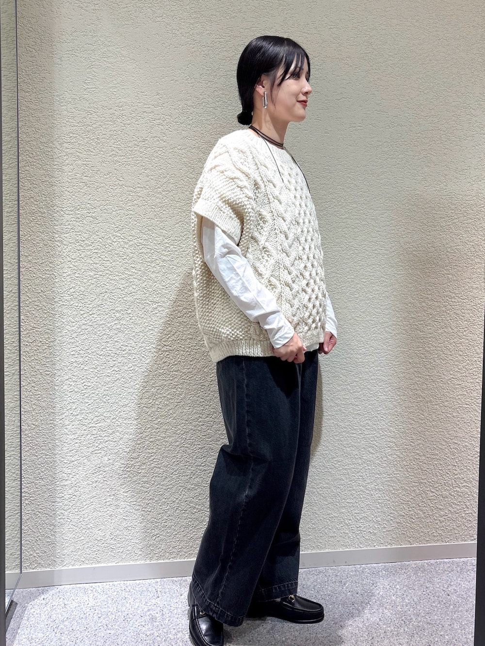 ・ワイドベストで立体感をプラスし、抜け感のある大人カジュアルに