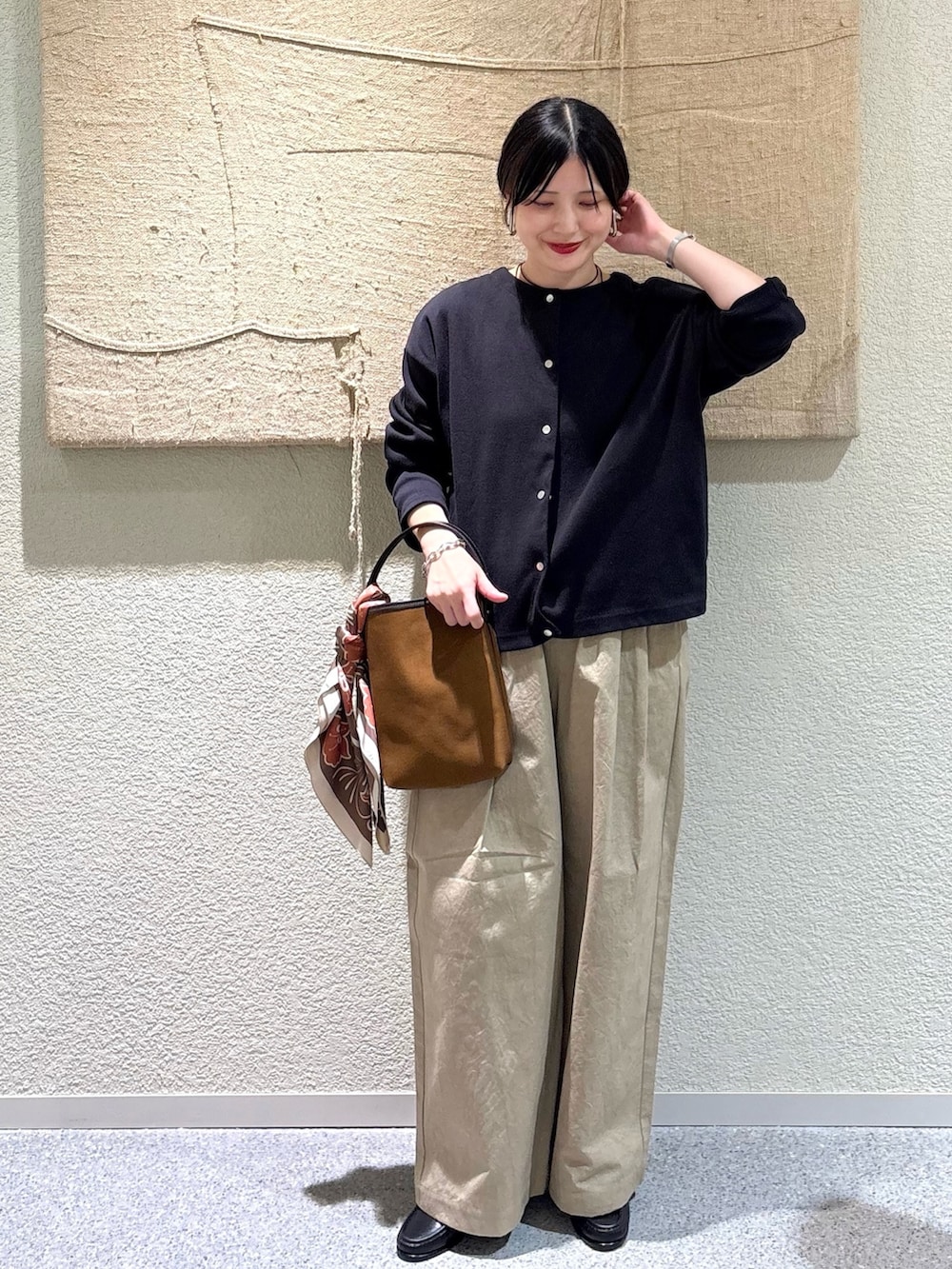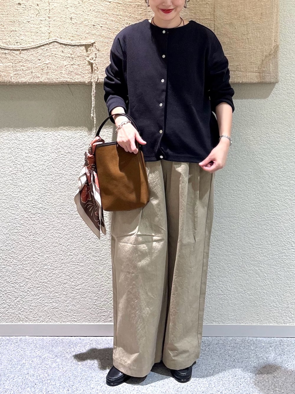 ・スナップカーディガンをトップス風に着て、すっきりとしたシルエットに。