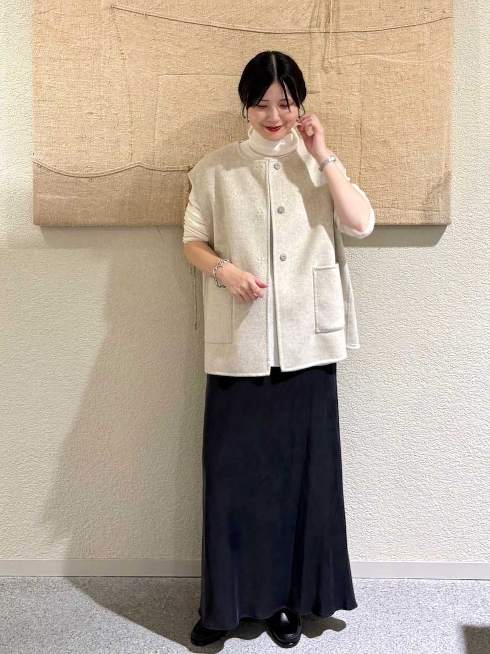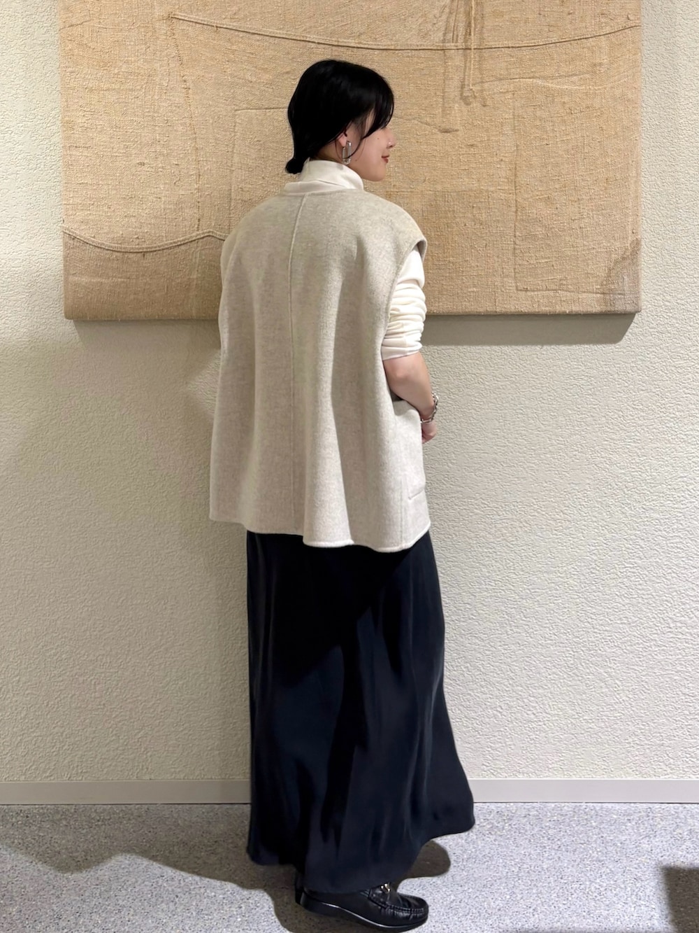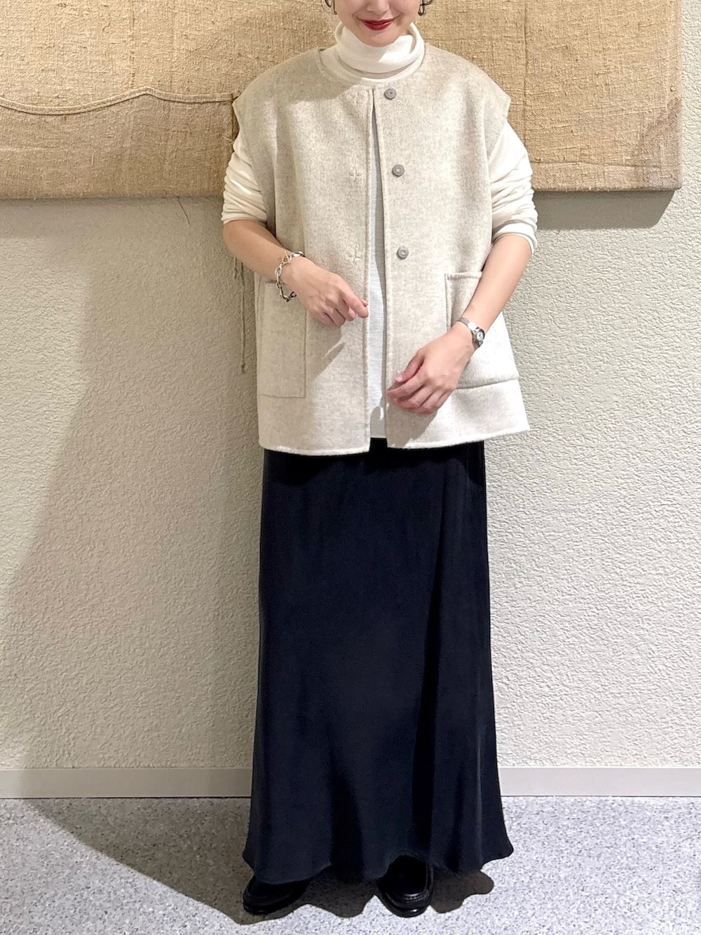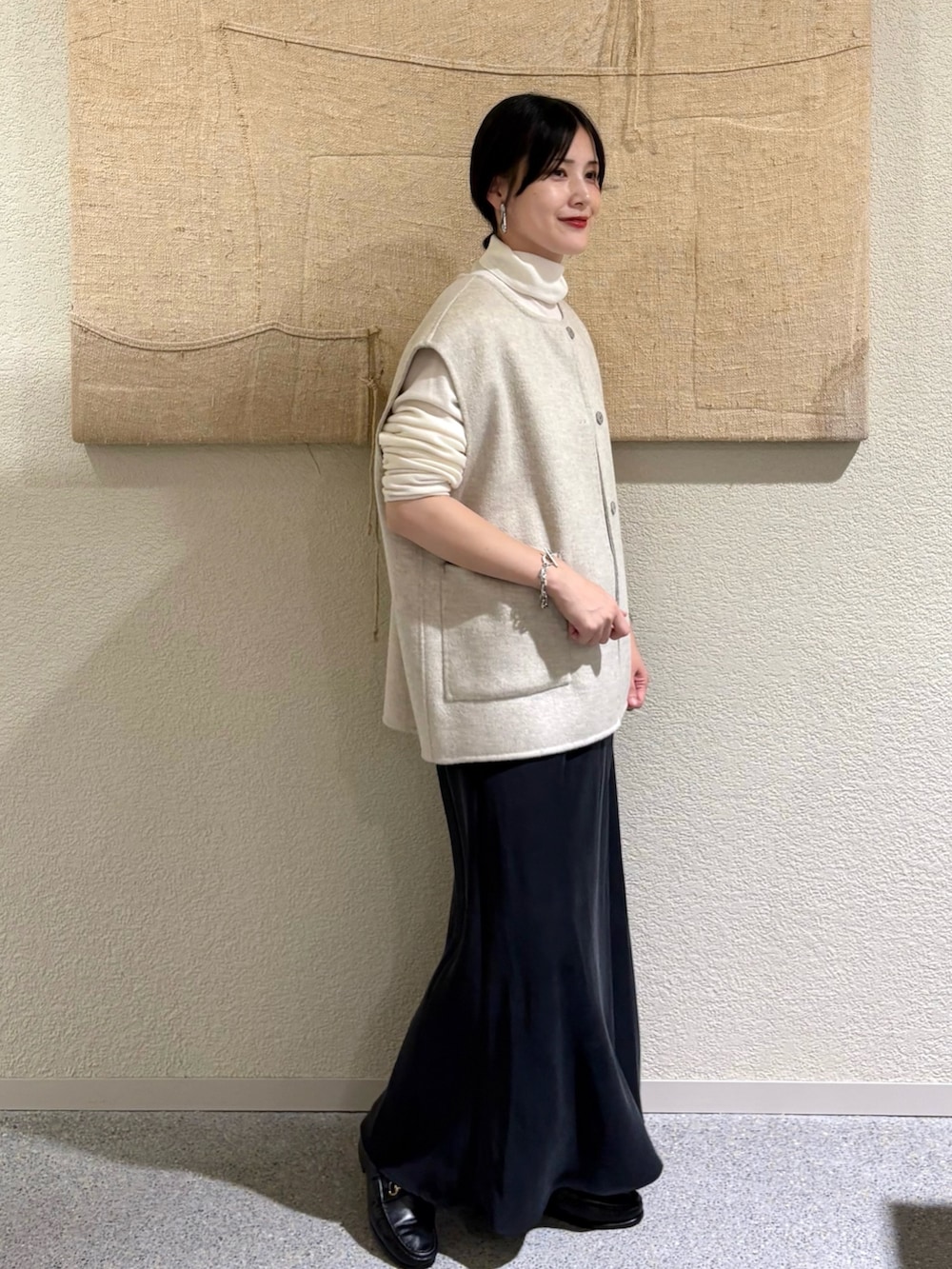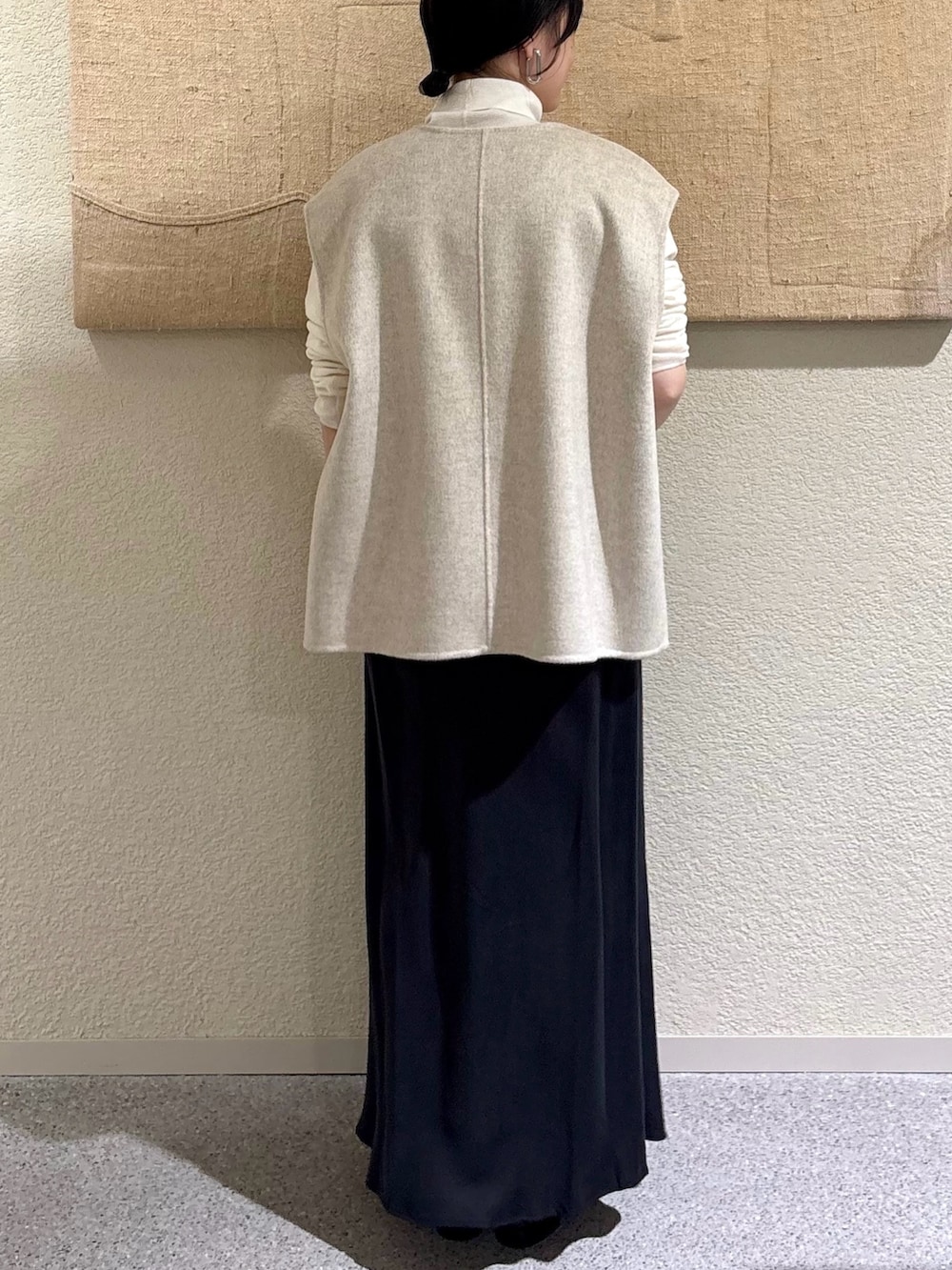 リバー仕立てのウールベスト。ふっくらとした表情で温かみがあり、ショート丈ですっきり重ねられる設計です。オートミールの柔らかな色味がコーデにやさしいニュアンスを加え、タートルとの相性も抜群。