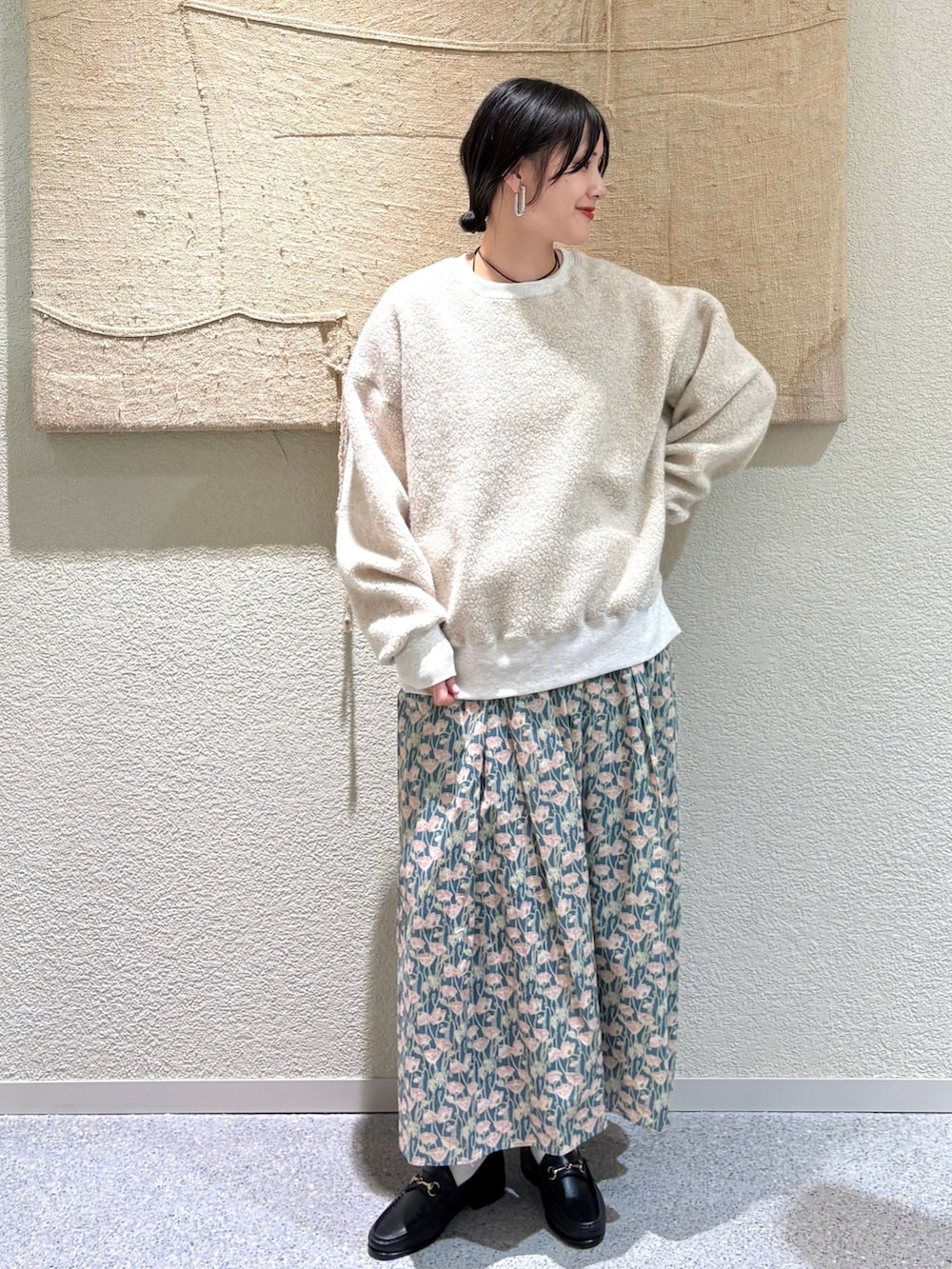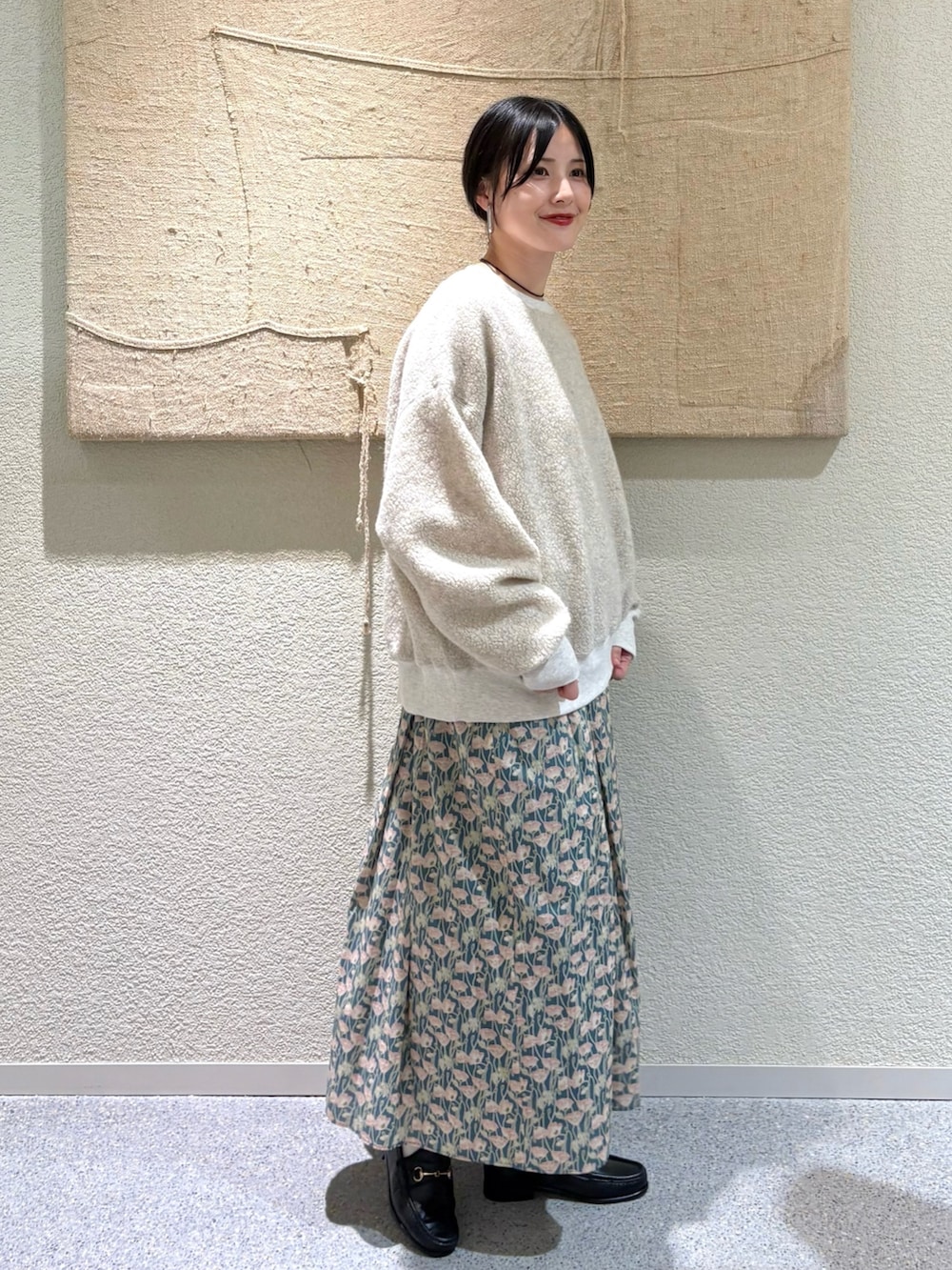 ・ベージュ×華やかなプリントのコントラストで優しげな印象に。