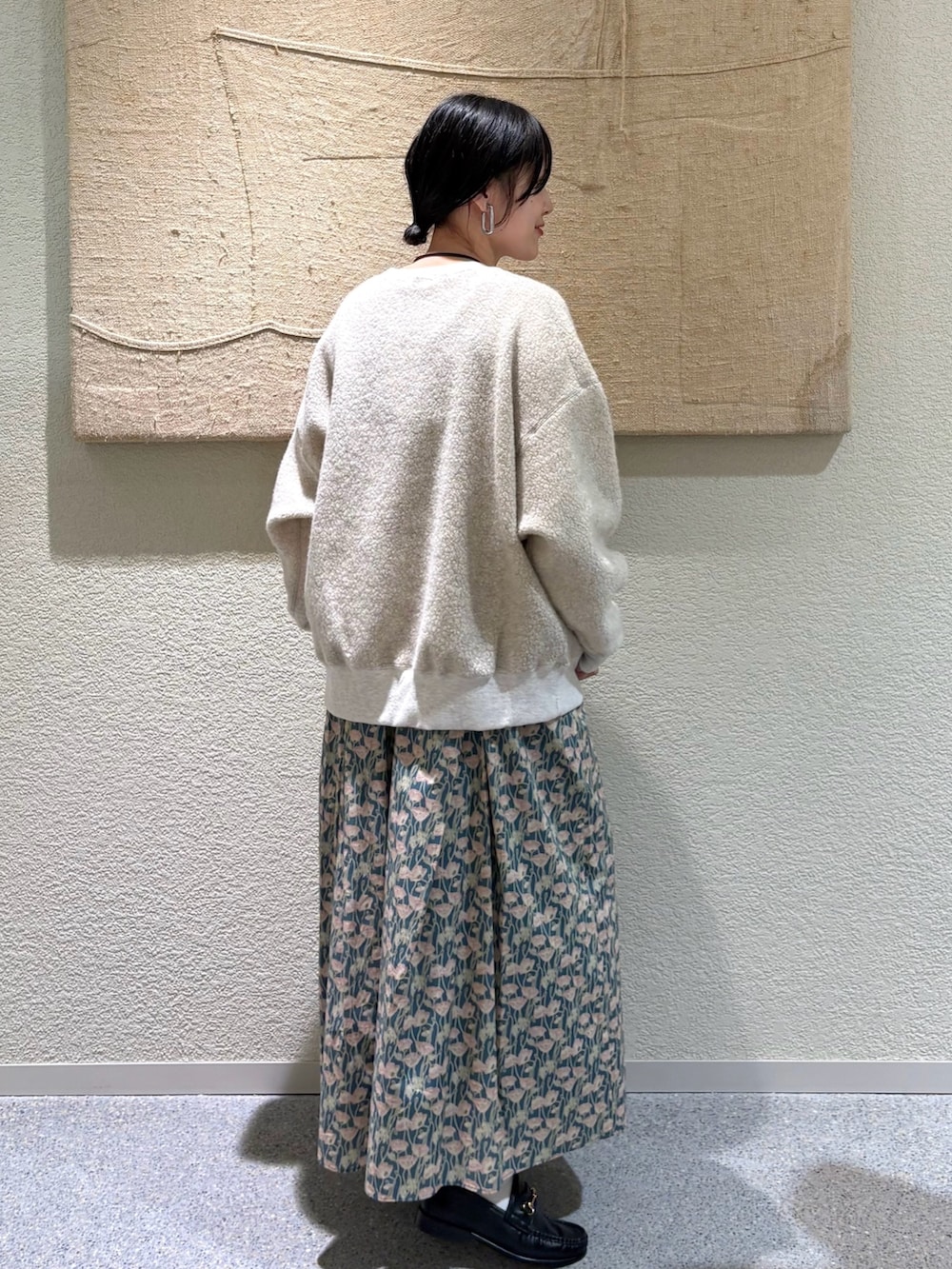 ・ボアの柔らかな質感と花柄スカートの繊細さを掛け合わせた、フェミニンな冬スタイル。
