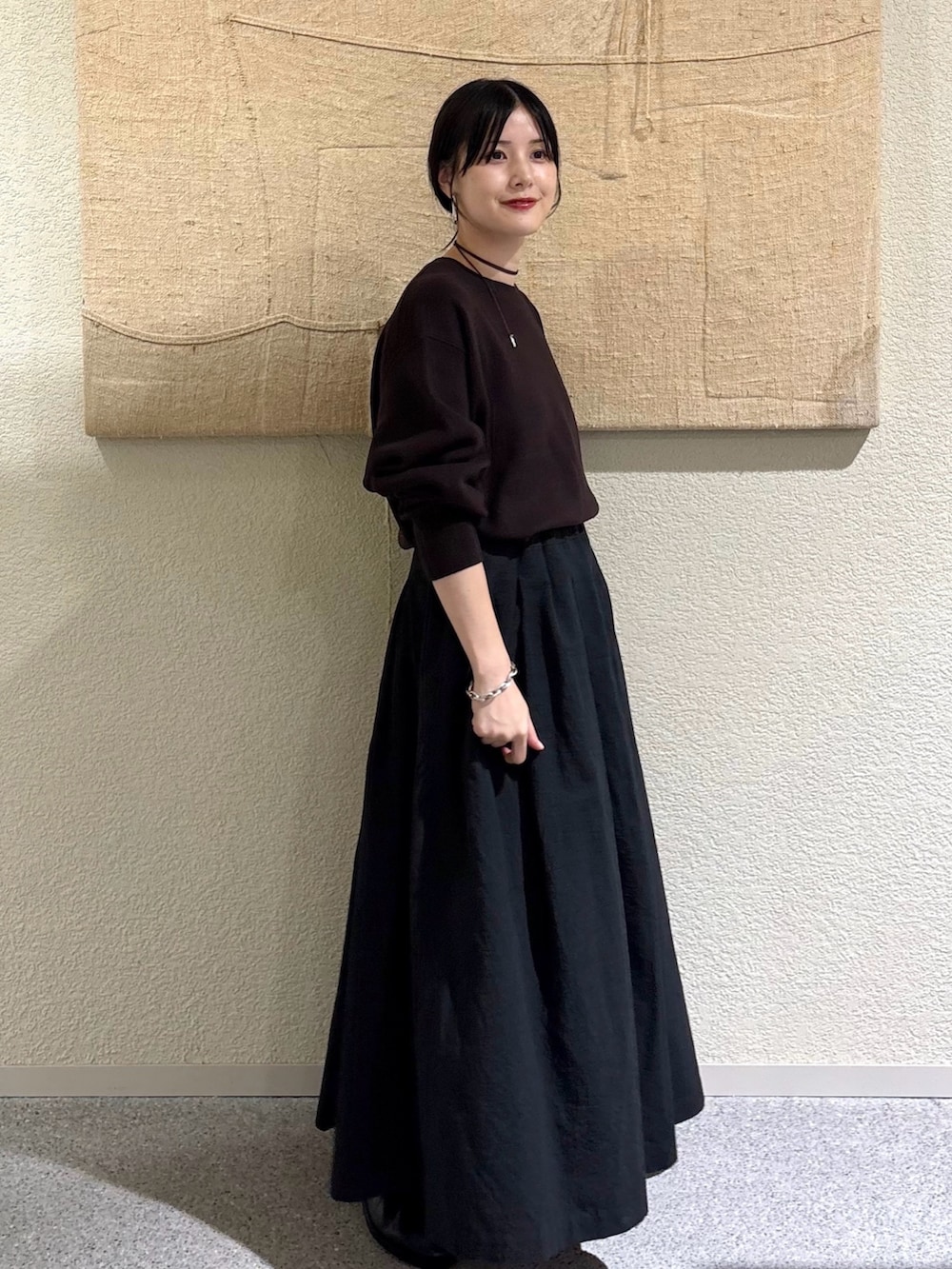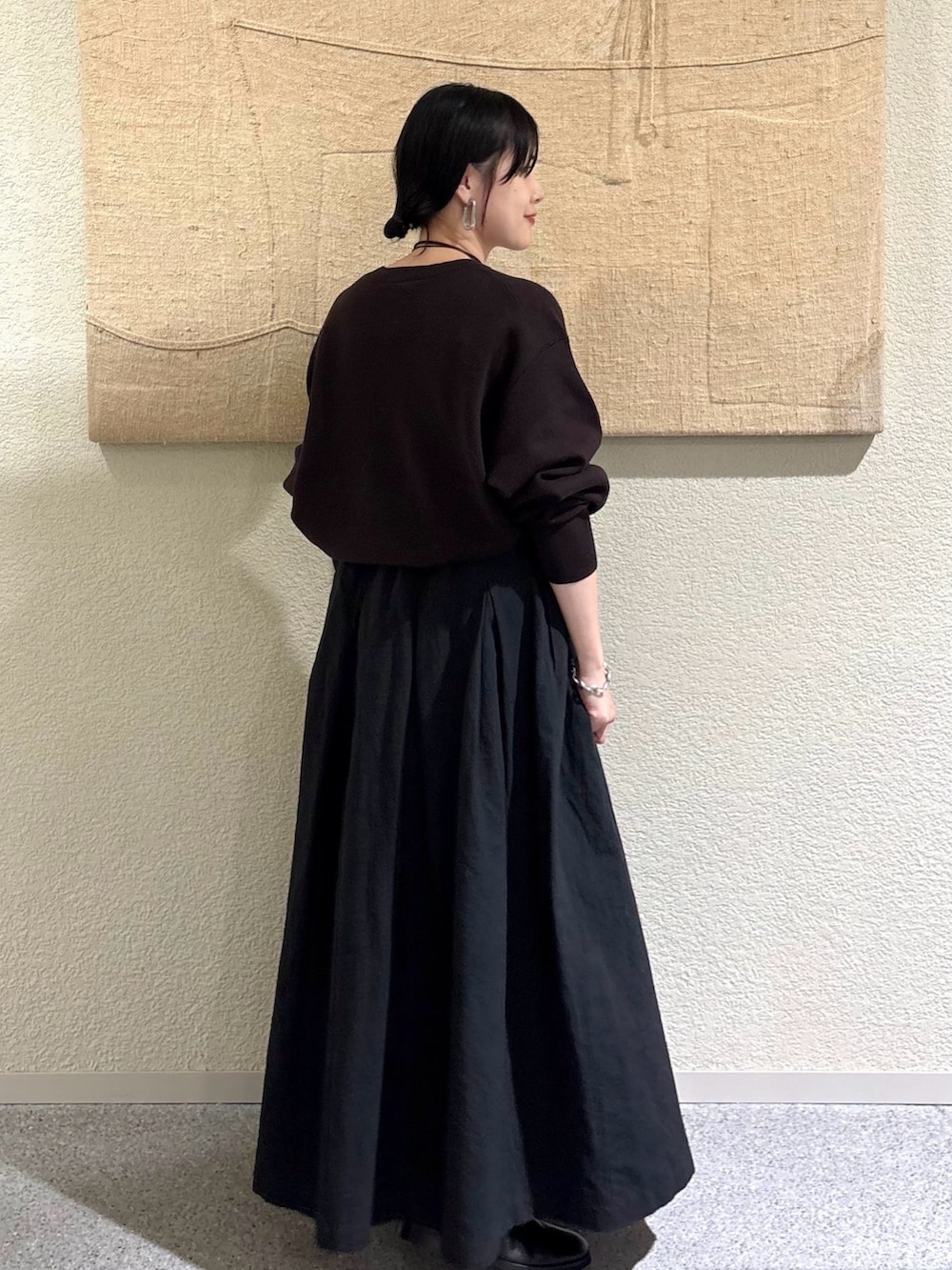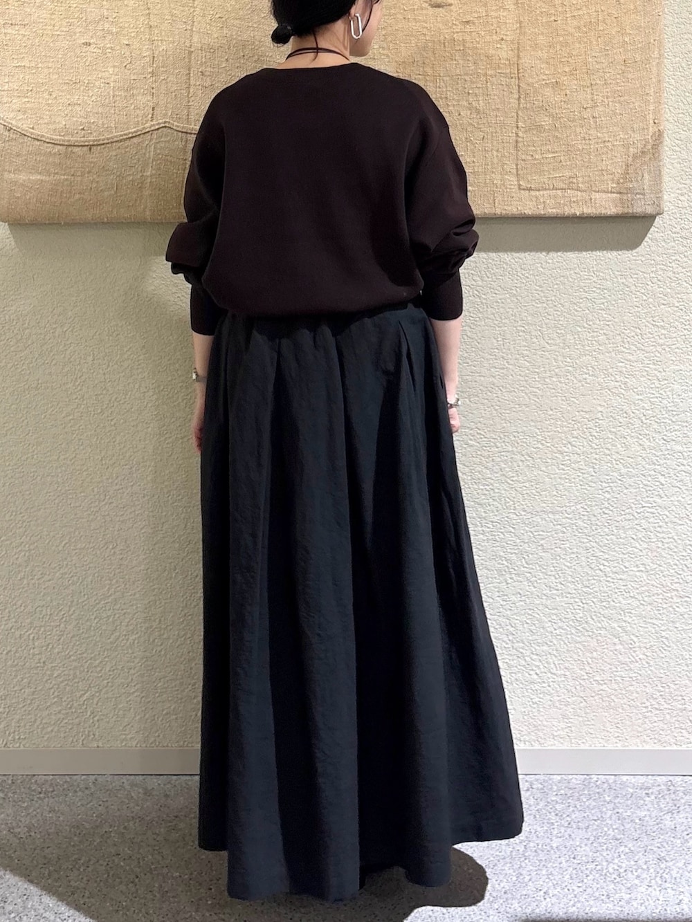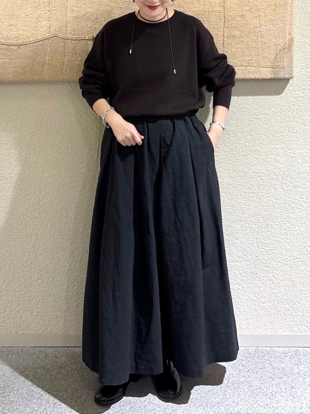 【ボトムス】 かぐれ Tuck skirt BLACK 上品な落ち感が魅力のタックスカート。ほどよく広がるシルエットが女性らしさを引き立て、BLACKカラーでスタイリングを引き締めます。ウエストまわりはすっきりとしており、タックの立体感で自然な動きを演出。オンオフ問わず活躍する万能アイテムです。