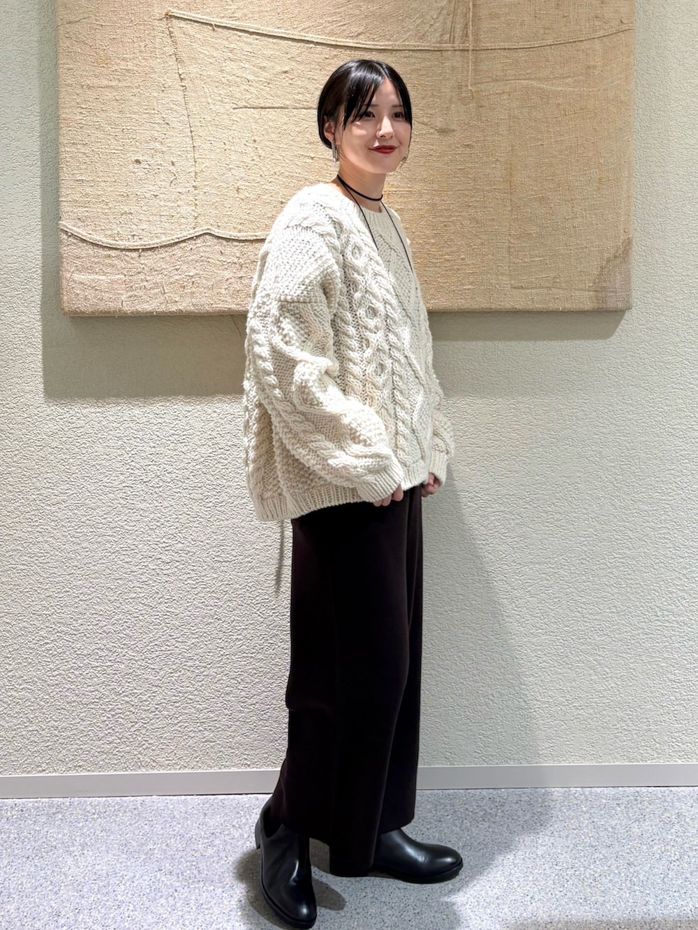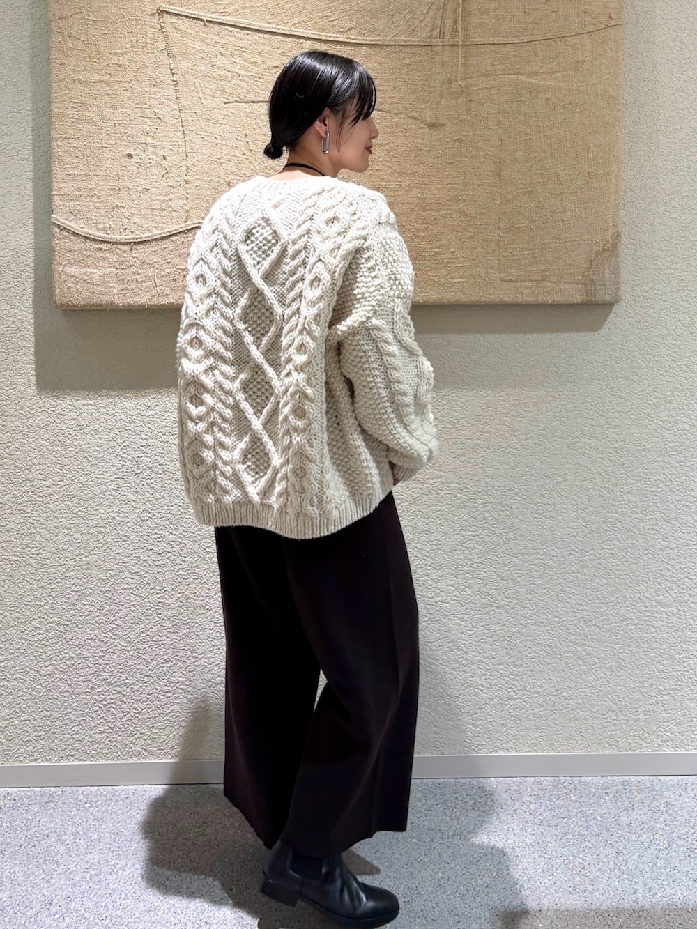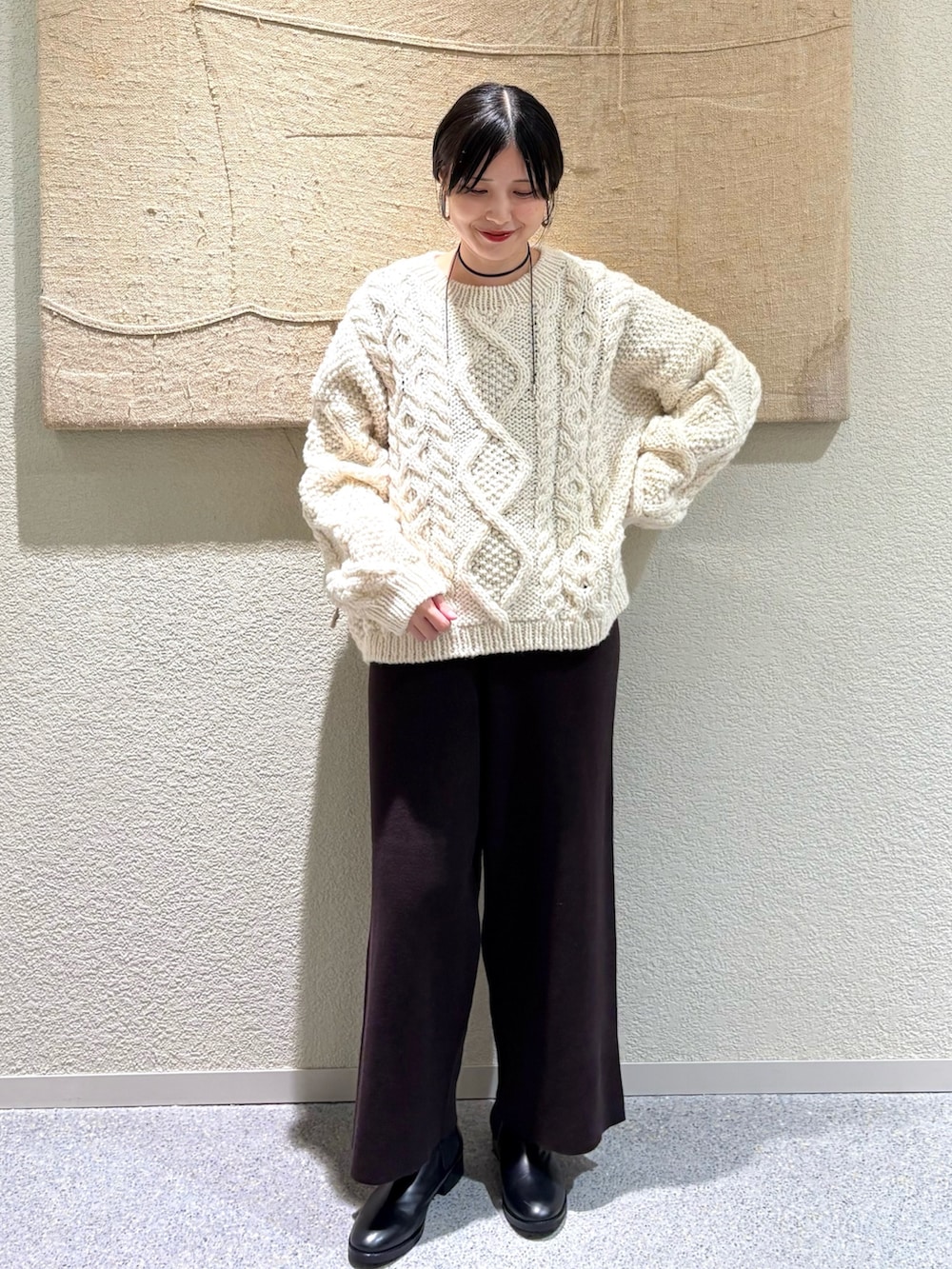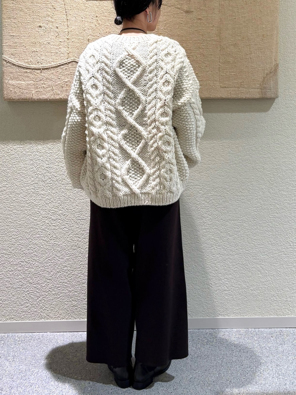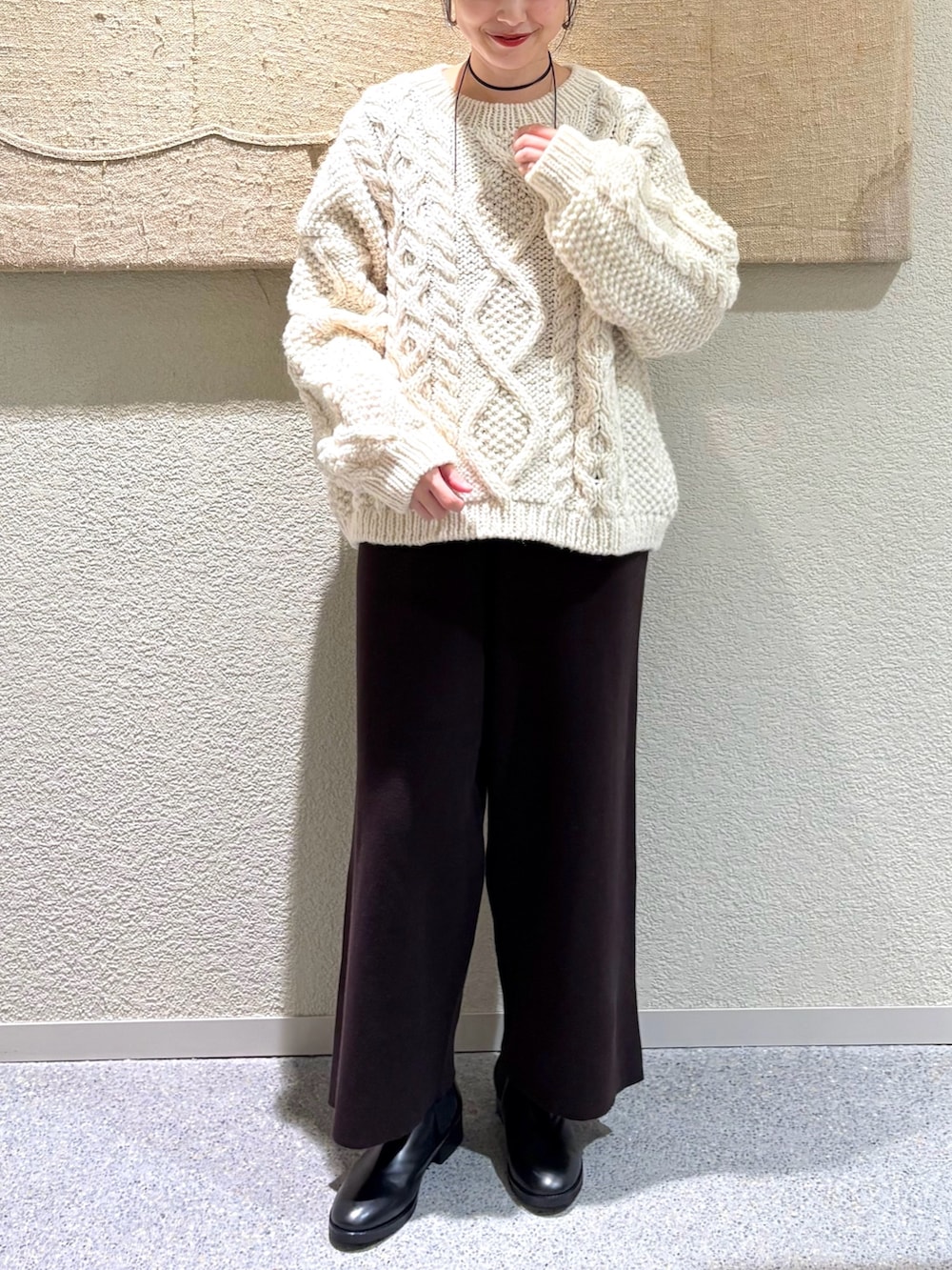 手編みのような温もりを感じるペルー製のアランニット。程よくボリュームのある編み地ながら軽やかで、ゆったりとしたシルエットが魅力です。アイボリーの優しい色合いが冬のスタイリングに柔らかさをプラス。