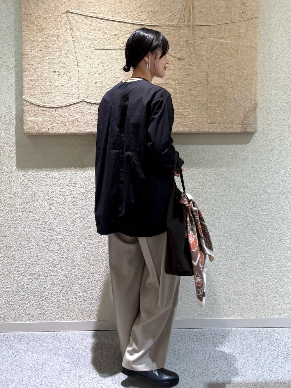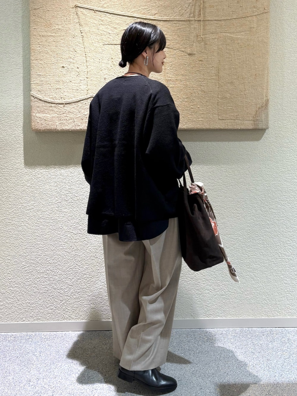・インナーのプルオーバーシャツを見せて奥行きのあるモノトーンスタイルに
