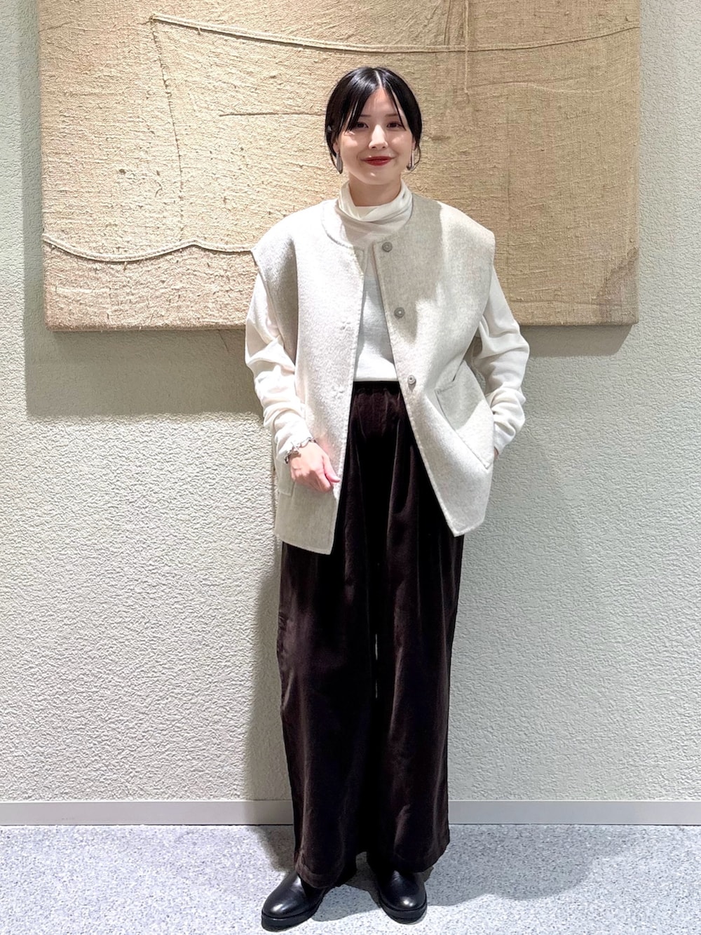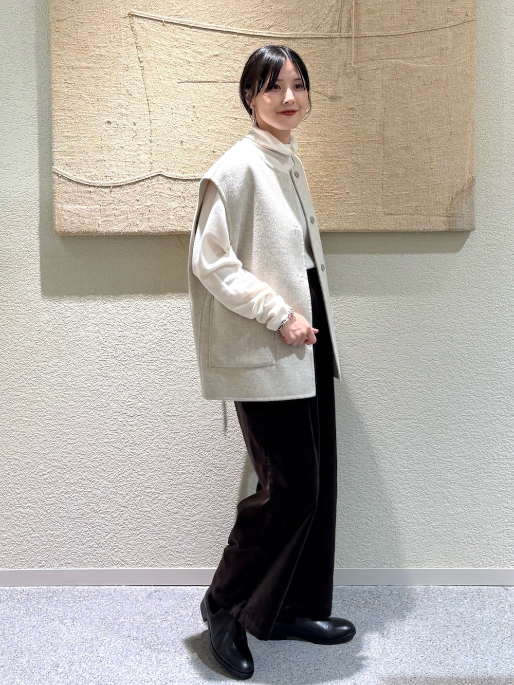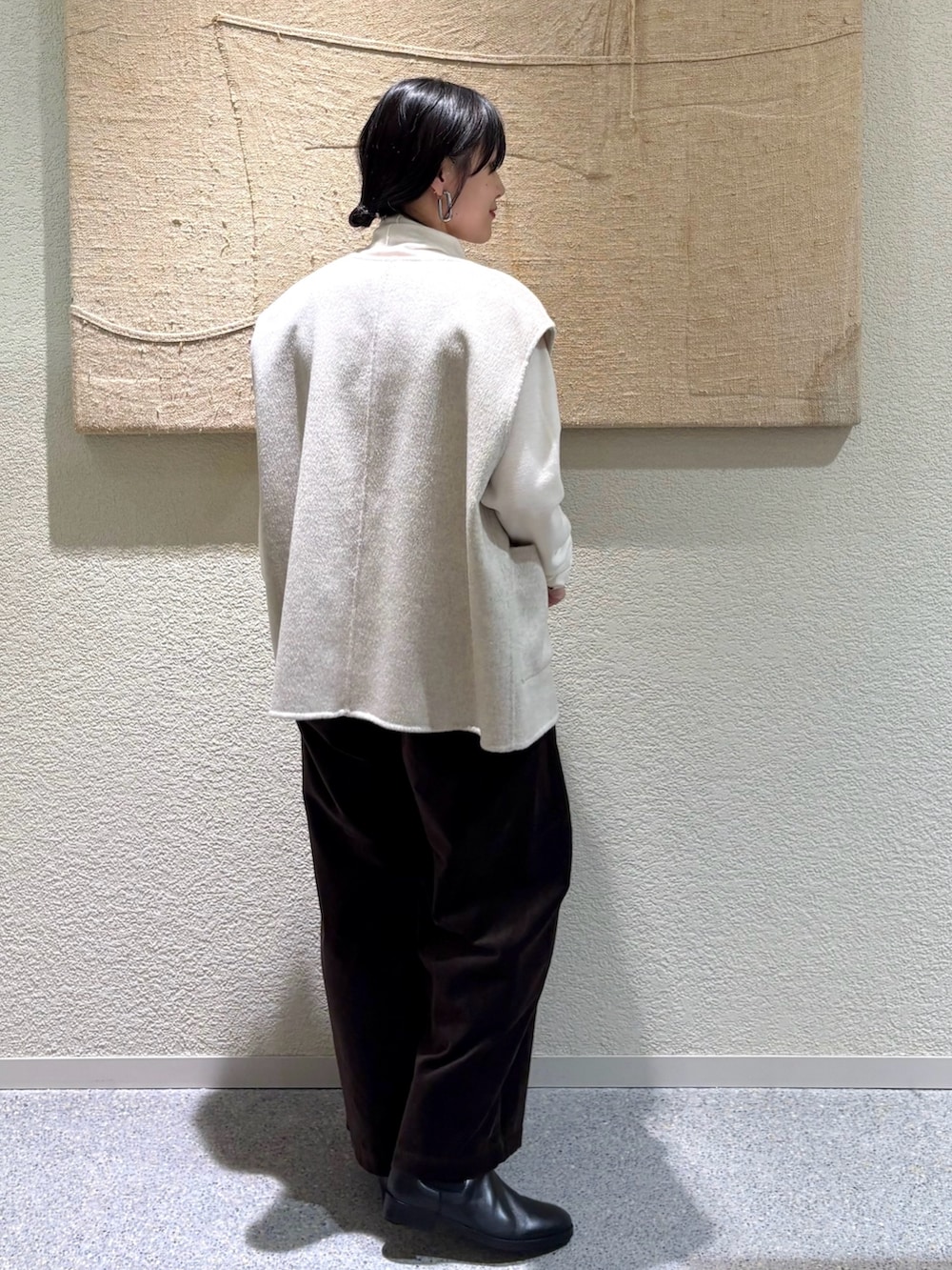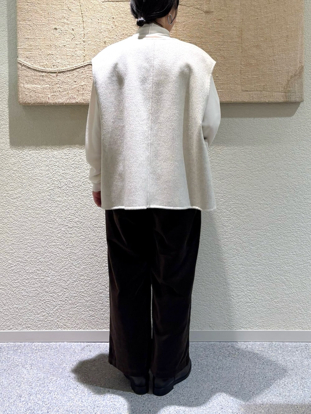 軽やかで暖かいウールリバー素材のベスト。すっきりとしたVネックと長めの丈感が縦のラインを強調し、スタイルアップ効果を演出。レイヤードするだけで大人の抜け感をプラスします。