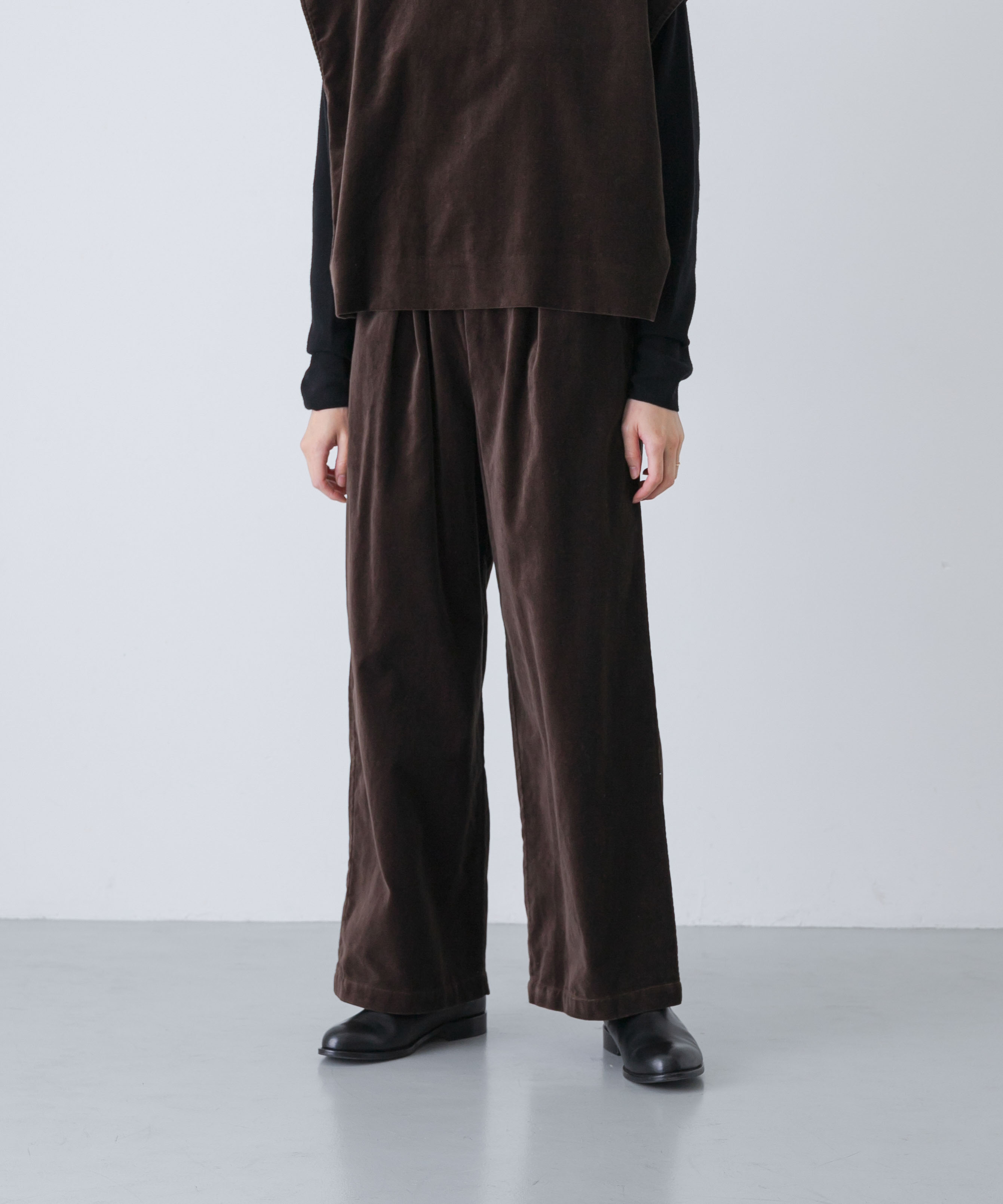 やわらかく光沢のあるベルベット素材を使用したイージーパンツ。ウエストゴム仕様でリラックス感がありながらも、上品な艶感で秋冬らしいムードを引き立てます。