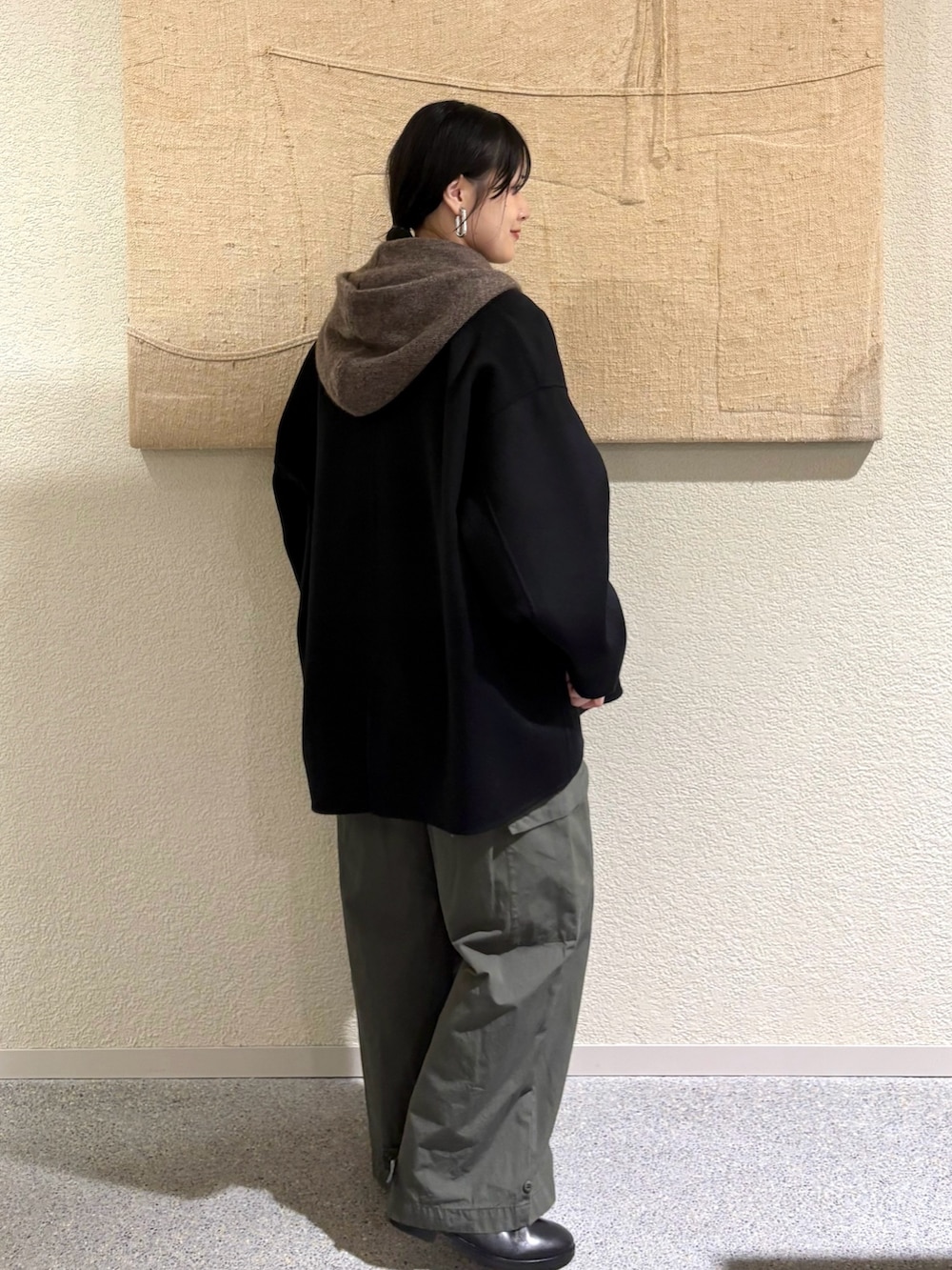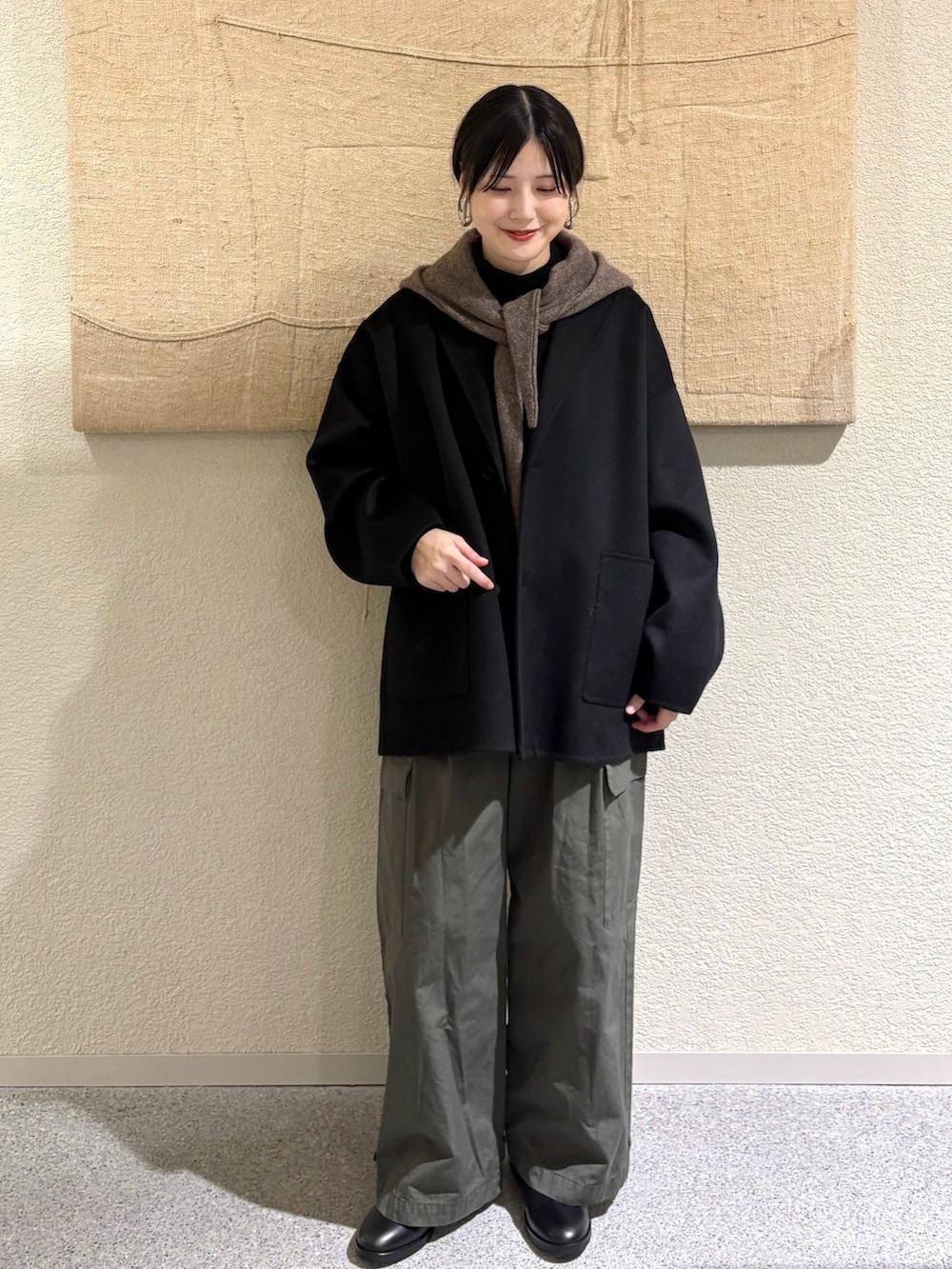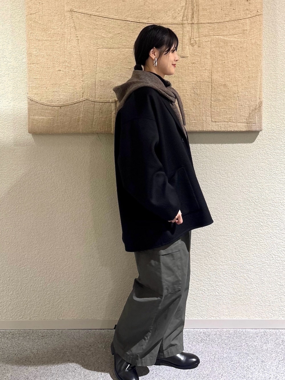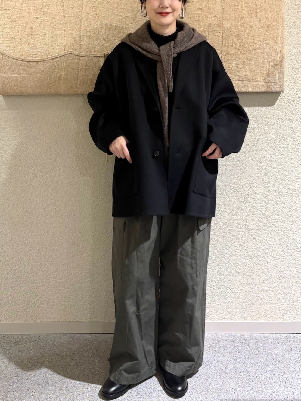 ・ショートコート×ワイドパンツのバランスで程よい抜け感を演出