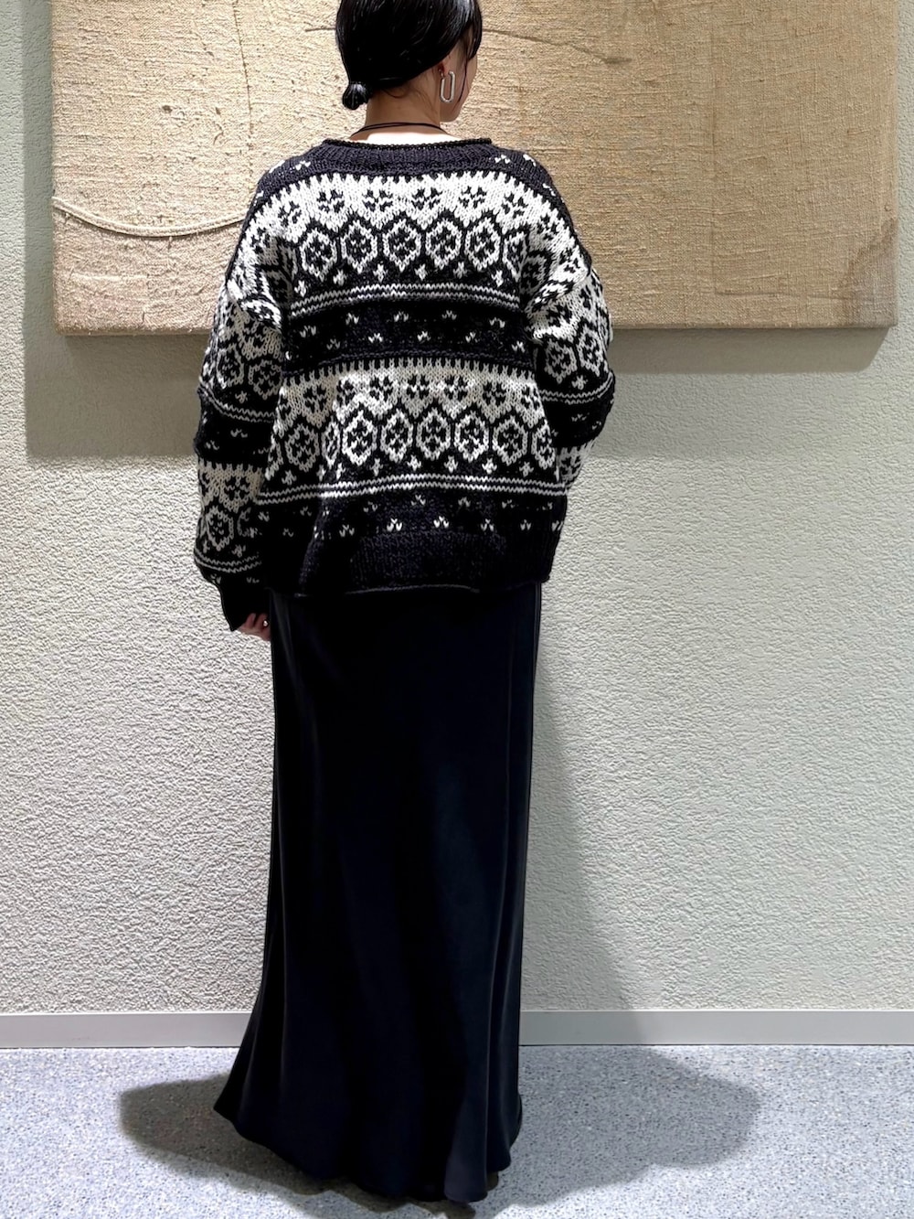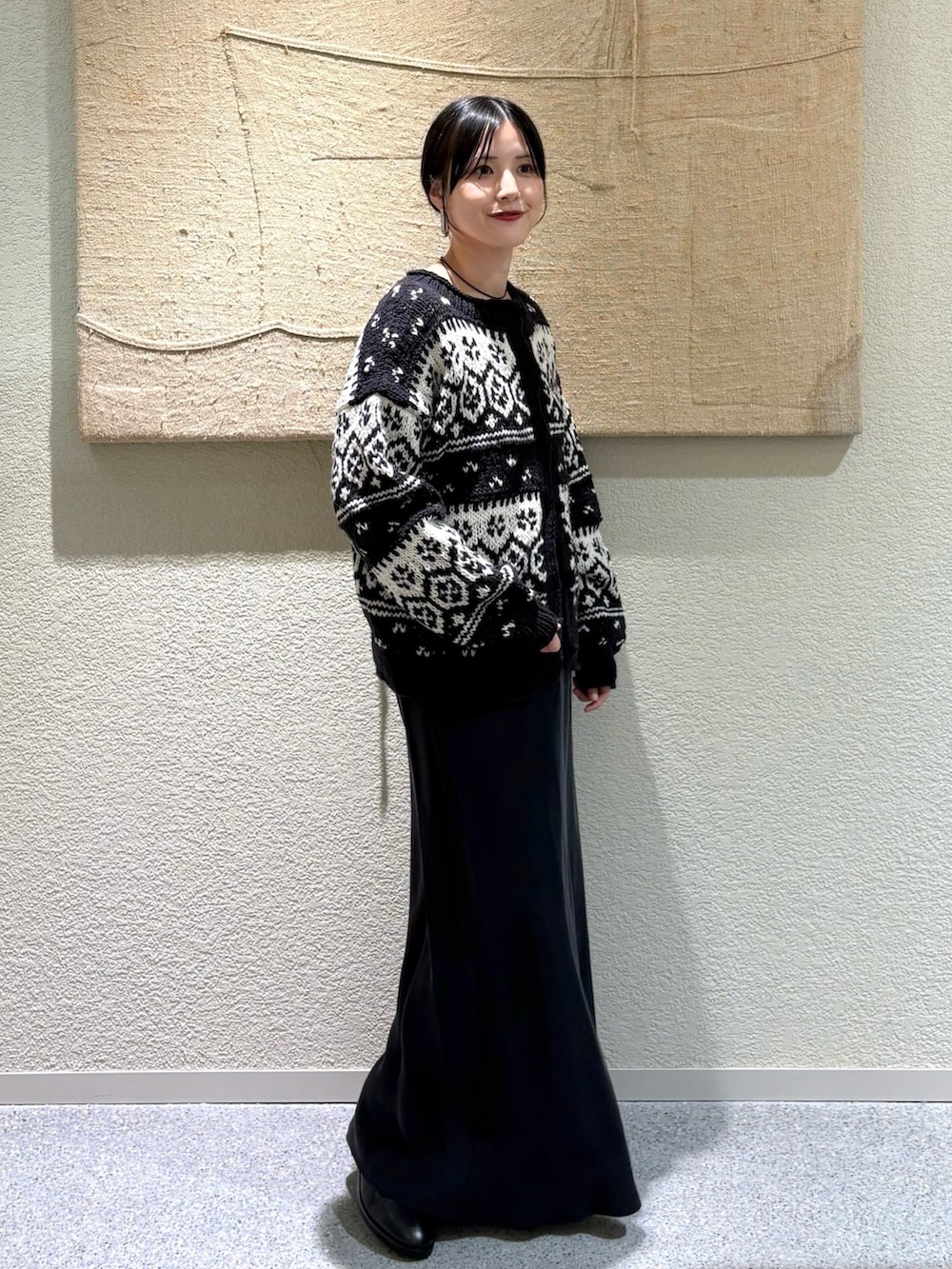 上品な光沢と滑らかな落ち感が魅力のキュプラスカート。歩くたびに揺れるシルエットが女性らしく、シンプルながらも洗練された印象です。ノルディックカーディガンの存在感を引き立てながら、全体をシックにまとめてくれます。