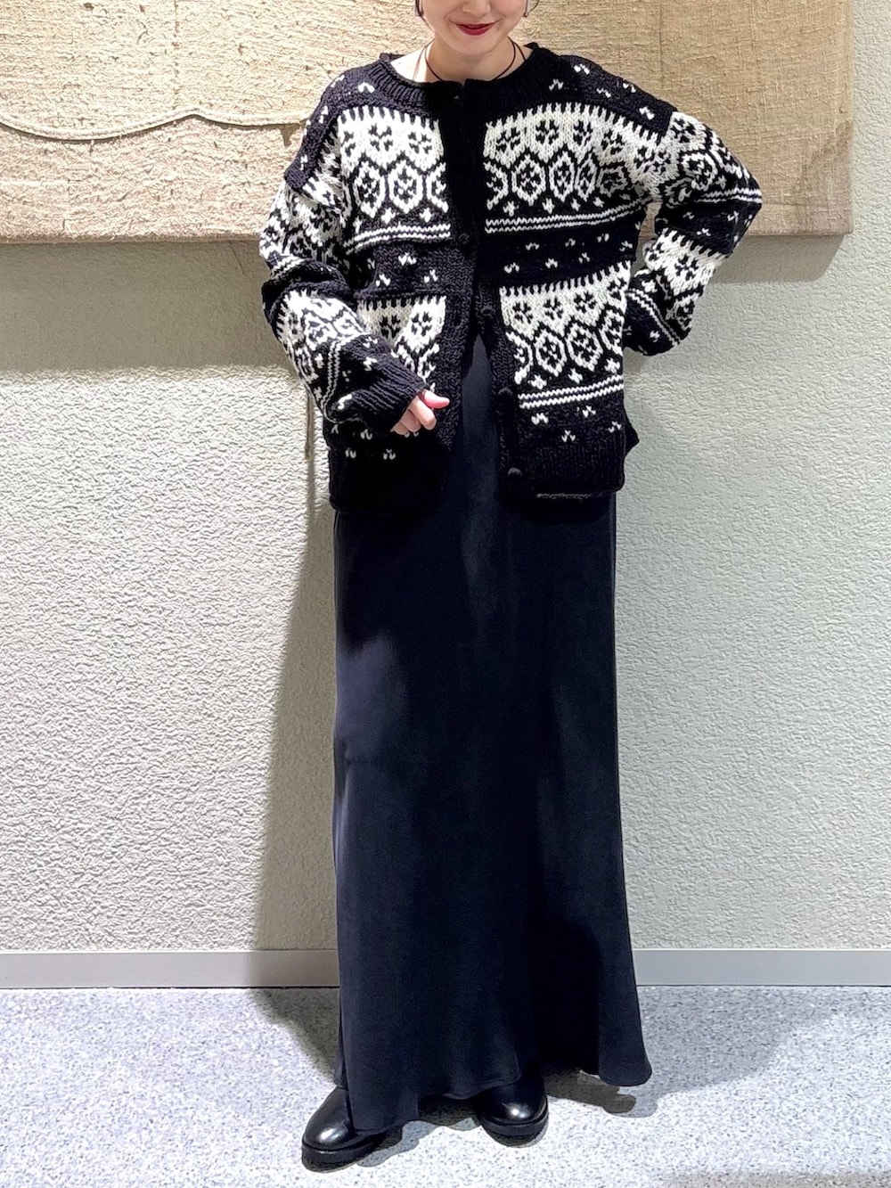温かみのあるペルー製ウールで編み上げたノルディック柄カーディガン。クラシックな模様が冬の装いに映え、1枚で存在感のあるデザインです。程よくゆとりのあるシルエットで、インナーを重ねてももたつかず快適。ブラックベースで大人っぽく落ち着いた雰囲気に仕上がります。