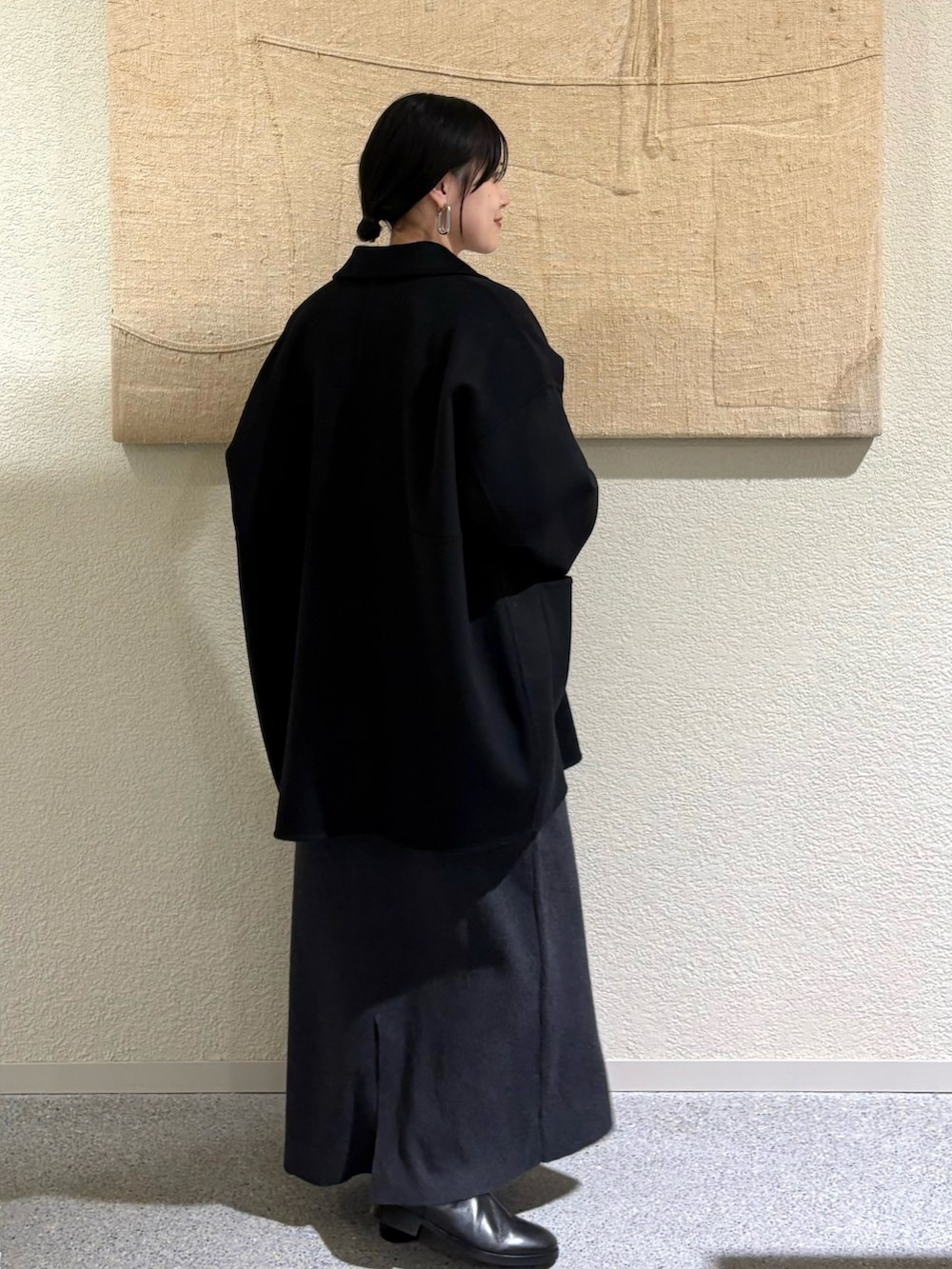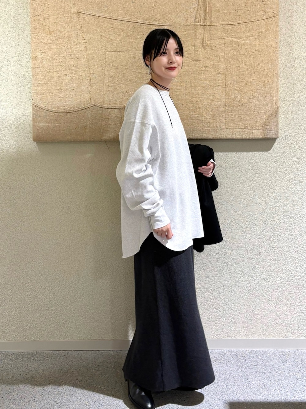 コットンにカシミヤをブレンドした、滑らかで上質なニットスカート。ストレートシルエットが大人っぽく、動くたびに自然な落ち感を演出します。チャコールの深みあるトーンが、ブラックのコートと好相性。