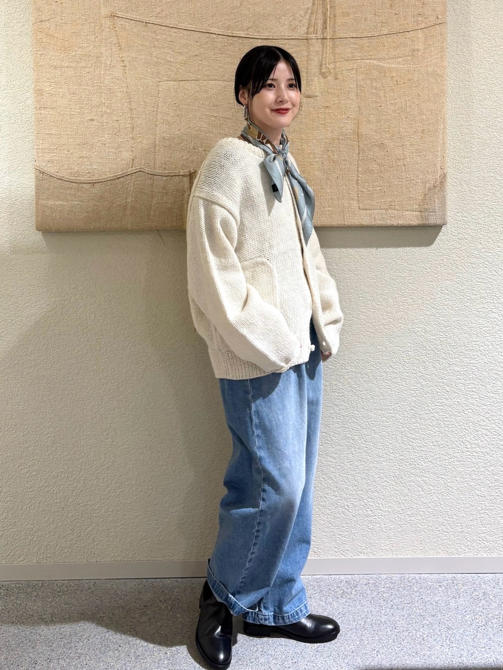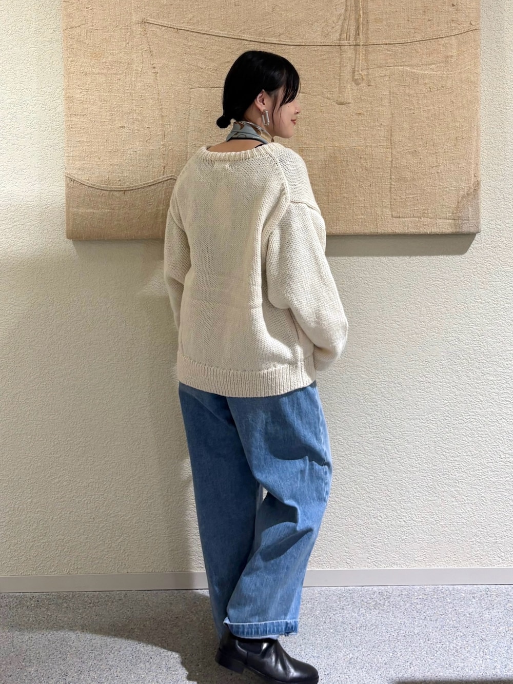 ・ニットの柔らかさとデニムの軽い抜け感でリラックス感のある雰囲気