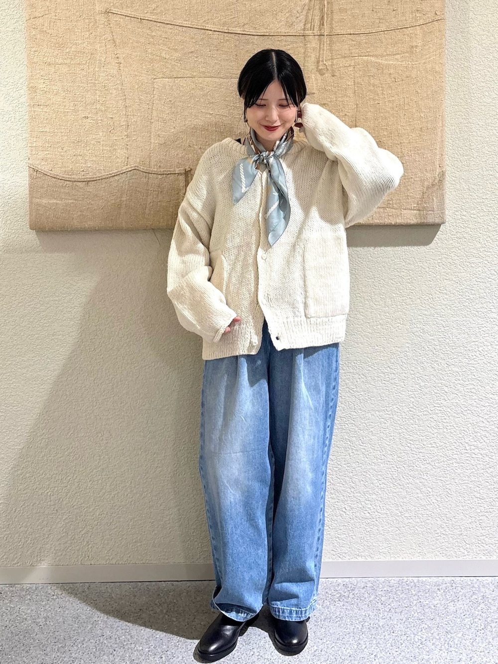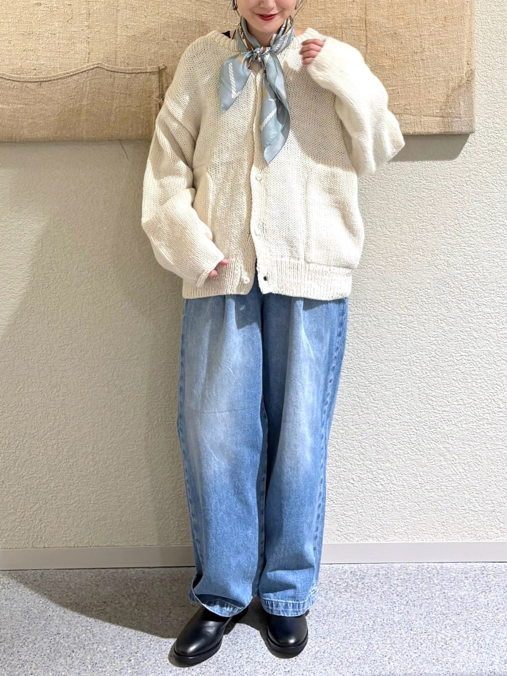 アイボリー×ライトインディゴの柔らかい配色に、淡いブルーのスカーフが爽やかな差し色に。顔まわりがパッと華やぎ、スタイルに奥行きが生まれます。
