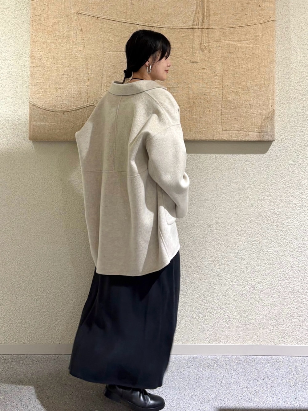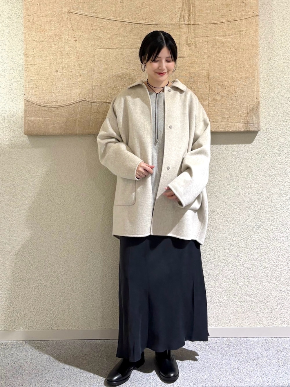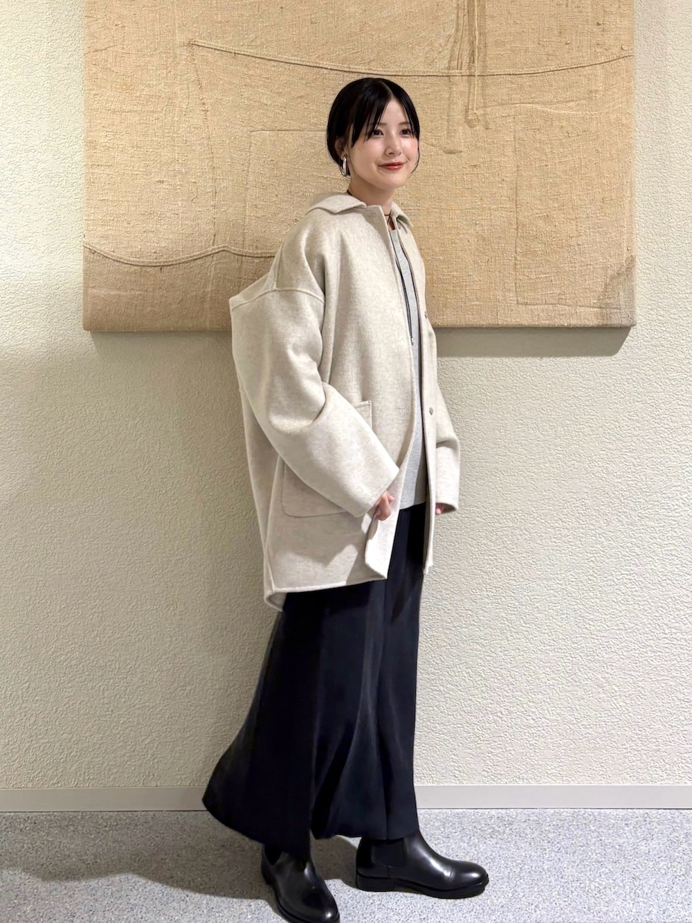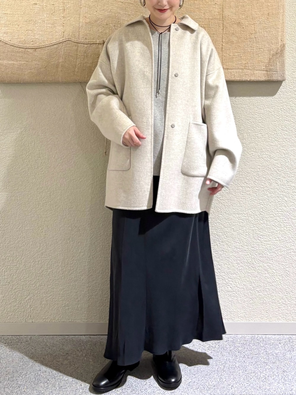 ・ショートコート×ロングスカートで縦ラインを強調し、すっきり見え