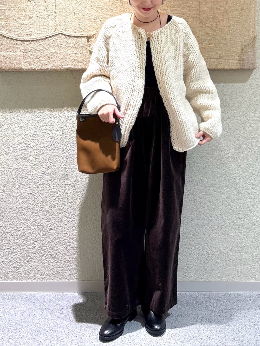• ベルベットの質感が季節感を高め、上品カジュアルにまとまるスタイル