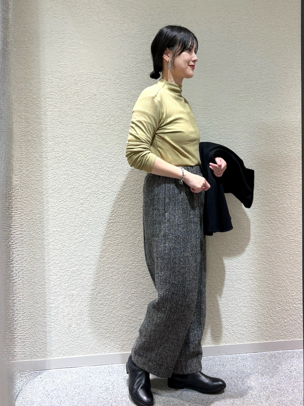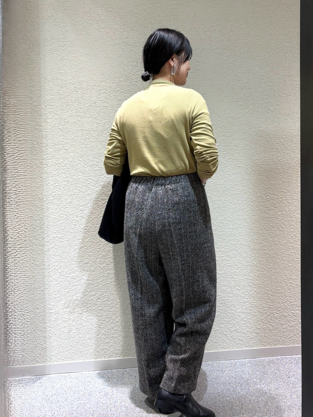 深みのあるグレーのツイードが季節感を演出。すっきりとしたシルエットで、上品ながらリラックス感も備えた一本。イエローのトップスを柔らかく馴染ませ、モノトーンのアウターとも自然につながるカラーリングです。