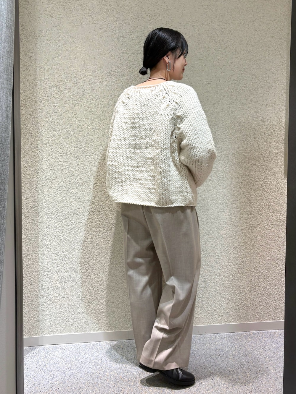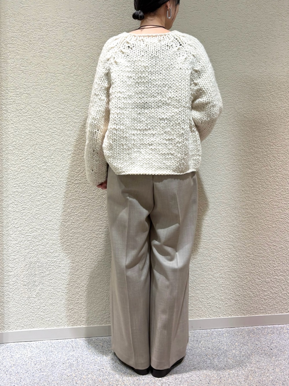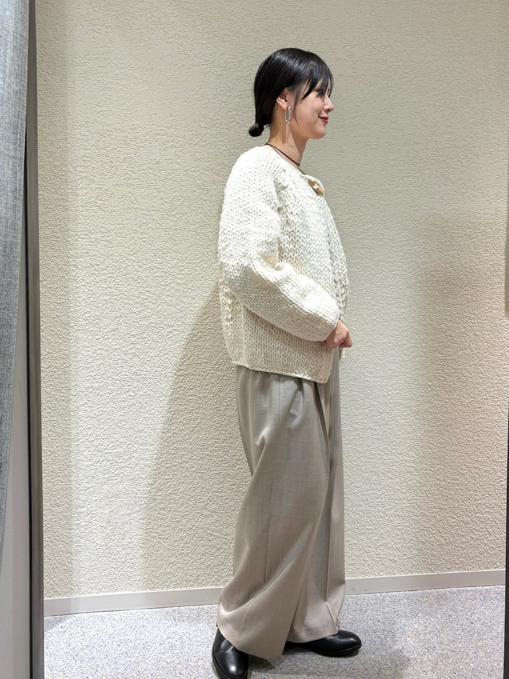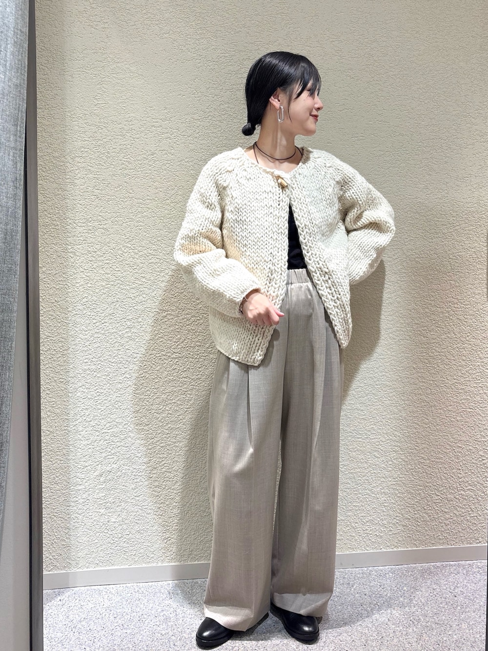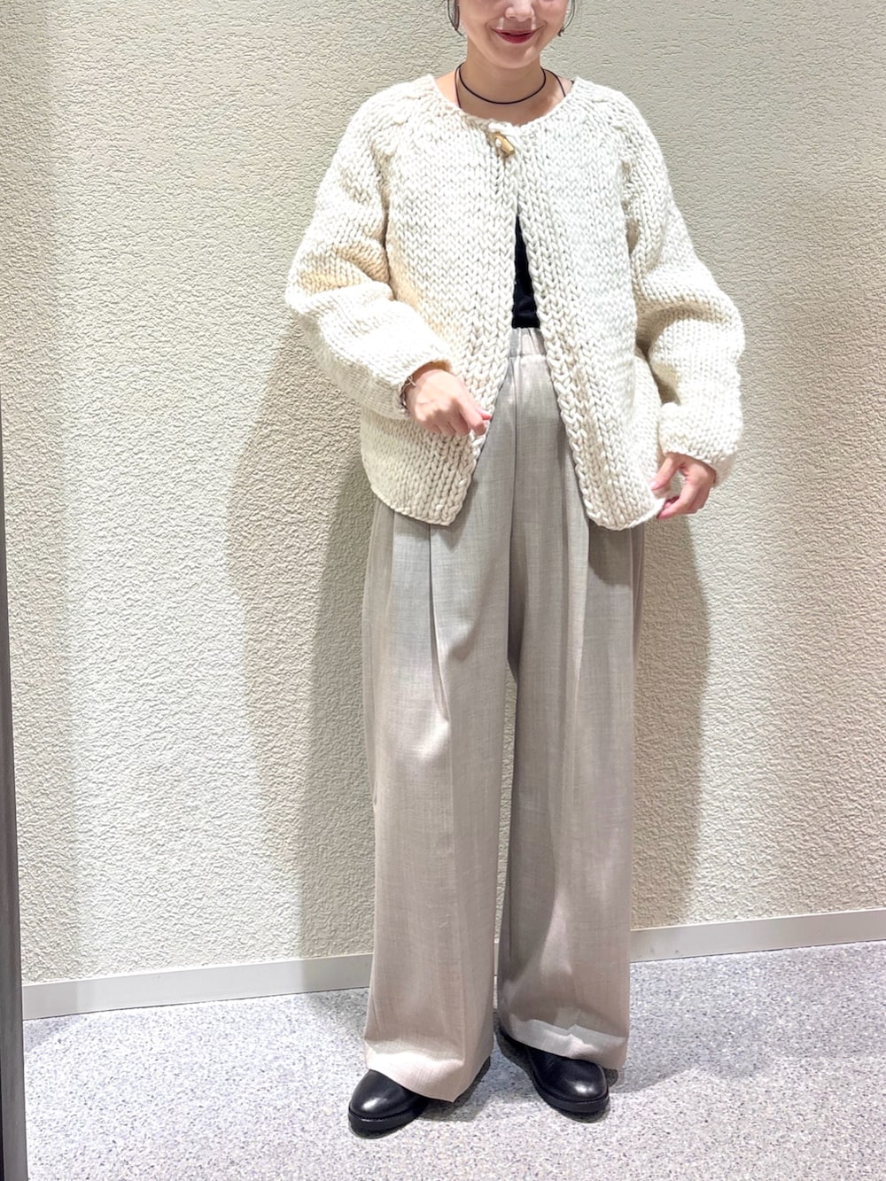 上品な落ち感と軽やかな穿き心地が魅力のウールツイルパンツ。イージー仕様でリラックス感がありながら、すっきりとしたシルエットで大人のカジュアルに馴染みます。アイボリーのカーディガンと合わせることで、やわらかく統一感のあるスタイルに。