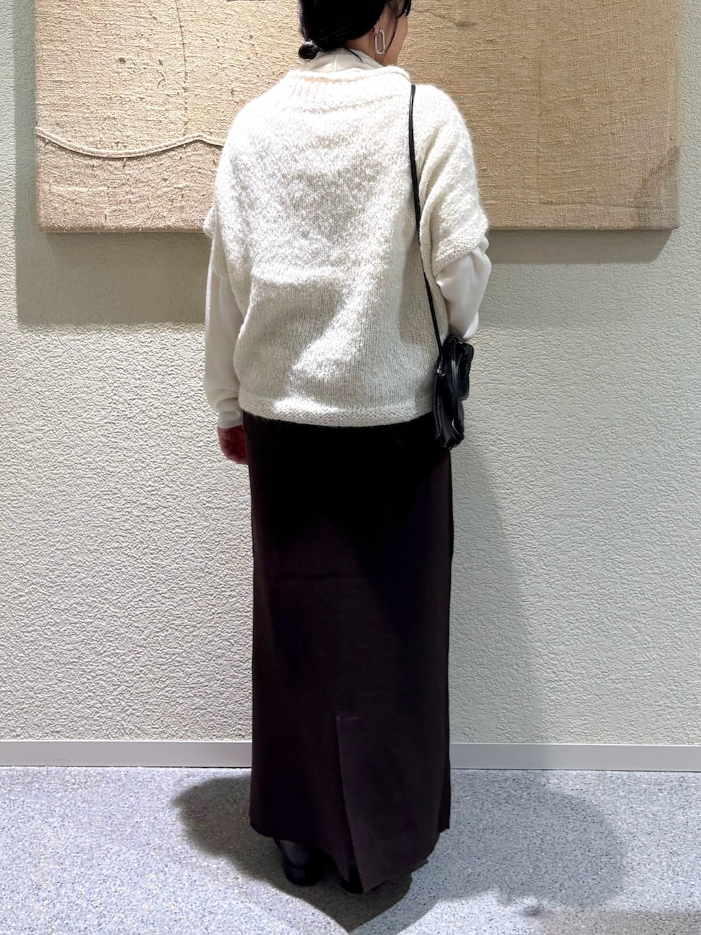 ふわりとしたアルパカ混素材が魅力のルーズベスト。ゆとりのあるシルエットでタートルに自然に重なり、奥行きのあるトーンコーデを楽しめます。アイボリー同士の重なりが柔らかく軽やかな印象に。